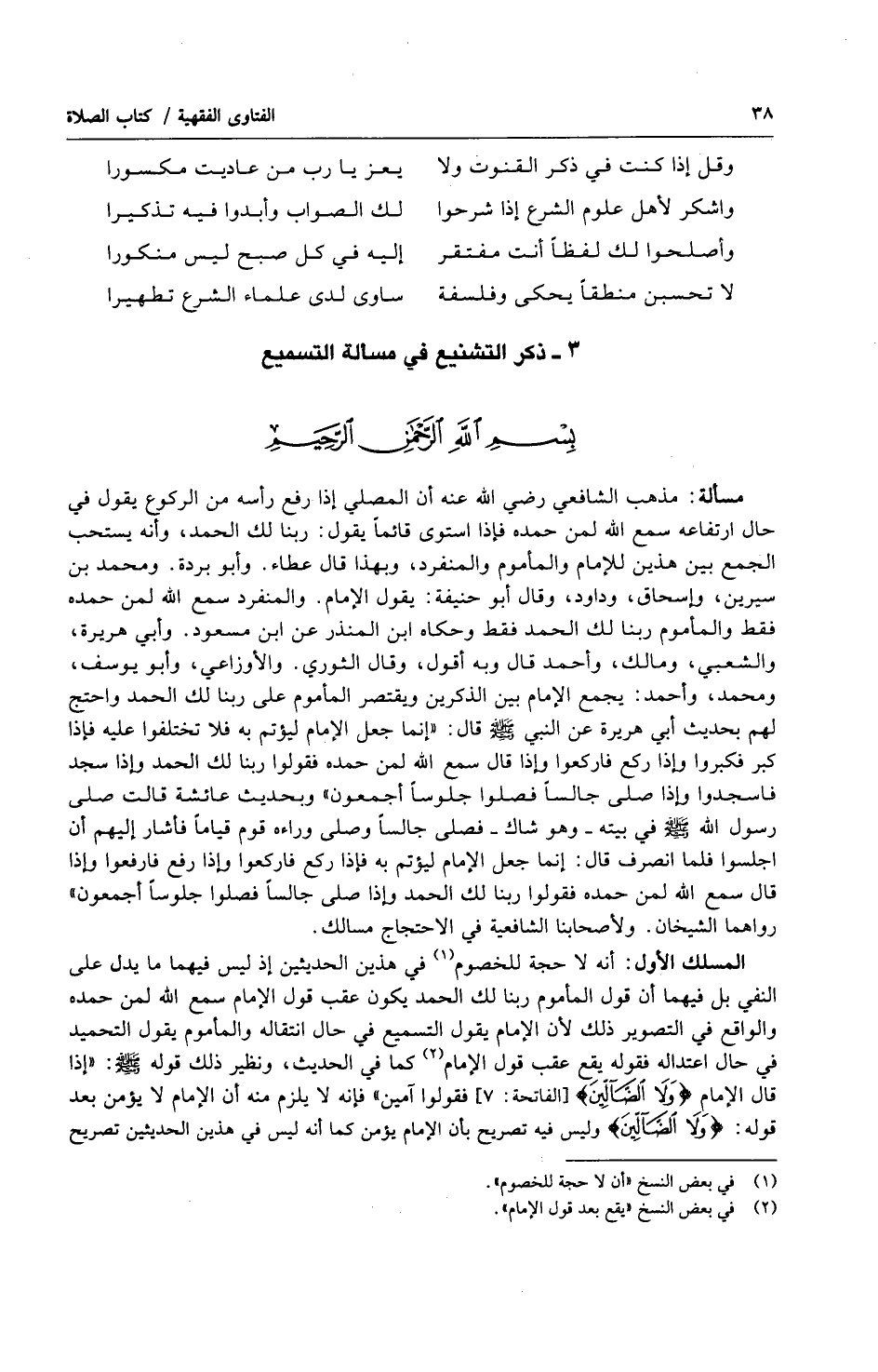 مسألة: مذهب الشافعي رضي الله عنه أن المصلي إذا رفع رأسه من الركوع يقول في حال ارتفاعه: سمع الله لمن حمده فإذا استوى قائماً يقول: ربنا لك الحمد، وأنه يستحب الجمع بين هذين للإمام والمأموم والمنفرد، وبهذا قال عطاء، وأبو بردة، ومحمد بن سيرين، وإسحق، وداود، وقال أبو حنيفة: يقول الإمام، والمنفرد: سمع الله لمن حمده فقط، والمأموم: ربنا لك الحمد فقط وحكاه ابن المنذر عن ابن مسعود، وأبي هريرة، والشعبي، ومالك، وأحمد قال وبه أقول؛ وقال الثوري؛ والأوزاعي، وأبو يوسف، ومحمد، وأحمد: يجمع الإمام بين الذكرين ويقتصر المأموم على ربنا لك الحمد، واحتج لهم بحديث أبي هريرة عن النبي صلى الله عليه وسلّم قال: (إنما جعل الإمام ليؤتم به فلا تختلفوا عليه فإذا كبر فكبروا وإذا ركع فاركعوا، وإذا قال سمع الله لمن حمده فقولوا ربنا لك الحمد، وإذا سجد فاسجدوا، وإذا صلى جالساً فصلوا جلوساً أجمعون) وبحديث عائشة قالت: (صلى رسول الله صلى الله عليه وسلّم في بيته وهو شاك فصلى جالساً وصلى وراءه قوم قياماً فأشار إليهم أن اجلسوا فلما انصرف قال: (إنما جعل الإمام ليؤتم به فإذا ركع فاركعوا، وإذا رفع فارفعوا وإذا قال سمع الله لمن حمده فقولوا ربنا لك الحمد، وإذا صلى جالساً فصلوا جلوساً أجمعون) رواهما الشيخان. ولأصحابنا الشافعية في الاحتجاج مسالك.