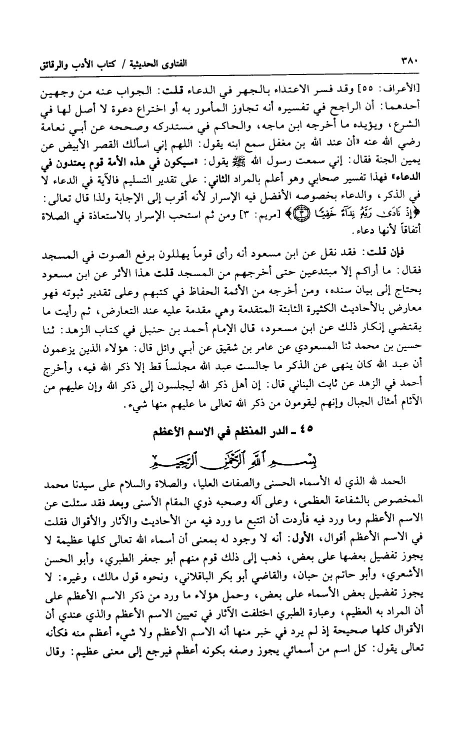 الحمد لله الذي له الأسماء الحسنى والصفات العليا، والصلاة والسلام على سيدنا محمد المخصوص بالشفاعة العظمى، وعلى آله وصحبه ذوي المقام الأسنى وبعد فقد سئلت عن الأسم الأعظم وما ورد فيه فأردت أن اتتبع ما ورد فيه من الأحاديث والآثار والأقوال فقلت في الأسم الأعظم أقوال، الأول: أنه لا وجود له بمعنى أن أسماء الله تعالى كلها عظيمة لا يجوز تفضيل بعضها على بعض، ذهب إلى ذلك قوم منهم أبو جعفر الطبري، وأبو الحسن الأشعري، وأبو حاتم بن حبان، والقاضي أبو بكر الباقلاني، ونحوه قول مالك، وغيره: لا يجوز تفضيل بعض الأسماء على بعض، وحمل هؤلاء ما ورد من ذكر الاسم الأعظم على أن المراد به العظم، وعبارة الطبري اختلفت الآثار في تعيين الأسم الأعظم والذي عندي أن الأقوال كلها صحيحة إذ لم يرد في خبر منها أنه الأسم الأعظم ولا شيء أعظم منه فكأنه تعالى يقول: كل اسم من أسمائي يجوز وصفه بكونه أعظم فيرجع إلى معنى عظيم: وقال