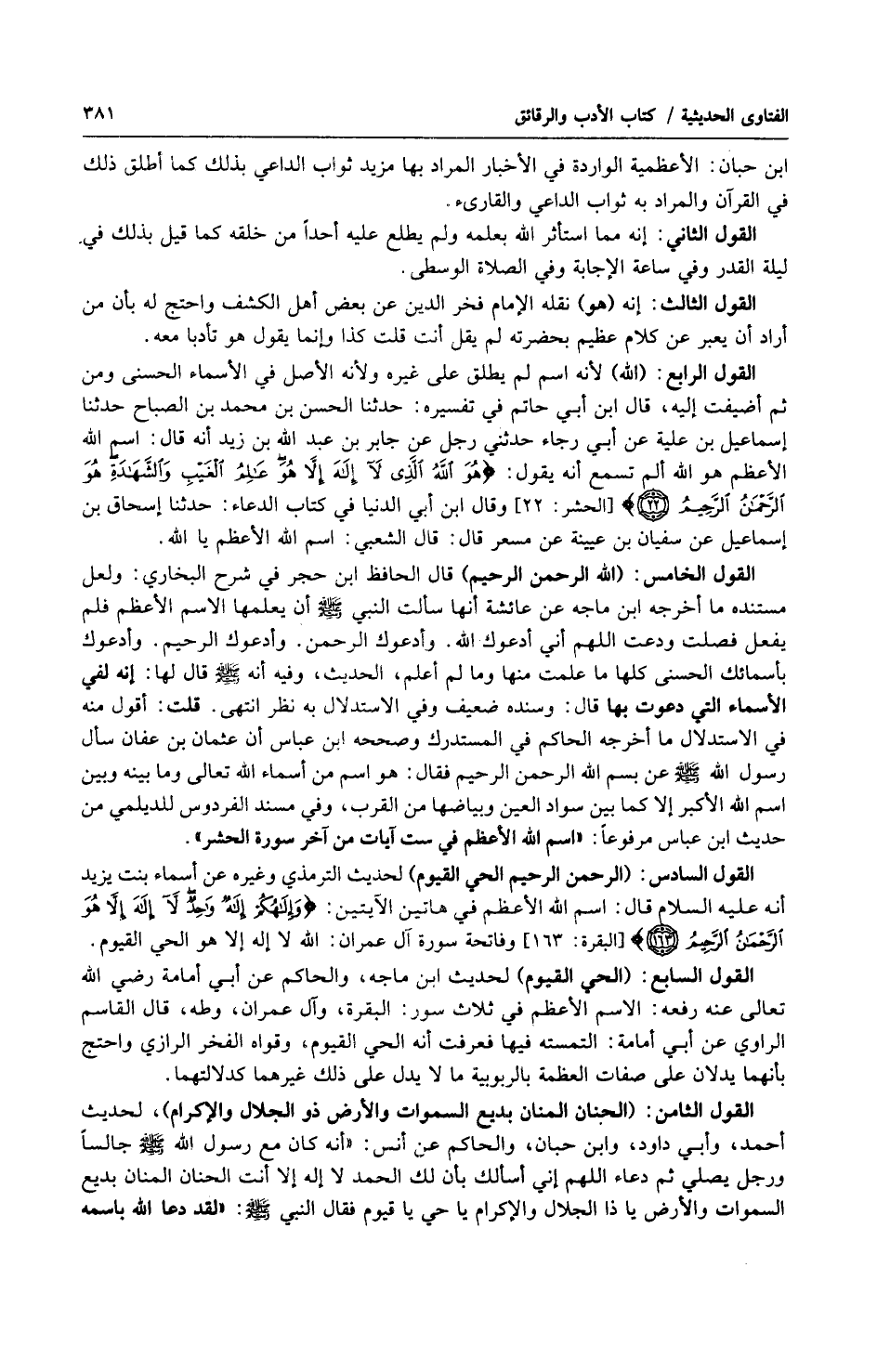 القول الخامس: (الرحمن الرحيم) قال الحافظ ابن حجر في شرح البخاري: ولعل مستنده ما أخرجه ابن ماجه عن عائشة أنها سألت النبي صلى الله عليه وسلّم أن يعلمها الاسم الأعظم فلم يفعل فصلت ودعت اللهم أني أدعوك الله. وأدعوك الرحمن. وأدعوك الرحيم. وأدعوك بأسمائك الحسنى كلها ما علمت منها وما لم أعلم، الحديث، وفيه أنه صلى الله عليه وسلّم قال لها: إنه لفي الأسماء التي دعوت بها قال: وسنده ضعيف وفي الاستدلال به نظر انتهى. قلت: أقول منه في الاستدلال ما أخرجه الحاكم في المستدرك وصححه ابن عباس أن عثمان بن عفان سأل رسول الله صلى الله عليه وسلّم عن بسم الله الرحمن الرحيم فقال: هو أسم من أسماء الله تعالى وما بينه وبين اسم الله الأكبر إلا كما بين سواد العين وبياضها من القرب، وفي مسند الفردوس للديلمي من حديث ابن عباس مرفوعاً: (اسم الله الأعظم في ست آيات من آخر سورة الحشر).