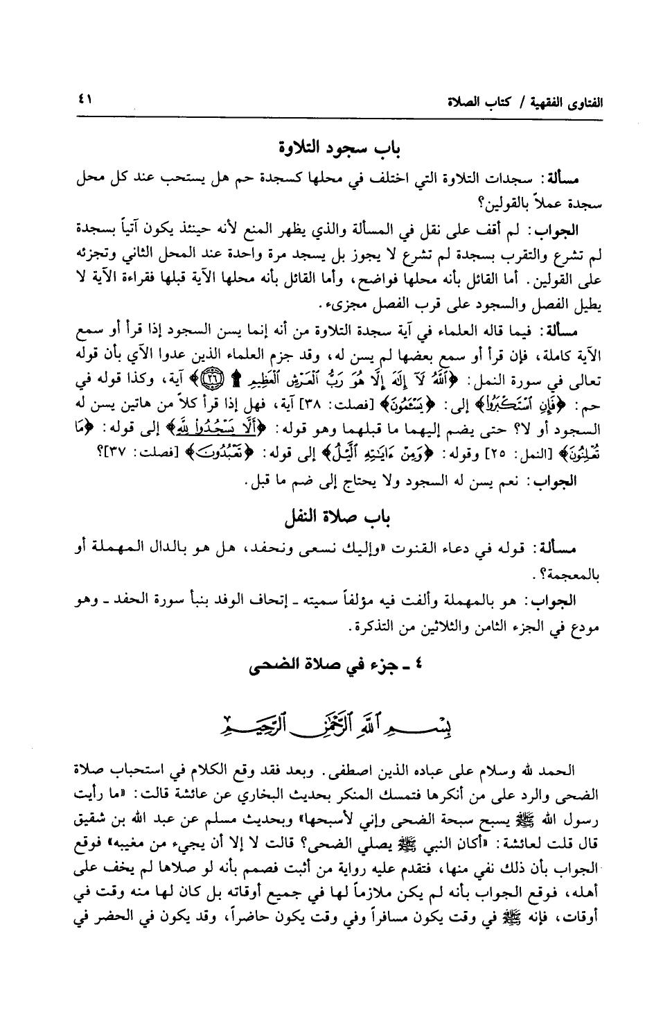 الحمد لله وسلام على عباده الذين اصطفى. وبعد فقد وقع الكلام في استحباب صلاة الضحى والرد على من أنكرها فتمسك المنكر بحديث البخاري عن عائشة قالت: (ما رأيت رسول الله صلى الله عليه وسلّم يسبح سبحة الضحى وإني لأسبحها) وبحديث مسلم عن عبد الله بن شقيق قال قلت لعائشة: (أكان النبي صلى الله عليه وسلّم يصلي الضحى؟ قالت لا إلا أن يجيء من مغيبه) فوقع الجواب بأن ذلك نفي منها، فتقدم عليه رواية من أثبت فصمم بأنه لو صلاها لم يخف على أهله، فوقع الجواب بأنه لم يكن ملازماً لها في جميع أوقاته بل كان لها منه وقت في أوقات، فإنه صلى الله عليه وسلّم في وقت يكون مسافراً وفي وقت يكون حاضراً، وقد يكون في الحضر