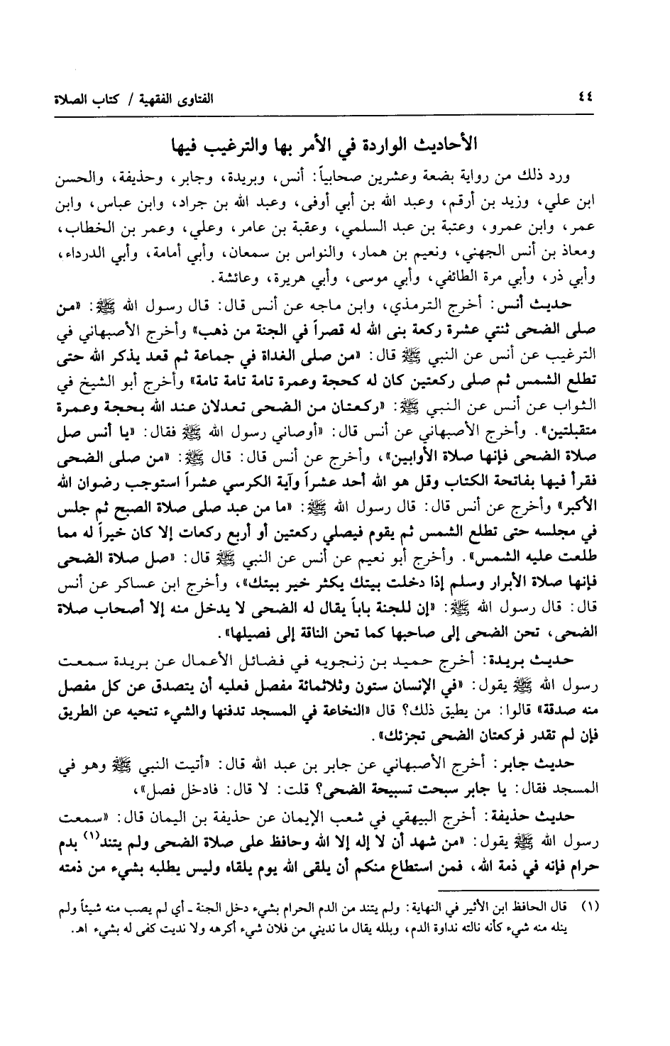 حديث أنس: أخرج الترمذي، وابن ماجه عن أنس قال: قال رسول الله صلى الله عليه وسلّم: (من صلى الضحى ثنتي عشرة ركعة بنى الله له قصراً في الجنة من ذهب) وأخرج الأصبهاني في الترغيب عن أنس عن النبي صلى الله عليه وسلّم قال: (من صلى الغداة في جماعة ثم قعد يذكر الله حتى تطلع الشمس ثم صلى ركعتين كان له كحجة وعمرة تامة تامة تامة) وأخرج أبو الشيخ في الثواب عن أنس عن النبي صلى الله عليه وسلّم: (ركعتان من الضحى تعدلان عند الله بحجة وعمرة متقبلتين). وأخرج الأصبهاني عن أنس قال: (أوصاني رسول الله صلى الله عليه وسلّم فقال: (يا أنس صل صلاة الضحى فإنها صلاة الأولين)، وأخرج عن أنس قال: قال صلى الله عليه وسلّم: (من صلى الضحى فقرأ فيها بفاتحة الكتاب وقل هو الله أحد عشراً وآية الكرسي عشراً استوجب رضوان الله الأكبر) وأخرج عن أنس قال: قال رسول الله صلى الله عليه وسلّم: (ما من عبد صلى صلاة الصبح ثم جلس في مجلسه حتى تطلع الشمس ثم يقوم فيصلي ركعتين أو أربع ركعات إلا كان خيراً له مما طلعت عليه الشمس). وأخرج أبو نعيم عن أنس عن النبي صلى الله عليه وسلّم قال: (صل صلاة الضحى فإنها صلاة الأبرار وسلم إذا دخلت بيتك يكثر خير بيتك)، وأخرج ابن عساكر عن أنس قال: قال رسول الله صلى الله عليه وسلّم: (أن للجنة باباً يقال له الضحى لا يدخل منه إلا أصحاب صلاة الضحى، تحن الضحى إلى صاحبها كما تحن الناقة إلى فصيلها).