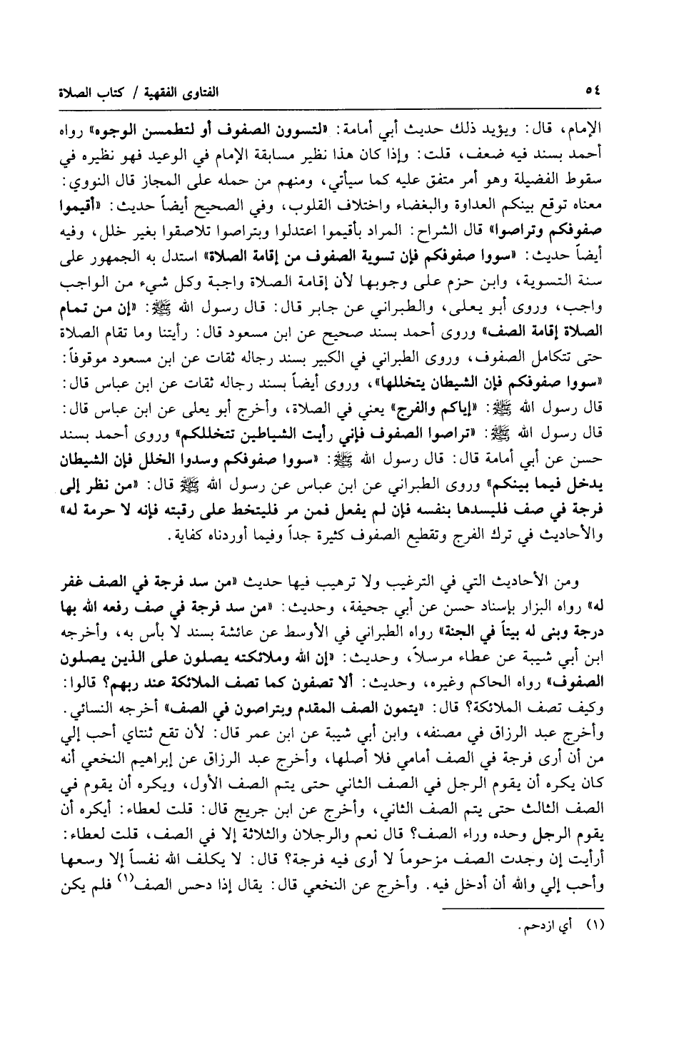 الإمام ، قال : ويؤيد ذلك حديث أبي أمامة : ( لتسوون الصفوف أو لتطمسن الوجوه ) رواه أحمد بسند فيه ضعف ، قلت : وإذا كان هذا نظير مسابقة الإمام في الوعيد فهو نظيره في سقوط الفضيلة وهو أمر متفق عليه كما سيأتي ، ومنهم من حمله على المجاز قال النووي : معناه توقع بينكم العداوة والبغضاء واختلاف القلوب ، وفي الصحيح أيضاً حديث : ( أقيموا صفوفكم وتراصوا ) قال الشراح : المراد بأقيموا اعتدلوا وبتراصوا تلاصقوا بغير خلل ، وفيه أيضاً حديث : ( سووا صفوفكم فإن تسوية الصفوف من إقامة الصلاة ) استدل به الجمهور على سنة التسوية ، وابن حزم على وجوبها لأن إقامة الصلاة واجبة وكل شيء من الواجب واجب ، وروى أبو يعلى ، والطبراني عن جابر قال : قال رسول الله صلى الله عليه وسلّم : ( إن من تمام الصلاة إقامة الصف ) وروى أحمد بسند صحيح عن ابن مسعود قال : رأيتنا وما تقام الصلاة حتى تتكامل الصفوف ، وروى الطبراني في الكبير بسند رجاله ثقات عن ابن مسعود موقوفاً : ( سووا صفوفكم فإن الشيطان يتخللها ) ، وروى أيضاً بسند رجاله ثقات عن ابن عباس قال : قال رسول الله صلى الله عليه وسلّم : ( إياكم والفرج ) يعني في الصلاة ، وأخرج أبو يعلى عن ابن عباس قال : قال رسول الله صلى الله عليه وسلّم : ( تراصوا الصفوف فإني رأيت الشياطين تتخللكم ) وروى أحمد بسند حسن عن أبي أمامة قال : قال رسول الله صلى الله عليه وسلّم : ( سووا صفوفكم وسدوا الخلل فإن الشيطان يدخل فيما بينكم ) وروى الطبراني عن ابن عباس عن رسول الله صلى الله عليه وسلّم قال : ( من نظر إلى فرجة في صف فليسدها بنفسه فإن لم يفعل فمن مر فليتخط على رقبته فإنه لا حرمة له ) والأحاديث في ترك الفرج وتقطيع الصفوف كثيرة جداً وفيما أوردناه كفاية.