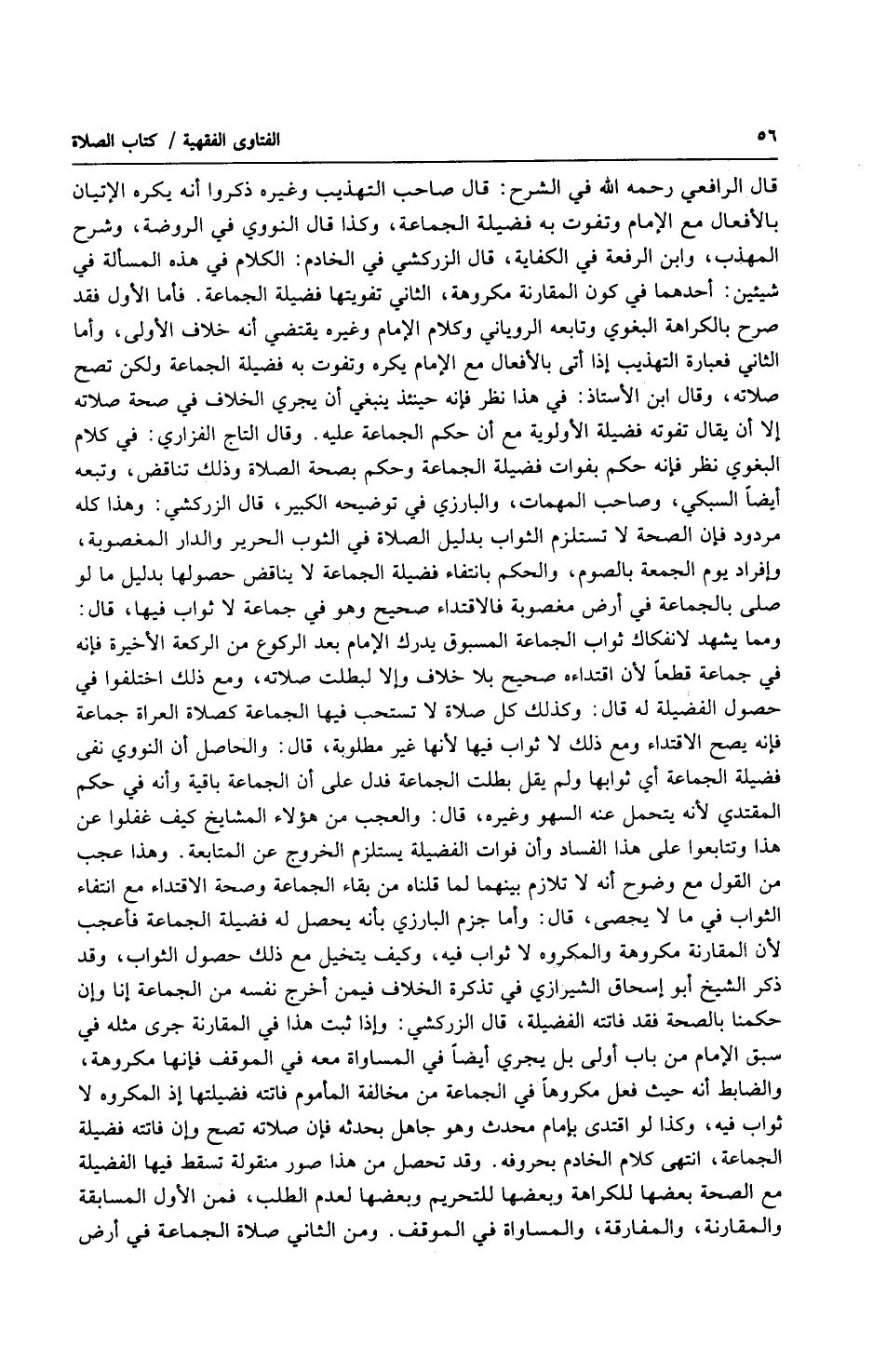 قال الرافعي رحمه الله في الشرح: قال صاحب التهذيب وغيره ذكروا أنه يكره الإتيان بالأفعال مع الإمام وتفوت به فضيلة الجماعة، وكذا قال النووي في الروضة، وشرح المهذب، وابن الرفعة في الكفاية، قال الزركشي في الخادم: الكلام في هذه المسألة في شيئين: أحدهما في كون المقارنة مكروهة، الثاني تفويتها فضيلة الجماعة. فأما الأول فقد صرح بالكراهة البغوي وتابعه الروياني وكلام الإمام وغيره يقتضي أنه خلاف الأولى، وأما الثاني فعبارة التهذيب إذا أتى بالأفعال مع الإمام يكره وتفوت به فضيلة الجماعة ولكن تصح صلاته، وقال ابن الأستاذ: في هذا نظر فإنه حينئذ ينبغي أن يجري الخلاف في صحة صلاته إلا أن يقال تفوته فضيلة الأولوية مع أن حكم الجماعة عليه. وقال التاج الفزاري: في كلام البغوي نظر فإنه حكم بفوات فضيلة الجماعة وحكم بصحة الصلاة وذلك تناقض، وتبعه أيضاً السبكي، وصاحب المهمات، والبارزي في توضيحه الكبير، قال الزركشي: وهذا كله مردود فإن الصحة لا تستلزم الثواب بدليل الصلاة في الثوب الحرير والدار المغصوبة، وإفراد يوم الجمعة بالصوم، والحكم بانتفاء فضيلة الجماعة لا يناقض حصولها بدليل ما لو صلى بالجماعة في أرض مغصوبة فالاقتداء صحيح وهو في جماعة لا ثواب فيها، قال: ومما يشهد لانفكاك ثواب الجماعة المسبوق يدرك الإمام بعد الركوع من الركعة الأخيرة فإنه في جماعة قطعاً لأن اقتداءه صحيح بلا خلاف وإلا لبطلت صلاته، ومع ذلك اختلفوا في حصول الفضيلة له قال: وكذلك كل صلاة لا تستحب فيها الجماعة كصلاة العراة جماعة فإنه يصح الاقتداء ومع ذلك لا ثواب فيها لأنها غير مطلوبة، قال: والحاصل أن النووي نفي فضيلة الجماعة أي ثوابها ولم يقل بطلت الجماعة فدل على أن الجماعة باقية وأنه في حكم المقتدي لأنه يتحمل عنه السهو وغيره، قال: والعجب من هؤلاء المشايخ كيف غفلوا عن هذا وتتابعوا على هذا الفساد وأن فوات الفضيلة يستلزم الخروج عن المتابعة. وهذا عجب من القول مع وضوح أنه لا تلازم بينهما لما قلناه من بقاء الجماعة وصحة الاقتداء مع انتفاء الثواب في ما لا يحصى، قال: وأما جزم البارزي بأنه يحصل له فضيلة الجماعة فأعجب لأن المقارنة مكروهة والمكروه لا ثواب فيه، وكيف يتخيل مع ذلك حصول الثواب، وقد ذكر الشيخ أبو إسحاق الشيرازي في تذكرة الخلاف فيمن أخرج نفسه من الجماعة إنا وإن حكمنا بالصحة فقد فاتته الفضيلة، قال الزركشي: وإذا ثبت هذا في المقارنة جرى مثله في سبق الإمام من باب أولى بل يجري أيضاً في المساواة معه في الموقف فإنها مكروهة، والضابط أنه حيث فعل مكروهاً في الجماعة من مخالفة المأموم فاتته فضيلتها إذ المكروه لا ثواب فيه، وكذا لو اقتدى بإمام محدث وهو جاهل بحدثه فإن صلاته تصح وإن فاتته فضيلة الجماعة، انتهى كلام الخادم بحروفه. وقد تحصل من هذا صور منقولة تسقط فيها الفضيلة مع الصحة بعضها للكراهة وبعضها للتحريم وبعضها لعدم الطلب، فمن الأول المسابقة والمقارنة، والمفارقة، والمساواة في الموقف. ومن الثاني صلاة الجماعة في أرض