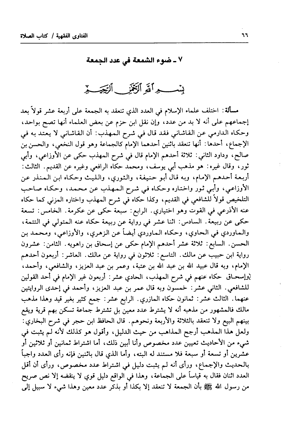 مسألة: اختلف علماء الإسلام في العدد الذي تنعقد به الجمعة على أربعة عشر قولاً بعد إجماعهم على أنه لا بد من عدد، وإن نقل ابن حزم عن بعض العلماء أنها تصح بواحد، وحكاه الدارمي عن القاشاني فقد قال في شرح المهذب: أن القاشاني لا يعتد به في الإجماع، أحدها: أنها تنعقد باثنين أحدهما الإمام كالجماعة وهو قول النخعي، والحسن بن صالح، وداود الثاني: ثلاثة أحدهم الإمام قال في شرح المهذب حكى عن الأوزاعي، وأبي ثور، وقال غيره: هو مذهب أبي يوسف، ومحمد حكاه الرافعي وغيره عن القديم. الثالث: أربعة أحدهم الإمام، وبه قال أبو حنيفة، والثوري، والليث وحكاه ابن المنذر عن الأوزاعي، وأبي ثور واختاره وحكاه في شرح المهذب عن محمد، وحكاه صاحب التلخيص قولاً للشافعي في القديم، وكذا حكاه في شرح المهذب واختاره المزني كما حكاه عنه الأذرعي في القوت وهو اختياري. الرابع: سبعة حكى عن عكرمة. الخامس: تسعة حكى عن ربيعة. السادس: إثنا عشر في رواية عن ربيعة حكاه عنه المتولي في التتمة، والماوردي في الحاوي، وحكاه الماوردي أيضاً عن الزهري، والأوزاعي، ومحمد بن الحسن. السابع: ثلاثة عشر أحدهم الإمام حكى عن إسحاق بن راهويه. الثامن: عشرون رواية ابن حبيب عن مالك. التاسع: ثلاثون في رواية عن مالك. العاشر: أربعون أحدهم الإمام، وبه قال عبيد الله بن عبد الله بن عتبة، وعمر بن عبد العزيز، والشافعي، وأحمد، وإسحق حكاه عنهم في شرح المهذب، الحادي عشر: أربعون غير الإمام في أحد القولين للشافعي. الثاني عشر: خمسون وبه قال عمر بن عبد العزيز، وأحمد في إحدى الروايتين عنهما. الثالث عشر: ثمانون حكاه المازري. الرابع عشر: جمع كثير بغير قيد وهذا مذهب مالك فالمشهور من مذهبه أنه لا يشترط عدد معين بل تشترط جماعة تسكن بهم قرية ويقع بينهم البيع ولا تنعقد بالثلاثة والأربعة ونحوهم. قال الحافظ ابن حجر في شرح البخاري: ولعل هذا المذهب أرجح المذاهب من حيث الدليل، وأقول هو كذلك لأنه لم يثبت في شيء من الأحاديث تعيين عدد مخصوص وأنا أبين ذلك، وأما اشتراط ثمانين أو ثلاثين أو عشرين أو تسعة أو سبعة فلا مستند له البته، وأما الذي قال باثنين فإنه رأى العدد واجباً بالحديث والإجماع، ورأى أنه لم يثبت دليل في اشتراط عدد مخصوص، ورأى أن أقل العدد اثنان فقال به قياساً على الجماعة، وهذا في الواقع دليل قوي لا ينقضه إلا نص صريح من رسول الله صلى الله عليه وسلّم بأن الجمعة لا تنعقد إلا بكذا أو بذكر عدد معين وهذا شيء لا سبيل إلى