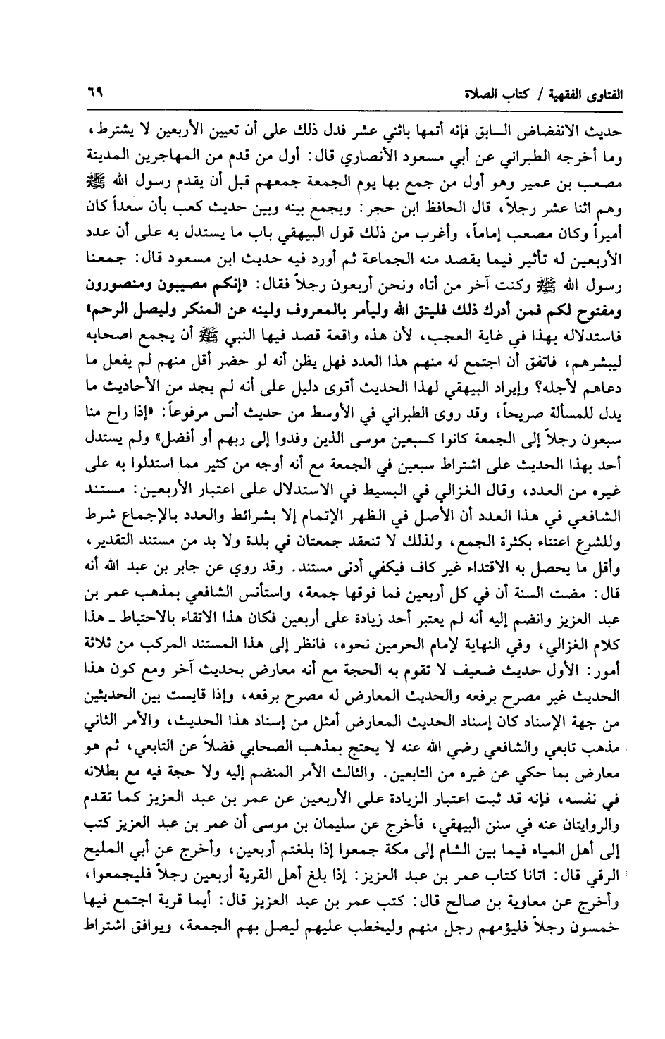 حديث الانفضاض السابق فإنه أتمها باثني عشر فدل ذلك على أن تعيين الأربعين لا يشترط، وما أخرجه الطبراني عن أبي مسعود الأنصاري قال: أول من قدم من المهاجرين المدينة مصعب بن عمير وهو أول من جمع بها يوم الجمعة جمعهم قبل أن يقدم رسول الله صلى الله عليه وسلّم وهم اثنا عشر رجلاً، قال الحافظ ابن حجر: ويجمع بينه وبين حديث كعب بأن سعداً كان أميراً وكان مصعب إماماً، وأغرب من ذلك قول البيهقي باب ما يستدل به على أن عدد الأربعين له تأثير فيما يقصد منه الجماعة ثم أورد فيه حديث ابن مسعود قال: جمعنا رسول الله صلى الله عليه وسلّم وكنت آخر من أتاه ونحن أربعون رجلاً فقال: (إنكم مصيبون ومنصورون ومفتوح لكم فمن أدرك ذلك فليتق الله وليأمر بالمعروف ولينه عن المنكر وليصل الرحم) فاستدلاله بهذا في غاية العجب، لأن هذه واقعة قصد فيها النبي صلى الله عليه وسلّم أن يجمع اصحابه ليبشرهم، فاتفق أن اجتمع له منهم هذا العدد فهل يظن أنه لو حضر أقل منهم لم يفعل ما دعاهم لأجله؟ وإيراد البيهقي لهذا الحديث أقوى دليل على أنه لم يجد من الأحاديث ما يدل للمسألة صريحاً، وقد روى الطبراني في الأوسط من حديث أنس مرفوعاً: (إذا راح منا سبعون رجلاً إلى الجمعة كانوا كسبعين موسى الذين وفدوا إلى ربهم أو أفضل) ولم يستدل أحد بهذا الحديث على اشتراط سبعين في الجمعة مع أنه أوجه من كثير مما استدلوا به على غيره من العدد، وقال الغزالي في البسيط في الاستدلال على اعتبار الأربعين: مستند الشافعي في هذا العدد أن الأصل في الظهر الإتمام إلا بشرائط والعدد بالإجماع شرط وللشرع اعتناء بكثرة الجمع، ولذلك لا تنعقد جمعتان في بلدة ولا بد من مستند التقدير، وأقل ما يحصل به الاقتداء غير كاف فيكفي أدنى مستند. وقد روى عن جابر بن عبد الله أنه قال: مضت السنة أن في كل أربعين فما فوقها جمعة، واستأنس الشافعي بمذهب عمر بن عبد العزيز وانضم إليه أنه لم يعتبر أحد زيادة على أربعين فكان هذا الاتقاء بالاحتياط هذا كلام الغزالي، وفي النهاية لإمام الحرمين نحوه، فانظر إلى هذا المستند المركب من ثلاثة أمور: الأول حديث ضعيف لا تقوم به الحجة مع أنه معارض بحديث آخر ومع كون هذا الحديث غير مصرح برفعه والحديث المعارض له مصرح برفعه، وإذا قايست بين الحديثين من جهة الإسناد كان إسناد الحديث المعارض أمثل من إسناد هذا الحديث، والأمر الثاني مذهب تابعي والشافعي رضي الله عنه لايحتج بمذهب الصحابي فضلاً عن التابعي، ثم هو معارض مما حكى عن غيره من التابعين. والثالث الأمر المنضم إليه ولا حجة فيه مع بطلانه في نفسه، فإنه قد ثبت اعتبار الزيادة على الأربعين عن عمر بن عبد العزيز كما تقدم والروايتان عنه في سنن البيهقي، فأخرج عن سليمان بن موسى أن عمر بن عبد العزيز كتب إلى أهل المياه فيما بين الشام إلى مكة جمعوا إذا بلغتم أربعين، وأخرج عن أبي المليح الرقي قال: اتانا كتاب عمر بن عبد العزيز: إذا بلغ أهل القرية أربعين رجلاً فليجمعوا، وأخرج عن معاوية بن صالح قال: كتب عمر بن عبد العزيز قال: أيما قرية اجتمع فيها خمسون رجلاً فليؤمهم رجل منهم وليخطب عليهم ليصل بهم الجمعة، ويوافق اشتراط