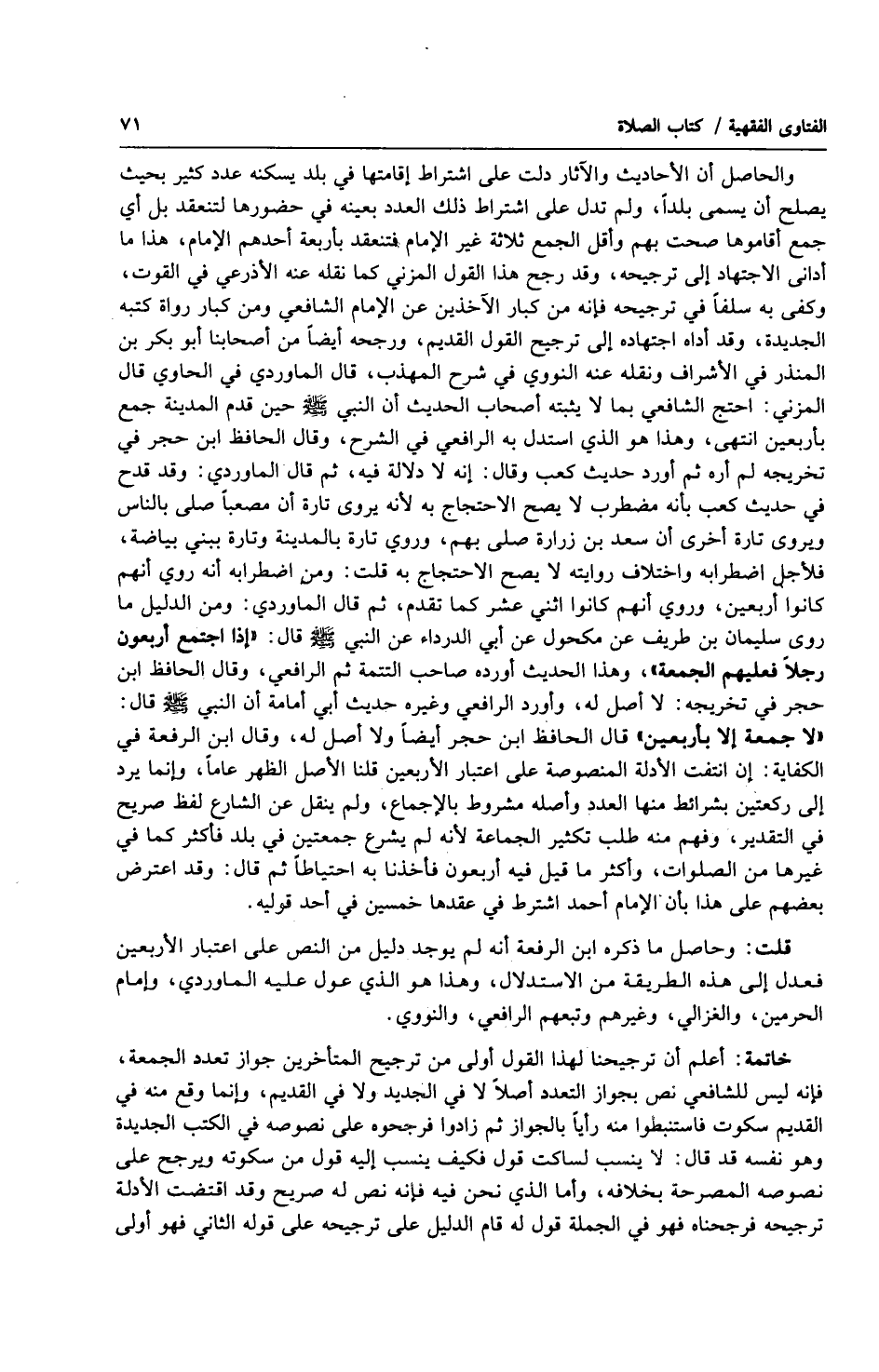 والحاصل أن الأحاديث والآثار دلت على اشتراط إقامتها في بلد يسكنه عدد كثير بحيث يصلح أن يسمى بلداً ، ولم تدل على اشتراط ذلك العدد بعينه في حضورها لتنعقد بل أي جمع أقاموها صحت بهم وأقل الجمع ثلاثة غير الإمام فتنعقد بأربعة أحدهم الإمام ، هذا ما أداني الاجتهاد إلى ترجيحه ، وقد رجح هذا القول المزني كما نقله عنه الأذرعي في القوت ، وكفى به سلفاً في ترجيحه فإنه من كبار الآخذين عن الإمام الشافعي ومن كبار رواة كتبه الجديدة ، وقد أداه اجتهاده إلى ترجيح القول القديم ، ورجحه أيضاً من أصحابنا أبو بكر بن المنذر في الأشراف ونقله عنه النووي في شرح المهذب ، قال الماوردي في الحاوي قال المزني : احتج الشافعي بما لا يثبته أصحاب الحديث أن النبي صلى الله عليه وسلّم حين قدم المدينة جمع بأربعين انتهى ، وهذا هو الذي استدل إنه لا دلالة فيه ، ثم قال الماوردي : وقد قدح في حديث كعب بأنه مضطرب لا يصح الاحتجاج به لأنه يروي تارة أن مصعباً صلى بالناس ويروى تارة أخرى أن سعد بن زرارة صلى بهم ، وروى تارة بالمدينة وتارة ببني بياضة ، فلأجل اضطرابه وإختلاف روايته لا يصح الاحتجاج به قلت : ومن اضطرابه أنه روى أنهم كانوا أربعين ، وروى أنهم كانوا اثني عشر كما تقدم ، ثم قال الماوردي : ومن الدليل ما روى سليمان بن طريف عن مكحول عن أبي الدرداء عن النبي صلى الله عليه وسلّم قال : إذا اجتمع أربعون رجلاً فعليهم الجمعة ، وهذا الحديث أورده صاحب التتمة ثم الرافعي ، وقال الحافظ ابن حجر في تخريجه : لا أصل له ، وأورد الرافعي وغيره حديث أبي أمامة أن النبي صلى الله عليه وسلّم قال : ( لا جمعة إلا بأربعين ) قال الحافظ ابن حجر أيضاً ولا أصل له ، وقال ابن الرفعة في الكفاية : إن انتفت الأدلة المنصوصة على اعتبار الأربعين قلنا الأصل الظهر عاماً ، وإنما يرد إلى ركعتين بشرائط منها العدد وأصله مشروط بالإجماع ، ولم ينقل عن الشارع لفظ صريح في التقدير ، وفهم منه طلب تكثير الجماعة لأنه لم يشرع جمعتين في بلد فأكثر كما في غيرها من الصلوات ، وأكثر ما قيل فيه أربعون فأخذنا به احتياطاً ثم قال : وقد اعترض بعضهم على هذا بأن الإمام أحمد اشترط في عقدها خمسين في أحد قوليه.