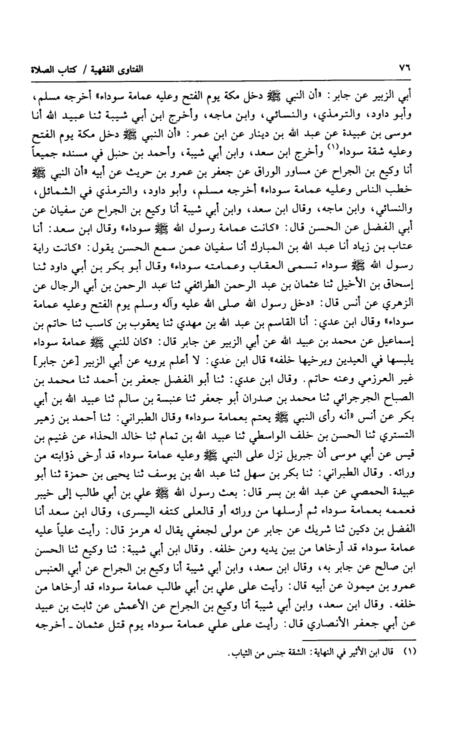 أبي الزبير عن جابر : ( أن النبي صلى الله عليه وسلّم دخل مكة يوم الفتح وعليه عمامة سوداء ) أخرجه مسلم ، وأبو داود ، والترمذي ، والنسائي ، وابن ماجه ، وأخرج ابن أبي شيبة ثنا عبيد الله أنا موسى ابن عبيدة عن عبد الله بن دينار عن ابن عمر : ( أن النبي صلى الله عليه وسلّم دخل مكة يوم الفتح وعليه شقة سوداء وأخرج ابن سعد ، وابن أبي شيبة ، وأحمد بن حنبل في مسنده جميعاً أنا وكيع بن الجراح عن مساور الوراق عن جعفر بن عمرو بن حريث عن أبيه ( أن النبي صلى الله عليه وسلّم خطب الناس وعليه عمامة سوداء ) أخرجه مسلم ، وأبو داود ، والترمذي في الشمائل ، والنسائي ، وابن ماجه ، وقال ابن سعد ، وابن أبي شيبة أنا وكيع بن الجراح عن سفيان عن أبي الفضل عن الحسن قال : ( كانت عمامة رسول الله صلى الله عليه وسلّم سوداء ) وقال ابن سعد : أنا عتاب بن زياد أنا عبد الله بن المبارك أنا سفيان عمن سمع الحسن يقول : ( كانت راية رسول الله صلى الله عليه وسلّم سوداء تسمى العقاب وعمامته سوداء ) وقال أبو بكر بن أبي داود ثنا إسحاق بن الأخيل ثنا عثمان بن عبد الرحمن الطرائفي ثنا عبد الرحمن بن أبي الرجال عن الزهري عن أنس قال : ( دخل رسول الله صلى الله عليه وآله وسلم يوم الفتح وعليه عمامة سوداء ) وقال ابن عدي : أنا القاسم بن عبد الله بن مهدي ثنا يعقوب بن كاسب ثنا حاتم بن إسماعيل عن محمد بن عبيد الله عن أبي الزبير عن جابر قال : ( كان للنبي صلى الله عليه وسلّم عمامة سوداء يلبسها في العيدين ويرخيها خلفه ) قال ابن عدي : لا أعلم يرويه عن أبي الزبير [ عن جابر ] غير العرزمي وعنه حاتم. وقال ابن عدي : ثنا أبو الفضل جعفر بن أحمد ثنا محمد بن الصباح الجرجرائي ثنا محمد بن صدران أبو جعفر ثنا عنبسة بن سالم ثنا عبيد الله بن أبي بكر عن أنس ( أنه رأى النبي صلى الله عليه وسلّم يعتم بعمامة سوداء ) وقال الطبراني : ثنا أحمد بن زهير التستري ثنا الحسن بن خلف الواسطي ثنا عبيد الله بن تمام ثنا خالد الحذاء عن غنيم بن قيس عن أبي موسى أن جبريل نزل على النبي صلى الله عليه وسلّم وعليه عمامة سوداء قد أرخى ذؤابته من ورائه. وقال الطبراني : ثنا بكر بن سهل ثنا عبد الله بن يوسف ثنا يحيى بن حمزة ثنا أبو عبيدة الحمصي عن عبد الله بن بسر قال : بعث رسول الله صلى الله عليه وسلّم علي بن أبي طالب إلى خيبر فعممه بعمامة سوداء ثم أرسلها من ورائه أو قالعلى كتفه اليسرى ، وقال ابن سعد أنا الفضل بن دكين ثنا شريك عن جابر عن مولى لجعفي يقال له هرمز قال : رأيت علياً عليه عمامة سوداء قد أرخاها من بين يديه ومن خلفه. وقال ابن أبي شيبة : ثنا وكيع ثنا الحسن ابن صالح عن جابر به ، وقال ابن سعد ، وابن أبي شيبة أنا وكيع بن الجراح عن أبي العنبس عمرو بن ميمون عن أبيه قال : رأيت على علي بن أبي طالب عمامة سوداء قد أرخاهامن خلفه. وقال ابن سعد ، وابن أبي شيبة أنا وكيع بن الجراح عن الأعمش عن ثابت بن عبيد عن أبي جعفر الأنصاري قال : رأيت على علي عمامة سوداء يوم قتل عثمان أخرجه