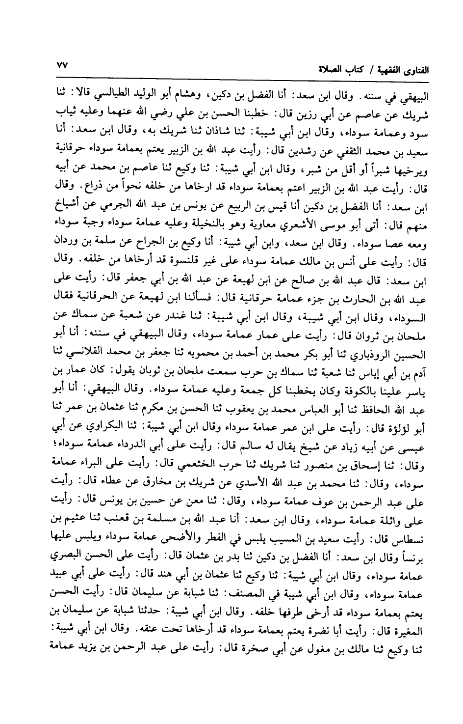 البيهقي في سننه. وقال ابن سعد: أنا الفضل بن دكين، وهشام أبو الوليد الطيالسي قالا: ثنا شريك عن عاصم عن أبي رزين قال: خطبنا الحسن بن علي رضي الله عنهما وعليه ثياب سود وعمامة سوداء، وقال ابن أبي شيبة: ثنا شاذان ثنا شريك به، وقال ابن سعد: أنا سعيد بن محمد الثقفي عن رشدين قال: رأيت عبد الله بن الزبير يعتم بعمامة سوداء حرقانية ويرخيها شبراً أو أقل من شبر، وقال ابن أبي شيبة: ثنا وكيع ثنا عاصم بن محمد عن أبيه قال: رأيت عبد الله بن الزبير اعتم بعمامة سوداء قد ارخاها من خلفه نحواً من ذراع. وقال ابن سعد: أنا الفضل بن دكين أنا قيس بن الربيع عن يونس بن عبد الله الجرمي عن أشياخ منهم قال: أتى أبو موسى الأشعري معاوية وهو بالنخيلة وعليه عمامة سوداء وجبة سوداء ومعه عصا سوداء. وقال ابن سعد، وابن أبي شيبة: أنا وكيع ابن الجراح عن سلمة بن وردان قال: رأيت على أنس بن مالك عمامة سوداء على غير قلنسوة قد أرخاها من خلفه. وقال ابن سعد: قال عبد الله بن صالح عن ابن لهيعة عن عبد الله بن أبي جعفر قال: رأيت على عبد الله بن الحارث بن جزء عمامة حرقانية قال: فسألنا ابن لهيعة عن الحرقانية فقال السوداء، وقال ابن أبي شيبة، وقال ابن أبي شيبة: ثنا غندر عن شعبة عن سماك عن ملحان بن ثروان قال: رأيت على عمار عمامة سوداء، وقال البيهقي في سننه: أنا أبو الحسين الروذباري ثنا أبو بكر محمد بن أحمد بن محمويه ثنا جعفر بن محمد القلانسي ثنا آدم بن أبي إياس ثنا شعبة ثنا سماك بن حرب سمعت ملحان بن ثوبان يقول: كان عمار بن ياسر علينا بالكوفة وكان يخطبنا كل جمعة وعليه عمامة سوداء. وقال البيهقي: أنا أبو عبد الله الحافظ ثنا أبو العباس محمد بن يعقوب ثنا الحسن بن مكرم ثنا عثمان بن عمر ثنا أبو لؤلؤة قال: رأيت على ابن عمر عمامة سوداء وقال ابن أبي شيبة: ثنا البكراوي عن أبي عيسى عن أبيه زياد عن شيخ يقال له سالم قال: رأيت على أبي الدرداء عمامه يوداء؛ وقال: ثنا إسحاق بن منصور ثنا شريك ثنا حرب الخثعمي قال: رأيت على البراء عمامة سوداء، وقال: ثنا محمد بن عبد الله الأسدي عن شريك بن مخارق عن عطاء قال: رأيت على عبد الرحمن بن عوف عمامة سوداء، وقال: ثنا معن عن حسين بن يونس قال: رأيت على واثلة عمامة سوداء، وقال ابن سعد: أنا عبد الله بن مسلمة بن قعنب ثنا عثيم بن نسطاس قال: رأيت سعيد بن المسيب يلبس في الفطر والأضحى عمامة سوداء ويلبس عليها برنساً وقال ابن سعد: أنا الفضل بن دكين ثنا بدر بن عثمان قال: رأيت على الحسن البصري عمامة سوداء، وقال ابن أبي شيبة: ثنا وكيع ثنا عثمان بن أبي هند قال: رأيت على أبي عبيد عمامة سوداء، وقال ابن أبي شيبة في المصنف: ثنا شبابة عن سليمان قال: رأيت الحسن يعتم بعمامة سوداء قد أرخى طرفها خلفه. وقال ابن إبي شيبة: حدثنا شبابة عن سليمان بن المغيرة قال: رأيت أبا نضرة يعتم بعمامة سوداء قد أرخاها تحت عنقه. وقال ابن أبي شيبة: ثنا وكيع ثنا مالك بن مغول عن أبي صخرة قال: رأيت على عبد الرحمن بن يزيد عمامة
