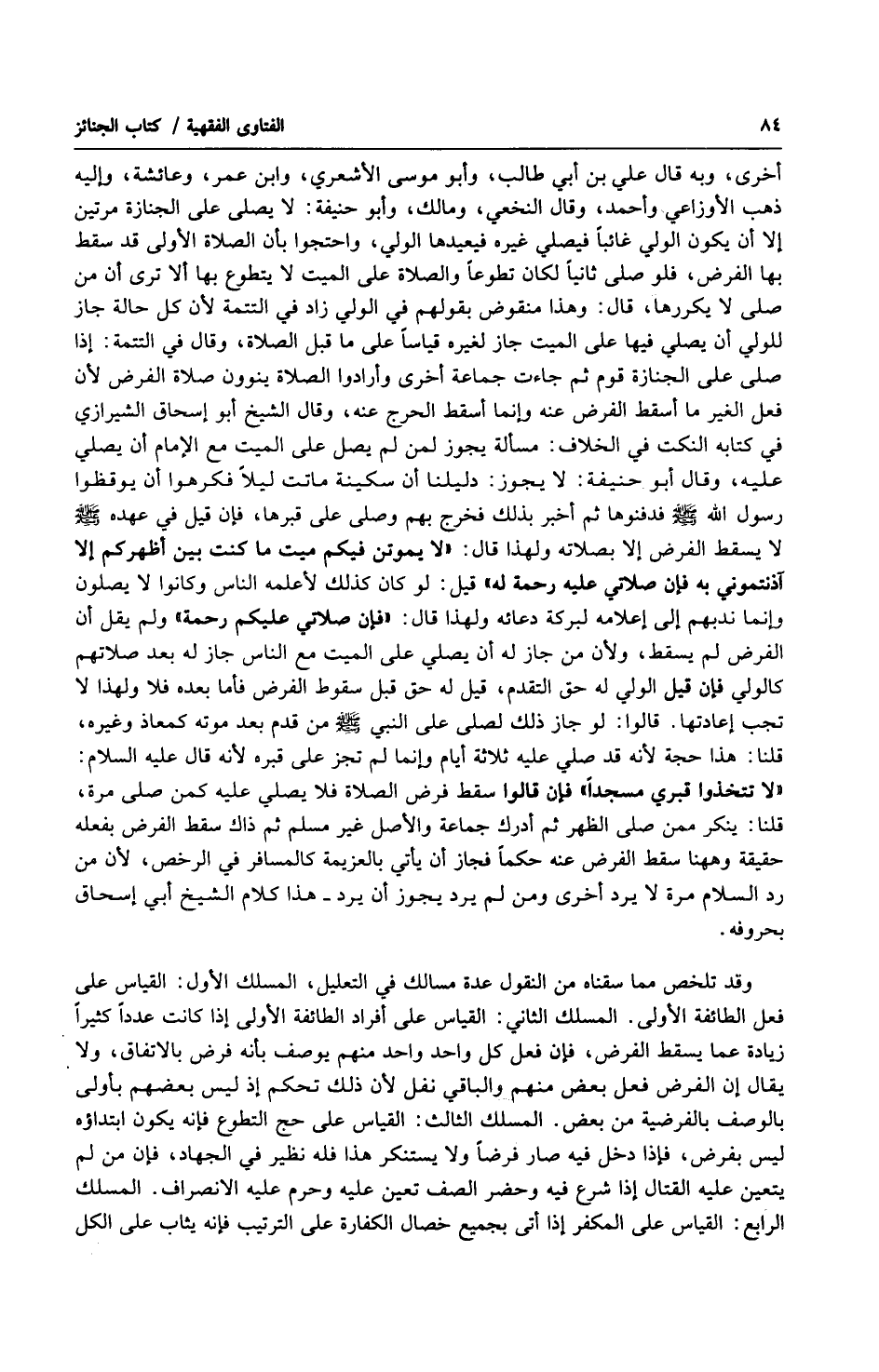 أخرى ، وبه قال علي بن أبي طالب ، وأبو موسى الأشعري ، وابن عمر ، وعائشة ، وإليه ذهب الأوزاعي وأحمد ، وقال النخعي ، ومالك ، وأبو حنيفة : لا يصلى على الجنازة مرتين إلا أن يكون الولي غائباً فيصلي غيره فيعيدها الولي ، واحتجوا بأن الصلاة الأولى قد سقط بها الفرض ، فلو صلى ثانياً لكان تطوعاً والصلاة على الميت لا يتطوع بها ألا ترى أن من صلى لا يكررها ، قال : وهذا منقوض بقولهم في الولي زاد في التتمة لأن كل حالة جاز للولي أن يصلي فيها على الميت جاز لغيره قياساً على ما قبل الصلاة ، وقال في التتمة : إذا صلى على الجنازة قوم ثم جاءت جماعة أخرى وأرادوا الصلاة ينوون صلاة الفرض لأن فعل الغير ما أسقط الفرض عنه وإنما أسقط الحرج عنه ، وقال الشيخ أبو إسحاق الشيرازي في كتابه النكت في الخلاف : مسألة يجوز لمن لم يصل على الميت مع الإمام أن يصلي عليه ، وقال أبو حنيفة : لا يجوز : دليلنا أن سكينة ماتت ليلاً فكرهوا أن يوقظوا رسول الله صلى الله عليه وسلّم فدفنوها ثم أخبر بذلك فخرج بهم وصلى على قبرها ، فإن قيل في عهده صلى الله عليه وسلّم لا يسقط الفرض إلا بصلاته ولهذا قال : ( لا يموتن فيكم ميت ما كنت بين أظهركم إلا آذنتموني به فإن صلاتي عليه رحمة له ) قيل : لو كان كذلك لأعلمه الناس وكانوا لا يصلون وإنما ندبهم إلى إعلامه لبركة دعائه ولهذا قال : ( فإن صلاتي عليكم رحمة ) ولم يقل أن الفرض لم يسقط ، ولأن من جاز له أن يصلي على الميت مع الناس جاز له بعد صلاتهم كالولي فإن قيل الولي له حق التقدم ، قيل له حق قبل سقوط الفرض فأما بعده فلا ولهذا لا تجب إعادتها. قالوا : لو جاز ذلك لصلى على النبي صلى الله عليه وسلّم من قدم بعد موته كمعاذ وغيره ، قلنا : هذا حجة لأنه قد صلى عليه ثلاثة أيام وإنما لم تجز على قبره لأنه قال عليه السلام : ( لا تتخذوا قبري مسجداً ) فإن قالوا سقط فرض الصلاة فلا يصلي عليه كمن صلى مرة ، قلنا : ينكر ممن صلى الظهر ثم أدرك جماعة والأصل غير مسلم ثم ذاك سقط الفرض بفعله حقيقة وههنا سقط الفرض عنه حكماً فجاز أن يأتي بالعزيمة كالمسافر في الرخص ، لأن من رد السلام مرة لا يرد أخرى ومن لم يرد يجوز أن يرد هذا كلام الشيخ أبي إسحاق بحروفه.