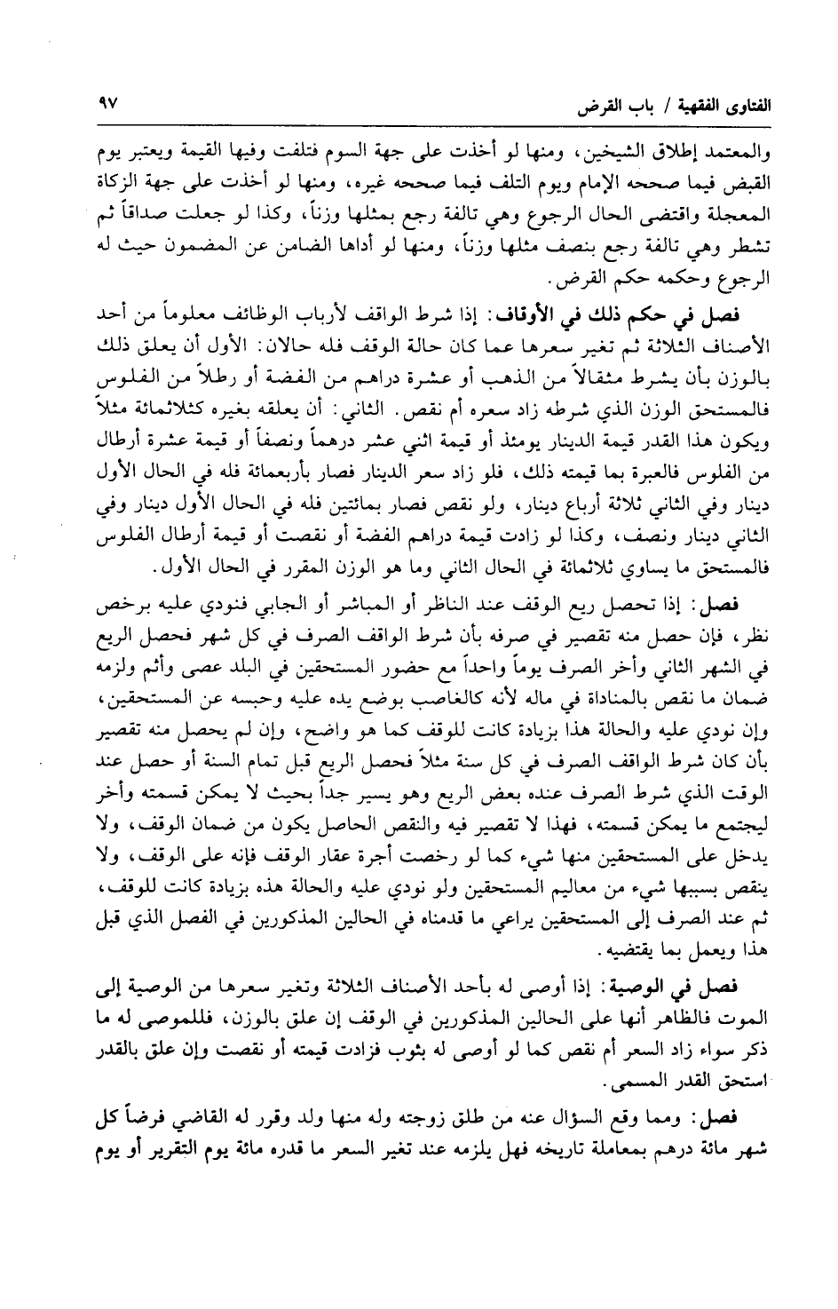 فصل في حكم ذلك في الأوقاف: إذا شرط الواقف لأرباب الوظائف معلوماً من أحد الأصناف الثلاثة ثم تغير سعرها عما كان حالة الوقف فله حالان: الأول أن يعلق ذلك بالوزن بأن يشرط مثقالاً من الذهب أو عشرة دراهم من الفضة أو رطلاً من الفلوس فالمستحق الوزن الذي شرطه زاد سعره أم نقص. الثاني: أن يعلقه بغيره كثلاثمائة مثلاً ويكون هذا القدر قيمة الدينار يومئذ أو قيمة اثني عشر درهماً ونصفاً أو قيمة عشرة أرطال من الفلوس فالعبرة بما قيمته ذلك، فلو زاد سعر الدينار فصار بأربعمائة فله في الحال الأول دينار وفي الثاني ثلاثة أرباع دينار، ولو نقص فصار بمائتين فله في الحال الأول دينار وفي الثاني دينار ونصف، وكذا لو زادت قيمة دراهم الفضة إو نقصت أو قيمة أرطال الفلوس فالمستحق ما يساوي ثلثمائة في الحال الثاني وما هو الوزن المقرر في الحال الأول.