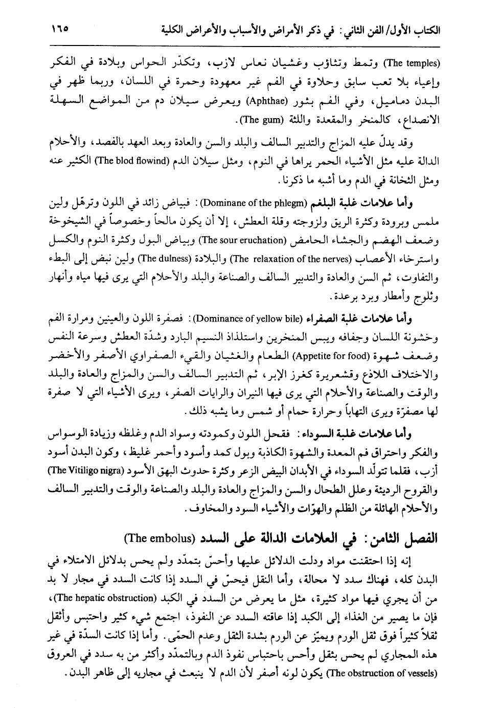 وتمط وتثاؤب وغشيان ونعاس لازب وتكدر الْحَواس وبلادة فِي الْفِكر وإعياء بِلَا تَعب سَابق وحلاوة فِي الْفَم غير معهودة وَحُمرَة فِي اللِّسَان وَرُبمَا ظهر فِي الْبدن دماميل وَفِي الْفَم بثور ويعرض سيلان دم من الْمَوَاضِع السهلة الانصداع كالمنخر والمقعدة واللثة. وَقد يدلّ عَلَيْهِ المزاج وَالتَّدْبِير السالف والبلد وَالسّن والعاثة وَبعد الْعَهْد بالفصد والأحلام الدَّالَّة عَلَيْهِ مثل الْأَشْيَاء الْحمر يَرَاهَا فِي النّوم وَمثل سيلان الدَّم الْكثير عَنهُ وَمثل الثخانة فِي الدَّم وَمَا أشبه مَا ذكرنَا. وَأما عَلَامَات غَلَبَة البلغم: فبياض زَائِد فِي اللَّوْن وترهّل ولين ملمس وبرودة وَكَثْرَة الرِّيق ولزوجته وَقلة الْعَطش إِلَّا أَن يكون مالحاً وخصوصاً فِي الشيخوخة وَضعف الهضم والجشاء الحامض وَبَيَاض الْبَوْل وَكَثْرَة النّوم والكسل واسترخاء الأعصاب والبلادة ولين نبض إِلَى البطء والتفاوت ثمَّ السن وَالْعَادَة وَالتَّدْبِير السالف والصناعة والبلد والأحلام الَّتِي يرى فِيهَا مياه وأنهار وثلوج وأمطار وَبرد برعدة. وَأما عَلَامَات غَلَبَة الصَّفْرَاء: فصفرة اللَّوْن والعينين ومرارة الْفَم وخشونة اللِّسَان وجفافه ويبس المنخرين واستلذاذ النسيم الْبَارِد وشدّة الْعَطش وَسُرْعَة النَّفس وَضعف شَهْوَة الطَّعَام والغثيان والقيء الصفراوي الْأَصْفَر والأخضر وَالِاخْتِلَاف اللاذع وقشعريرة كغرز الأبر ثمَّ التَّدْبِير السالف وَالسّن والمزاج وَالْعَادَة والبلد وَالْوَقْت والصناعة والأحلام الَّتِي يرى فِيهَا النيرَان والرايات الصفر وَيرى الْأَشْيَاء الَّتِي لَا صفرَة لَهَا مصفرة وَيرى التهاباً وحرارة حمام أَو شمس وَمَا يشبه ذَلِك. وَأما عَلَامَات غَلَبَة السَّوْدَاء: فقحل اللَّوْن وكمودته وَسَوَاد الدَّم وغلظه وَزِيَادَة الوسواس والفكر واحتراق فَم الْمعدة والشهوة الكاذبة وَبَوْل كمد وأسود وَأمر غليظ وَكَون الْبدن أسود أزب فقلما تتولد السَّوْدَاء فِي الْأَبدَان الْبيض الزعر وَكَثْرَة حُدُوث البهق الْأسود والقروح الرَّديئَة وَعلل الطحال وَالسّن والمزاج وَالْعَادَة والبلد والصناعة وَالْوَقْت وَالتَّدْبِير السالف والأحلام الهائلة من الظُّلم والهوات والأشياء السود والمخاوف. الْفَصْل الثَّامِن العلامات الدَّالَّة على السدد إِنَّه إِذا احتقنت مواد ودلت الدَّلَائِل عَلَيْهَا وأحس بتمدّد وَلم يحس بدلائل الامتلاء فِي الْبدن كُله فهناك سدد لَا محَالة وَأما النَّقْل فيحسّ فِي السدد إِذا كَانَت السدد فِي مجار لَا بُد من أَن يجْرِي فِيهَا مواد كَثِيرَة مثل مَا يعرض من السدد فِي الكبد فَإِن مَا يصير من الْغذَاء إِلَى الكبد إِذا عاقته السدد عَن النّفُوذ اجْتمع شَيْء كثير وَاحْتبسَ وأثقل ثقلاً كثيرا فَوق ثقل الورم ويميز عَن الورم بِشدَّة الثّقل وَعدم الْحمى. وَأما إِذا كَانَت السدّة فِي غير هَذِه المجاري لم يحس بثقل وأحس باحتباس نُفُوذ الدَّم وبالتمدّد وَأكْثر من بِهِ سدد فِي الْعُرُوق يكون لَونه أصفر لِأَن الدَّم لَا ينبعث فِي مجاريه إِلَى ظَاهر الْبدن.