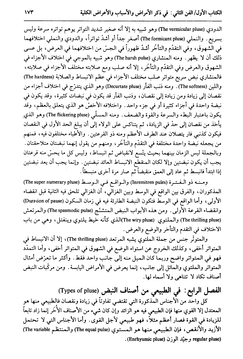 الدودي وَهُوَ شَبيه بِهِ إِلَّا أَنه صَغِير شَدِيد التَّوَاتُر يُوهم تواتره سرعَة وَلَيْسَ بسريع. والنملي أَصْغَر جدا أَو أَشد تواتراً والدودي والنملي اخْتِلَافهمَا فِي الشهوق وَفِي التَّقَدُّم والتأخر أَشد ظهوراً فِي الجس من اخْتِلَافهمَا فِي الْعرض بل عَسى ذَلِك أَن لَا يظْهر. وَمِنْه المنشاري وَهُوَ شَبيه بالموجي فِي اخْتِلَاف الْأَجْزَاء فِي الشهوق وَالْعرض وَفِي التَّقَدُّم والتأخًر إِلَّا أَنه صلب وَمَعَ صلابته مُخْتَلف الْأَجْزَاء فِي صلابته فالمنشاري نبض سريع متواتر صلب مُخْتَلف الْأَجْزَاء فِي عظم الانبساط والصلابة واللين. وَمِنْه ذَنْب الفار وَهُوَ الَّذِي يتدرّج فِي اخْتِلَاف أَجزَاء من نُقْصَان إِلَى زِيَادَة وَمن زِيَادَة إِلَى نُقْصَان وذنب الفار قد يكون فِي نبضات كَثِيرَة وَقد يكون فِي نبضة وَاحِدَة فِي أَجزَاء كَثِيرَة أَو فِي جُزْء وَاحِد. واختلافه الأخصّ هُوَ الَّذِي يتَعَلَّق بالعظم وَقد يكون بِاعْتِبَار البطء والسرعة وَالْقُوَّة والضعف. وَمِنْه المسلّي وَهُوَ الَّذِي يَأْخُذ من نُقْصَان إِلَى حد فِي الزِّيَادَة ثمَّ يتناكس على الْوَلَاء إِلَى أَن يبلغ الْحَد الأول فِي النُّقْصَان فَيكون كذنبي فار يتصلان عِنْد الطّرف الْأَعْظَم وَمِنْه ذُو القرعتين. والأطباء مُخْتَلفُونَ فِيهِ فَمنهمْ من يَجعله نبضة وَاحِدَة مُخْتَلفَة فِي التَّقَدُّم والتأخر وَمِنْهُم من يَقُول إنَّهُمَا نبضتان متلاحقتان. وَبِالْجُمْلَةِ لَيْسَ الزَّمَان بَينهمَا بِحَيْثُ يَتَّسِع لانقباض ثمَّ انبساط وَلَيْسَ كل مَا يحس مِنْهُ قرعتان يجب أَن يكون نبضتين وَإِلَّا لَكَانَ الْمُنْقَطع الإنبساط الْعَائِد نبضتين. وَإِنَّمَا يجب أَن يعد نبضتين إِذا ابْتَدَأَ فانبسط ثمَّ عَاد إِلَى العمق منقبضاً ثمَّ صَار مرّة أُخْرَى منبسطاً. وَمِنْه ذُو الفترة وَالْوَاقِع فِي الْوسط الْمَذْكُورَان وَالْفرق بَين الْوَاقِع فِي الْوسط وَبَين الْغَزالِيّ أَن الْغَزالِيّ تلْحق فِيهِ الثَّانِيَة قبل انْقِضَاء الأولى وَأما الْوَاقِع فِي الْوسط فَتكون النبضة الطارئة فِيهِ فِي زمَان السّكُون وانقضاء الْقرعَة الأولى. وَمن هَذِه الْأَبْوَاب النبض المتشنج والمرتعش والملتوي الَّذِي كَأَنَّهُ خيط يلتوي وينفتل وَهِي من بَاب الِاخْتِلَاف فِي التَّقَدُّم والتأخر والوضع وَالْعرض. والمتوتر جنس من جملَة الملتوي يشبه المرتعد إِلَّا أَن الانبساط فِي الْمُتَوَاتر أخْفى وَكَذَلِكَ الْخُرُوج عَن اسْتِوَاء الْوَضع فِي الشهوق فِي الْمُتَوَاتر أخْفى وَأما الثمود فَهُوَ فِي الْمُتَوَاتر وَاضح وَرُبمَا كَانَ الْميل مِنْهُ إِلَى جَانب وَاحِد فَقَط. وَأكْثر مَا تعرض أَمْثَال الْمُتَوَاتر والملتوي والمائل إِلَى جَانب إِنَّمَا يعرض الْفَصْل الرَّابِع فِي الطبيعي من أَصْنَاف النبض كل وَاحِد من الْأَجْنَاس الْمَذْكُورَة الَّتِي تَقْتَضِي تَفَاوتا فِي زِيَادَة ونقصان فالطبيعي مِنْهَا هُوَ المعتدل إِلَّا الْقوي مِنْهَا فَإِن الطبيعي فِيهِ هُوَ الزَّائِد وَإِن كَانَ شَيْء من الْأَصْنَاف الآخر إِنَّمَا زَاد تَابعا للزِّيَادَة فِي الْقُوَّة فَصَارَ أعظم مثلا فَهُوَ طبيعي لأجل القوى. وَأما الْأَجْنَاس الَّتِي لَا تحْتَمل الأزيد والأنقص فَإِن الطبيعي مِنْهَا هُوَ المستوى والمنتظم وجيد الْوَزْن.