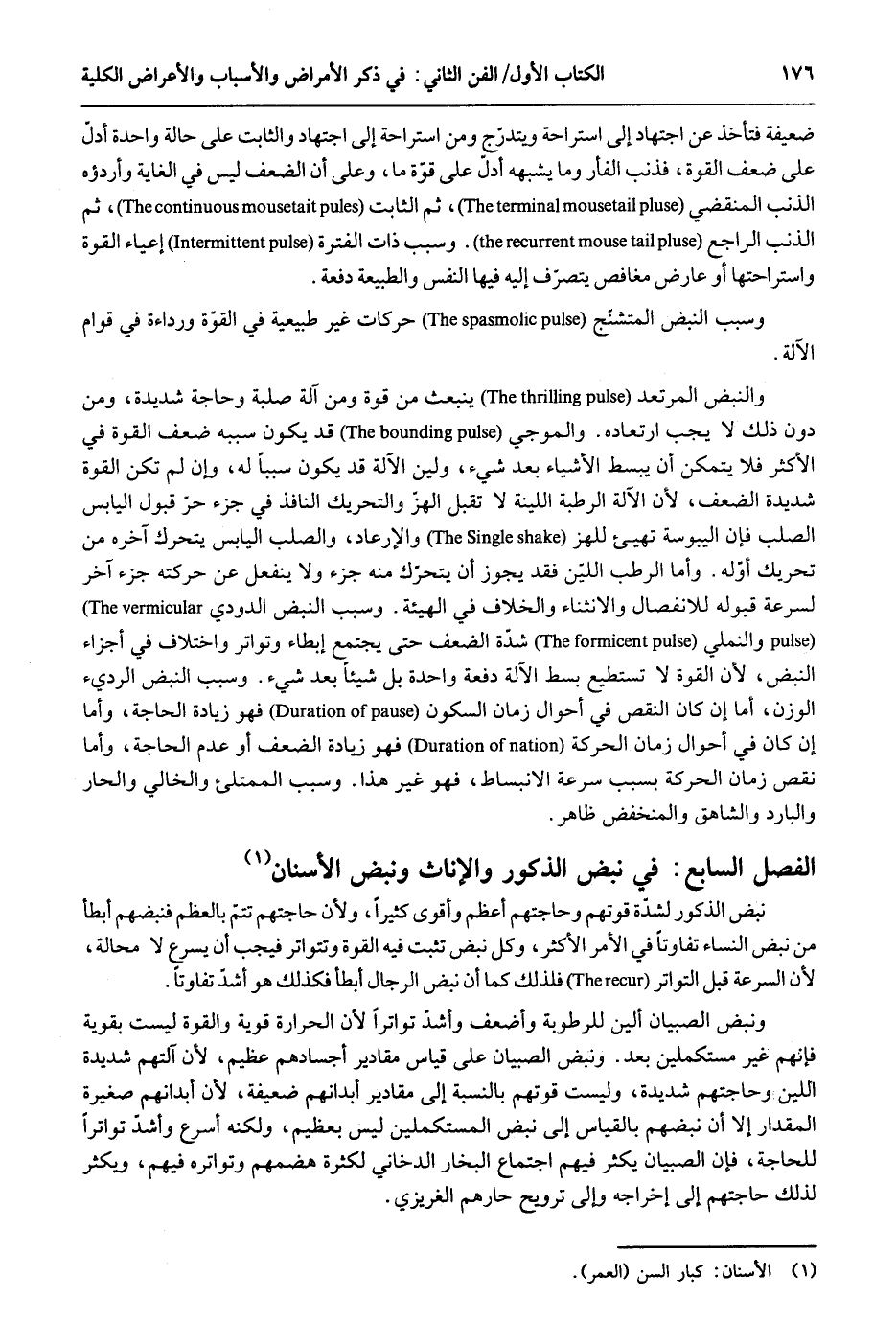 ضَعِيفَة فتأخذ عَن اجْتِهَاد إِلَى استراحة ويتدرج وَمن استراحة إِلَى اجْتِهَاد وَالثَّابِت على حَالَة وَاحِدَة أدل على ضعف القوه فذب الفأر وَمَا يُشبههُ أدل على قُوَّة مَا وعَلى أَن الضعْف لَيْسَ فِي الْغَايَة وأردؤه الذَّنب المنقضي ثمَّ الثَّابِت ثمَّ الذَّنب الرَّاجِع. وَسبب ذَات الفترة إعياء الْقُوَّة واستراحتها أَو عَارض مغافص يتَصَرَّف إِلَيْهِ فِيهَا النَّفس والطبيعة دفْعَة. وَسبب النبض المتشنج حركات غير طبيعية فِي الْقُوَّة ورداءة فِي قوام ى لآلة. والنبض المرتعد ينبعث من قُوَّة وَمن آلَة صلبة وحاجة شَدِيدَة وَمن دون ذَلِك لَا يجب ارتعاده - والموجي قد يكون سبيه ضعف الْقُوَّة فِي الْأَكْثَر فَلَا يتَمَكَّن أَن يبسط الْأَشْيَاء بعد شَيْء ولين الألة قد يكون سَببا لَهُ وَإِن لم تكن الْقُوَّة شَدِيدَة الضعْف لِأَن الألة الرّطبَة اللينة لَا تقبل الهز والتحريك النَّافِذ فِي جُزْء حر قبُول الْيَابِس الصلب فَإِن اليبوسة تهيىء للهز والإرعاد والصلب الْيَابِس يَتَحَرَّك آخِره من تَحْرِيك أَوله. وَأما الرطب اللين فقد يجوز أَن يَتَحَرَّك مِنْهُ جُزْء وَلَا ينفعل عَن حركته جُزْء آخر لسرعة قبُوله للإنفصال والإنثناء وَالْخلاف قي الْهَيْئَة. وَسبب النبض الدودي والنملي شدَّة الضعْف حَتَّى يجْتَمع إبطاء وتواتر وَاخْتِلَاف فِي أَجزَاء النبض لِأَن الْقُوَّة لَا تَسْتَطِيع بسط الْآلَة دفْعَة وَاحِدَة بل شَيْئا بعد شَيْء. وَسبب النبض الْوَزْن أما إِن كَانَ النَّقْص فِي أَحْوَال زمَان السّكُون فَهُوَ زِيَادَة الْحَاجة وَأما إِن كَانَ قي أَحْوَال زمَان الْحَرَكَة فَهُوَ زِيَادَة الضعْف أَو عدم الْحَاجة وَأما نقص زمَان الْحَرَكَة بِسَبَب سرعَة الإنبساط فَهُوَ غير هَذَا. وَسبب الممتلىء والخالي والحار والبارد والشاهق والمنخفض ظَاهر. الْفَصْل السَّابِع نبض الذُّكُور وَالْإِنَاث ونبض الْأَسْنَان نبض الذُّكُور لشدَّة قوتهم وحاجتهم أعظم وَأقوى كثيرا وَلِأَن حَاجتهم تتمّ بالعظم فنبضهم أَبْطَأَ من نبض النِّسَاء تَفَاوتا فِي الْأَمر الْأَكْثَر وكل نبض تثبت فِيهِ الْقُوَّة وتتواتر فَيجب أَنا يسْرع لَا محَالة لِأَن السرعة قبل التَّوَاتُر فَلذَلِك كَمَا أَن نبض الرِّجَال أَبْطَأَ فَكَذَلِك هُوَ أَشد تَفَاوتا. ونبض الصّبيان أَلين للرطوبة وأضعف وَأَشد تواتراً لِأَن الْحَرَارَة قَوِيَّة وَالْقُوَّة لَيست بقوية فَإِنَّهُم غير مستكملين بعد. ونبض الصّبيان على قِيَاس مقادير أَجْسَادهم عَظِيم لِأَن آلتهم شَدِيدَة اللين وحاجتهم شَدِيدَة وَلَيْسَت قوتهم بِالنِّسْبَةِ إِلَى مقادير أبدانهم ضَعِيفَة لِأَن أبدانهم صَغِيرَة الْمِقْدَار إِلَّا أَن نبضهم بِالْقِيَاسِ إِلَى نبض المستكملين لَيْسَ بعظيم وَلكنه أسْرع وَأَشد تواتراً للْحَاجة فَإِن الصّبيان يكثر فيهم اجْتِمَاع البخار الدخاني لِكَثْرَة هضمهم وتواتره فيهم وَيكثر لذَلِك حَاجتهم إِلَى إِخْرَاجه وَإِلَى ترويح حارهم الغريزي.
