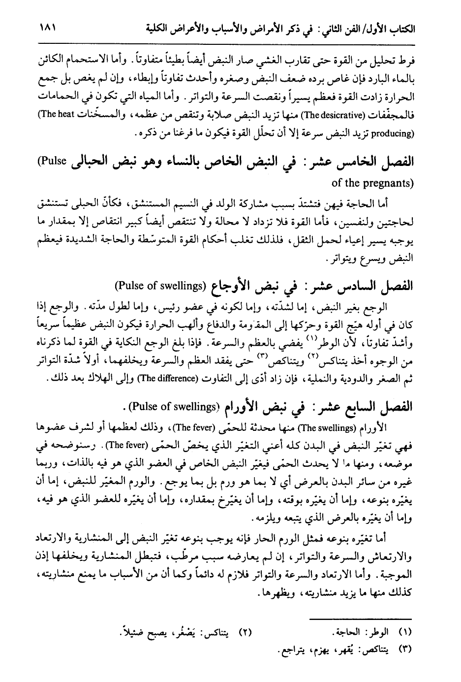 فرط تَحْلِيل من الْقُوَّة حَتَّى تقَارب الغشي صَار النبض أيضاَ بطيئاً متفاوتاً. وَأما الإستحمام الْكَائِن بِالْمَاءِ الْبَارِد فَإِن غاص برده ضعف النبض وصغره وأحدث تَفَاوتا وإبطاء وَإِن لم يغص بل جمع الْحَرَارَة زَادَت الْقُوَّة فَعظم يَسِيرا ونقصت السرعة والتواتر. وَأما الْمِيَاه الَّتِي تكون فِي الحمامات فالمجفّفات مِنْهَا تزيد النبض صلابة وتنقص من عظمه والمسخنات تزيد النبض سرعَة إِلَّا أَن تحلّل الْقُوَّة فَيكون مَا فَرغْنَا من ذكره. الْفَصْل الْخَامِس عشر النبض الْخَاص بِالنسَاء وَهُوَ نبض الحبالى أما الْحَاجة فِيهِنَّ فتشتد بِسَبَب مُشَاركَة الْوَلَد فِي النسيم المستنشق فَكَأَن الحبلى تستنشق لحاجتين ولنفسين فَأَما الْقُوَّة فَلَا تزداد لَا محَالة وَلَا تنقص أَيْضا كَبِير انتقاص إِلَّا بِمِقْدَار مَا يُوجِبهُ يسير إعياء لحمل الثّقل فَلذَلِك تغلب أَحْكَام الْقُوَّة المتوسطة وَالْحَاجة الشَّدِيدَة فيعظم النبض ويسرع ويتواتر. الْفَصْل السَّادِس عشر نبض الأوجاع الوجع بِغَيْر النبض إِمَّا لِشِدَّتِهِ وَإِمَّا لكَونه فِي عُضْو رَئِيس وَإِمَّا لطول مدّته. والوجع إِذا كَانَ فِي أَوله هيج الْقُوَّة وحرّكها إِلَى المقاومة والدفاع وألهب الْحَرَارَة فَيكون النبض عَظِيما سَرِيعا وَأَشد تَفَاوتا لِأَن الوطر يُفْضِي بالعظم والسرعة. فَإِذا بلغ الوجع النكاية فِي الْقُوَّة لما ذكرنَا من الْوُجُوه أَخذ يتناكس ويتناكص حَتَّى يفقد الْعظم والسرعة ويخلفهما أَولا شدَّة التَّوَاتُر ثمَّ الصغر والدودية والنملية فَإِن زَاد أدّى الى التَّفَاوُت وَإِلَى الْهَلَاك بعد ذَلِك. الْفَصْل السَّابِع عشر نبض الأورام الأورام مِنْهَا محدثة للحمّى وَذَلِكَ لعظمها أَو لشرف عضوها فَهِيَ تغير النبض فِي الْبدن كُله أَعنِي التَّغَيُّر الَّذِي يخص الْحمى. وسنوضحه فِي مَوْضِعه وَمِنْهَا مَا لَا يحدث الحمّى فيغير النبض الْخَاص فِي الْعُضْو الَّذِي هُوَ فِيهِ بِالذَّاتِ وَرُبمَا غَيره من سَائِر الْبدن بِالْعرضِ أَي لَا بِمَا هُوَ ورم بل بِمَا يوجع. والورم المغير للنبض إِمَّا أَن يُغير بنوعه وَإِمَّا أَن يُغير بوقته وَإِمَّا أَن يُغير بمقداره وَإِمَّا أَن يُغَيِّرهُ للعضو الَّذِي هُوَ فِيهِ وَإِمَّا أَن يُغَيِّرهُ بِالْعرضِ الَّذِي يتبعهُ وَيلْزمهُ. أما تغيره بنوعه فَمثل الورم الْحَار فَإِنَّهُ يُوجب بنوعه تغيّر النبض إِلَى المنشارية والارتعاد والارتعاش والسرعة والتواتر إِن لم يُعَارضهُ سَبَب مرطب فَتبْطل المنشارية ويخلفها إِذن الموجية. وَأما الارتعاد والسرعة والتواتر فلازم لَهُ دَائِما وكما أَن من الْأَسْبَاب مَا يمْنَع منشاريته كَذَلِك مِنْهَا مَا يزِيد منشاريته ويظهرها.