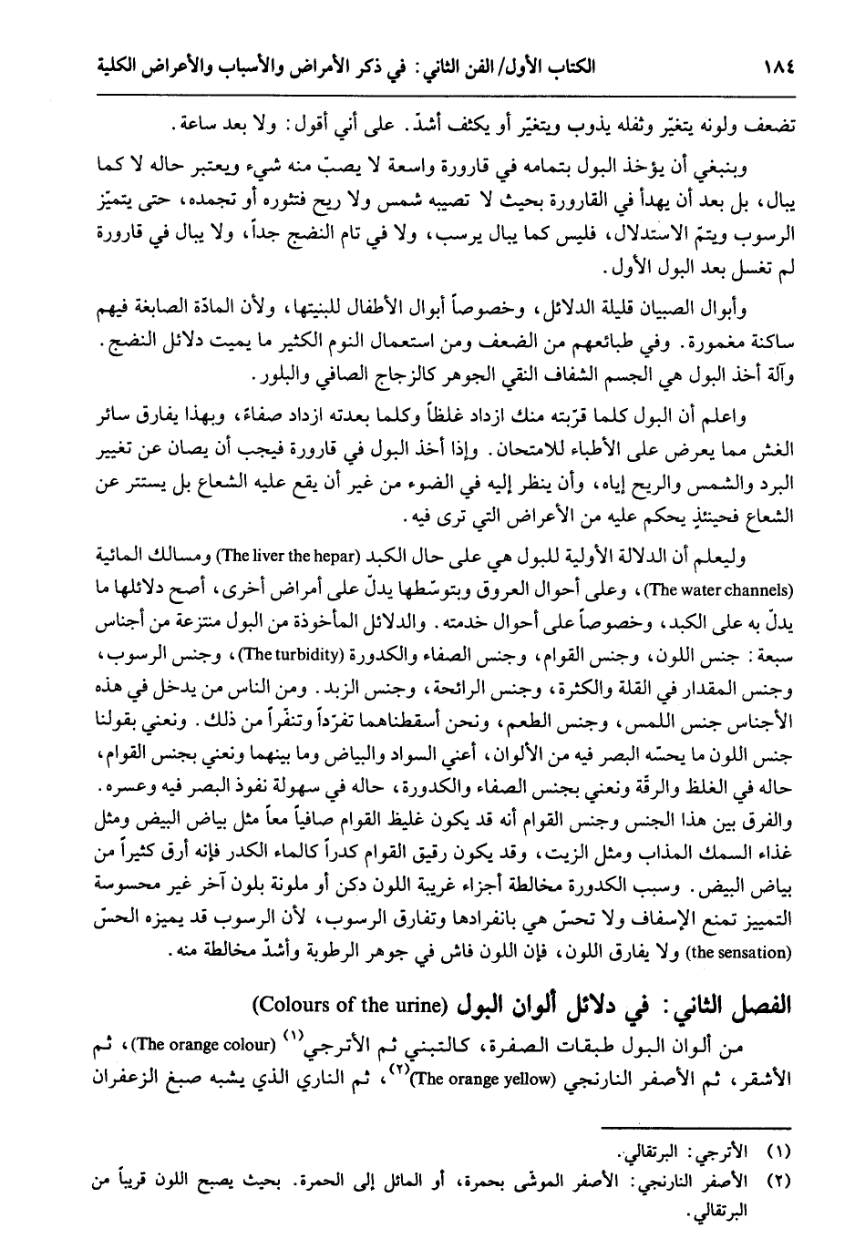 تضعف ولونه يتَغَيَّر وَثقله يذوب ويتغير أَو يكثف أَشد. على أَنِّي أَقُول: وَلَا بعد سَاعَة. وينيغي أَن يُؤْخَذ الْبَوْل بِتَمَامِهِ فِي قَارُورَة وَاسِعَة لَا يصب مِنْهُ شَيْء وَيعْتَبر حَاله لَا كَمَا يبال يل يعد أَن يهدأ قي القارورة بِحَيْثُ لَا يُصِيبهُ شمس وَلَا ريح فيثوره أَو يجمده حَتَّى يتَمَيَّز الرسوب وَيتم الِاسْتِدْلَال فَلَيْسَ كَمَا يبال يرسب وَلَا فِي تَامّ النضج جدا وَلَا يبال فِي قَارُورَة لم يغسل بعد الْبَوْل الأول. وأبوال الصّبيان قَليلَة الدَّلَائِل وخصوصاً أَبْوَال الْأَطْفَال للبنيتها وَلِأَن الْمَادَّة الصابغة فيهم سَاكِنة مغمورة - وَفِي طبائعهم من الضعْف وَمن اسْتِعْمَال النّوم الْكثير مَا يُمِيت دَلَائِل النضج وَآلَة أَخذ الْبَوْل هُوَ الْجِسْم الشفاف النقي الْجَوْهَر كالزجاج الصافي والبلور. وَاعْلَم أَن الْبَوْل كلما قربته مِنْك ازْدَادَ غلظاً وَكلما بعدته ازْدَادَ صفاء وَبهَا يُفَارق سَائِر الْغِشّ مِمَّا يحرض على الْأَطِبَّاء للامتحان - وَإِذا أَخذ الْبَوْل فِي قَارُورَة فَيجب أَن يصان عَن تَغْيِير الْبرد وَالشَّمْس وَالرِّيح إِيَّاه وَأَن ينظر إِلَيْهِ فِي الضَّوْء من غير أَن يَقع عَلَيْهِ الشعاع بل يسْتَتر عَن الشعاع فَحِينَئِذٍ يحكم عَلَيْهِ من الْأَعْرَاض الَّتِي ترى فِيهِ. وليعلم أَن الدّلَالَة الأولية للبول هِيَ على حَال الكبد ومسالك المائية وعَلى أَحْوَال الْعُرُوق وبتوسطها يدل على أمراض أُخْرَى أصح دلائلها مَا يدل بِهِ على الكبد وخصوصاً على أَحْوَال خدمته. والدلائل الْمَأْخُوذَة من الْبَوْل منتزعة من أَجنَاس سَبْعَة: جنس اللَّوْن وجنس القوام وجنس الصفاء والكدرة وجنس الرسوب وجنس الْمِقْدَار فِي الْقلَّة وَالْكَثْرَة وجنس الرَّائِحَة وجنس الزّبد وَمن النَّاس من يدْخل فِي هَذِه الْأَجْنَاس جنس اللَّمْس وجنس الطّعْم وَنحن أسقطناهما تفرداً وتنفراً من ذَلِك. ونعني بقولنَا جنس اللَّوْن مَا يحسه الْبَصَر فِيهِ من الألوان أَعنِي السوَاد وَالْبَيَاض وَمَا بَينهمَا ونعني بِجِنْس القوام حَاله فِي الغلظ والرقة ونعتي بِجِنْس الصفاء والكدورة حَاله فِي سهولة نُفُوذ الْبَصَر فِيهِ وعسره. وَالْفرق بَين هَذَا الْجِنْس وجنس القوام أَنه قد يكون غليظ القوام صافياً مَعًا مثل يياض الْبيض وَمثل غذَاء السّمك الْمُذَاب وَمثل الزَّيْت وَقد يكون رَقِيق القوام كدراً كَالْمَاءِ الكدر فَإِنَّهُ أرق كثيرا من بَيَاض الْبيض وَسبب الكدورة مُخَالطَة أَجزَاء غَرِيبَة اللَّوْن دكن أَو ملونة بلون آخر غير محسوسة التَّمْيِيز تمنع الإسفاف وَلَا تحس هِيَ بانفرادها وتفارق الرسوب لِأَن الرسوب قد يميزه الْحس وَلَا يُفَارق اللَّوْن فَإِن اللَّوْن فَاش فِي جَوْهَر الرُّطُوبَة وَأَشد مُخَالطَة مِنْهُ. الْفَصْل الثَّانِي دَلَائِل ألوان الْبَوْل من ألوان الْبَوْل طَبَقَات الصُّفْرَة كالتبني ثمَّ الأترجي ثمَّ الْأَشْقَر ثمَّ الْأَصْفَر النارنجي ثمَّ الناري الَّذِي يشبه صبغ الزَّعْفَرَان