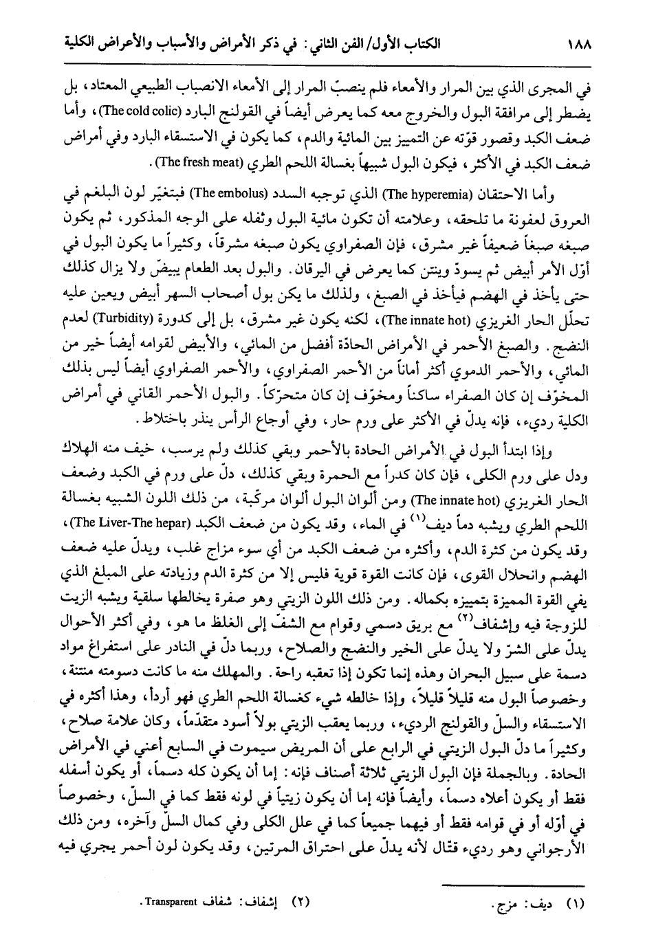 فِي المجرى الَّذِي بَين المرار والأمعاء فَلم ينصب المرار إِلَى الأمعاء الإنصباب الطبيعي الْمُعْتَاد بل يضْطَر إِلَى مرافقة الْبَوْل وَالْخُرُوج مَعَه كَمَا يعرض أيضاَ فِي القولنج الْبَارِد وَأما ضعف الكبد وقصور قوته عَن التَّمْيِيز بَين المائية وَالدَّم كَمَا يكون فِي الاسْتِسْقَاء الْبَارِد وَفِي أمراض ضعف الكبد فِي الْأَكْثَر فَيكون الْبَوْل شَبِيها بغسالة اللَّحْم الطري. وَأما الاحتقان الَّذِي توجبه السمد فبتغير لون البلغم فِي الْعُرُوق لعفونة مَا تلْحقهُ وعلامته أَن تكون مائية الْبَوْل وَثقله على الْوَجْه الْمَذْكُور ثمَّ يكون صبغه صبغاً ضَعِيفا غير مشرق فَإِن الصفراوي يكون صبغه مشرقاً وَكَثِيرًا مَا يكون الْبَوْل فِي أول الْأَمر أَبيض ثمَّ يسود وينتن كَمَا يعرض فِي اليرقان. وَالْبَوْل بعد الطَّعَام يبيض وَلَا يزَال كَذَلِك حَتَّى يَأْخُذ فِي الهضم فَيَأْخُذ فِي الصَّبْغ وَلذَلِك مَا يكون بَوْل أَصْحَاب السهر أَبيض ويعين عَلَيْهِ تحلل الْحَار الغريزي لكنه يكون غير مشرق بل إِلَى كدورة لعدم النضج. والصبغ الْأَحْمَر فِي الْأَمْرَاض الحادة أفضل من المائي والأبيض لقوامه أَيْضا خير من المائي والأحمر الدموي أَكثر أَمَانًا من الْأَحْمَر الصفراوي والأحمر الصفراوي أَيْضا لَيْسَ بذلك الْمخوف إِن كَانَ الصَّفْرَاء سَاكِنا ومخوف إِن كَانَ متحركاً. وَالْبَوْل الْأَحْمَر القاني فِي أمراض الْكُلية رَدِيء فَإِنَّهُ يدل فِي الْأَكْثَر على ورم حَار وَفِي أوجاع الرَّأْس ينذر باختلاط. وَإِذا ابْتَدَأَ الْبَوْل فِي الْأَمْرَاض الحادة بالأحمر وَبَقِي كَذَلِك وَلم يرسب خيف مِنْهُ الْهَلَاك وَدلّ على ورم الكلى فَإِن كَانَ كدراً مَعَ الْحمرَة وَبَقِي كَذَلِك دلّ على ورم فِي الكبد وَضعف الْحَار الغريزي. وَمن ألوان الْبَوْل ألوان مركبة من ذَلِك اللَّوْن الشبيه بغسالة اللَّحْم الطري وَيُشبه دَمًا ديف فِي المَاء وَقد يكون من ضعف الكبد وَقد يكون من كَثْرَة الدَّم وَأَكْثَره من ضعف الكبد من أَي سوء مزاج غلب وَيدل عَلَيْهِ ضعف الهضم وانحلال القوى فَإِن كَانَت الْقُوَّة قَوِيَّة فَلَيْسَ إِلَّا من كَثْرَة الدَّم وزيادته على الْمبلغ الَّذِي يَفِي الْقُوَّة المميزة بتمييزه بِكَمَالِهِ. وَمن ذَلِك اللَّوْن الزيتي وَهُوَ صفرَة يخالطها سلقية وَيُشبه الزَّيْت للزَّوْجَة فِيهِ وإشفاف مَعَ بريق دسمي وقوام مَعَ الشف إِلَى الغلظ مَا هُوَ وَفِي أَكثر الْأَحْوَال يدل على الشَّرّ وَلَا يدل على الْخَيْر والنضج وَالصَّلَاح وَرُبمَا دلّ فِي النَّادِر على استفراغ مواد دسمة على سَبِيل البحران وَهَذِه إِنَّمَا تكون إِذا تعقبه رَاحَة. والمهلك مِنْهُ مَا كَانَت دسومته مُنْتِنَة وخصوصاً الْبَوْل مِنْهُ قَلِيلا قَلِيلا وَإِذا خالطه شَيْء كغسالة اللَّحْم الطري فَهُوَ أردأ وَهَذَا أَكْثَره فِي الاسْتِسْقَاء والسل والقولنج الرَّدِيء وَرُبمَا يعقب الزيتي بولاً أسود مُتَقَدما وَكَانَ عَلامَة صَلَاح وَكَثِيرًا مَا دلّ الْبَوْل الزيتي فِي الرَّابِع على أَن الْمَرِيض سيموت فِي السَّابِع أَعنِي فِي الْأَمْرَاض الحادة. وَبِالْجُمْلَةِ فَإِن الْبَوْل الزيتي ثَلَاثَة أَصْنَاف فَإِنَّهُ: إِمَّا أَن يكون كُله دسماً أَو يكون أَسْفَله فَقَط أَو يكون أَعْلَاهُ. دسماً وَأَيْضًا فَإِنَّهُ إِمَّا أَن يكون زيتياً فِي لَونه فَقَط كَمَا فِي السل وخصوصاً فِي أَوله أَو فِي قوامه فَقَط أَو فيهمَا جَمِيعًا كَمَا فِي علل الكلى وَفِي كَمَال السل وَآخره وَمن ذَلِك الأرجواني وَهُوَ ردي قتال لِأَنَّهُ يدل على احتراق الْمَرَّتَيْنِ وَقد يكون لون أَحْمَر يجْرِي فِيهِ