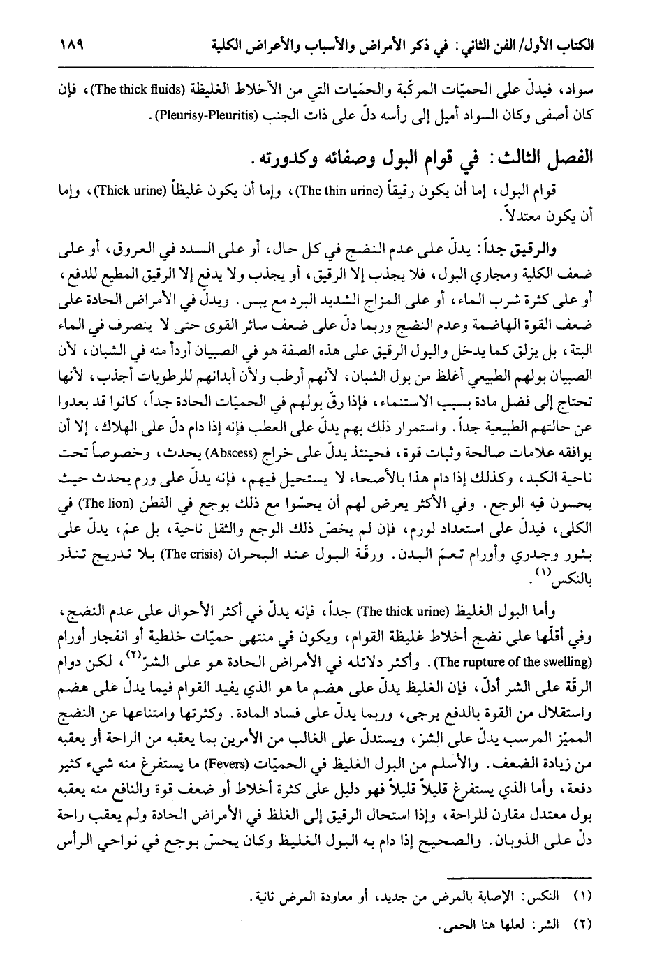 سَواد فَيدل على الحميات المركبة والحمّيات الَّتِي من الأخلاط الغليظة فَإِن كَانَ أصفى وَكَانَ السوَاد أميل إِلَى رَأسه دلّ على ذَات الْجنب. الْفَصْل الثَّالِث قوام الْبَوْل وَصِفَاته وكدورته قوام الْبَوْل إِمَّا أَن يكون رَقِيقا وَإِمَّا أَن يكون غليظاً وَإِمَّا أَن يكون معتدلاً. وَالرَّقِيق جدا: يدل على عدم النضج فِي كل حَال أَو على السدد فِي الْعُرُوق أَو على ضعف الْكُلية ومجاري الْبَوْل فَلَا يجذب إِلَّا الرَّقِيق أَو يجذب وَلَا يدْفع إِلَّا الرَّقِيق الْمُطِيع للدَّفْع أَو على كَثْرَة شرب المَاء أَو على المزاج الشَّديد الْبرد مَعَ يبس. وَيدل فِي الْأَمْرَاض الحادة على ضعف الْقُوَّة الهاضمة وَعدم النضج وَرُبمَا دلّ على ضعف سَائِر القوى حَتَّى لَا ينْصَرف فِي المَاء الْبَتَّةَ بل يزلق كَمَا يدْخل وَالْبَوْل الرَّقِيق على هَذِه الصّفة هُوَ فِي الصّبيان أردأ مِنْهُ فِي الشبَّان لِأَن الصّبيان بَوْلهمْ الطبيعي أغْلظ من بَوْل الشبَّان لأَنهم أرطب وَلِأَن أبدانهم للرطوبات أجذب لِأَنَّهَا تحْتَاج إِلَى فضل مَادَّة بِسَبَب الاستنماء فَإِذا رق بَوْلهمْ فِي الحميات الحادة جدا كَانُوا قد بعدوا عَن حالتهم الطبيعية جدا. واستمرار ذَلِك بهم يدل على العطب فَإِنَّهُ إِذا دَامَ دلّ على الْهَلَاك إِلَّا أَن يُوَافقهُ عَلَامَات صَالِحَة وثبات قُوَّة فَحِينَئِذٍ يدل على خراج يحدث وخصوصاً تَحت نَاحيَة الكبد وَكَذَلِكَ إِذا دَامَ هَذَا بالأصحاءُ لَا يَسْتَحِيل فيهم فَإِنَّهُ يدل على ورم يحدث حَيْثُ يحسون فِيهِ الوجع. وَفِي الْأَكْثَر يعرض لَهُم أَن يحسوا مَعَ ذَلِك بوجع فِي الْقطن وَفِي الكلى فَيدل على استعداد لورم فَإِن لم يخص ذَلِك الوجع والثقل نَاحيَة بل عَم يدل على بثور وجدري وأورام تعم الْبدن. ورقة الْبَوْل عِنْد البحران بِلَا تدريج تنذر بالنكس. وَأما الْبَوْل الغليظ جدا فانه يدل فِي أَكثر الْأَحْوَال على عدم النضج وَفِي أقلهَا على نضج أخلاط غَلِيظَة القوام وَيكون فِي مُنْتَهى حميات خلطية أَو انفجار أورام. وَأكْثر دلائله فِي الْأَمْرَاض الحادة هُوَ على الشَّرّ لَكِن دوَام الرقة على الشَّرّ أدل فَإِن الغيلظ يدل على هضم مَا هُوَ الَّذِي يُفِيد القوام فِيمَا يدل على هضم واستقلال من الْقُوَّة بِالدفع يُرْجَى وَرُبمَا يدل على فَسَاد الْمَادَّة. وَكَثْرَتهَا وامتناعها عَن النضج الْمُمَيز المرسب يدل على الشَّرّ ويستدل على الْغَالِب من الْأَمريْنِ بِمَا يعقبه من الرَّاحَة أَو يعقبه من زِيَادَة الضعْف. والأسلم من الْبَوْل الغليظ فِي الحميات مَا يستفرغ مِنْهُ شَيْء كثير دفْعَة وَأما الَّذِي يستفرغ قَلِيلا قَلِيلا فَهُوَ دَلِيل على كَثْرَة أخلاط أَو ضعف قُوَّة والنافع مِنْهُ يعقبه بَوْل معتدله مُقَارن للراحة وءاذا اسْتَحَالَ الرَّقِيق إِلَى الغلظ فِي الْأَمْرَاض الحادة وَلم يعقب رَاحَة دلّ على الذوبان. وَالصَّحِيح إِذا دَامَ بِهِ الْبَوْل الغليظ وَكَانَ يحس بوجع فِي نواحي الرَّأْس