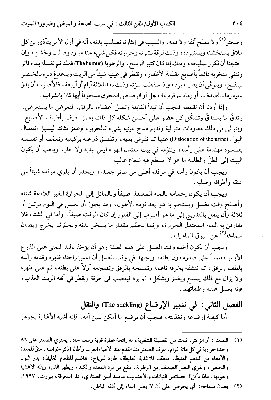 وصعتر وَلَا يملح أَنفه وَلَا فَمه. وَالسَّبَب فِي إيثارنا تصليب بدنه أَنه فِي أول الْأَمر يتَأَذَّى من كل ملاق يستخشنه ويستبرده وَذَلِكَ لرقة بَشرته وحرارته فَكل شَيْء عِنْده بَارِد وصلب وخشن وَإِن احتجنا أَن نكرر تمليحه وَذَلِكَ إِذا كَانَ كثير الْوَسخ والرطوبة فعلنَا ثمَّ نغسله بِمَاء فاتر وننقي مَنْخرَيْهِ دائماَ بأصابع مقلمة الْأَظْفَار ونقطر فِي عَيْنَيْهِ شَيْئا من الزَّيْت ويدغدغ دبره بالخنصر لينفتح ويتوقى أَن يُصِيبهُ برد وَإِذا سَقَطت سرته وَذَلِكَ بعد ثَلَاثَة أَيَّام أَو أَرْبَعَة فالأصوب أَن يذر عَلَيْهِ رماد الصدف أَو رماد عرقوب الْعجل أَو الرصاص المحرق مسحوقاً أَيهَا كَانَ بِالشرابِ. وَإِذا أردنَا أَن نقمطه فَيجب أَن تبدأ الْقَابِلَة وتمس أعضاءه بالرفق فتعرض مَا يستعرض وتدق مَا يستدق وتشكّل كل عُضْو على أحسن شكله كل ذَلِك بغمز لطيف بأطراف الْأَصَابِع. ويتوالى فِي ذَلِك معاودات مُتَوَالِيَة وتديم مسح عَيْنَيْهِ بِشَيْء كالحرير وغمز مثانته ليسهل انْفِصَال الْبَوْل عَنْهَا ثمَّ نفرش يَدَيْهِ وتلصق ذِرَاعَيْهِ بركبتيه وتعمّمه أَو تقلنسه بقلنسوة مهندمة على رَأسه وتنومه فِي بَيت معتدل الْهَوَاء لَيْسَ ببارد وَلَا حَار وَيجب أَن يكون الْبَيْت إِلَى الظل والظلمة مَا هُوَ لَا يسطع فِيهِ شُعَاع غَالب. وَيجب أَن يكون رَأسه فِي مرقده أَعلَى من سَائِر جسده ويحفر أَن يلوي مرقده شَيْئا من عُنُقه وأطرافه وصلبه. وَيجب أَن يكون إحمامه بِالْمَاءِ المعتدل صيفاً وبالمائل إِلَى الْحَرَارَة الْغَيْر اللاذعة شتاء وَأصْلح وَقت يغسل ويستحم بِهِ هُوَ بعد نَومه الأطول وَقد يجوز أَن يغسل فِي الْيَوْم مرَّتَيْنِ أَو ثَلَاثَة وَأَن ينْقل بالتدريج إِلَى مَا هُوَ أضْرب إِلَى الفتور إِن كَانَ الْوَقْت صيفاً. وَأما فِي الشتَاء فَلَا يفارقن بِهِ المَاء المعتدل الْحَرَارَة وَإِنَّمَا يحمّم مِقْدَار مَا وَيجب أَن يكون أَخذه وَقت الْغسْل على هَذِه الصّفة وَهُوَ أَن يُؤْخَذ بِالْيَدِ الْيُمْنَى على الذِّرَاع الْأَيْسَر معتمداَ على صَدره دون بَطْنه ويجتهد فِي وَقت الْغسْل أَن تمس راحتاه ظَهره وَقدمه رَأسه بلطف وبرفق ثمَّ تنشفه بِخرقَة ناعمة وتمسحه بالرفق وتضجعه أَولا على بَطْنه ثمَّ على ظَهره وَلَا يزَال مَعَ ذَلِك يمسح ويغمز وَيشكل ثمَّ يرد فيعصب فِي خرقَة ويقطر فِي أَنفه الزَّيْت العذب فَإِنَّهُ يغسل عَيْنَيْهِ وطبقاتهما. الْفَصْل الثَّانِي تَدْبِير الْإِرْضَاع وَالنَّقْل أما كَيْفيَّة إرضاعة وتغذيبته فَيجب أَن يرضع مَا أمكن بِلَبن أمه فَإِنَّهُ أشبه الأغذية بجوهر