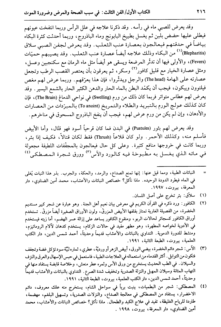 وَقد يعرض للصَّبِيّ مَاء فِي رَأسه. وَقد ذكرنَا علاجه فى علل الرَّأْس وَرُبمَا انتفخت عيونهم فيطلى عَلَيْهَا حضض بِلَبن ثمَّ يغسل بطبيخ البايوتج وَمَاء الباذروج وَرُبمَا أحدثت كَثْرَة الْبكاء بَيَاضًا فِي حدقتهم فيعالجون بعصارة عِنَب الثَّعْلَب. وَقد يعرض لجفن الصَّبِي سلاق من الْبكاء وَذَلِكَ علاجه أَيْضا عصارة عِنَب الثَّعْلَب. وَقد يصيبهم حميات وَالْأولَى فِيهَا أَن تدثر الْمُرضعَة ويسقى هُوَ أَيْضا مثل مَاء الرُّمَّان مَعَ سكنجبين وَعسل وَمثل عصارة الْخِيَار مَعَ قَلِيل كافور وسكر ثمَّ يعرقون بِأَن يعتصر الْقصب الرطب وَتجْعَل عصارته على الهامة وَالرجل ويدثروا فَإِن هَذَا يعرقهم. وَرُبمَا عرض لَهُم مغص فيلتوون ويبكون فَيجب أَن يكمد الْبَطن بِالْمَاءِ الْحَار والدهن الْكثير الْحَار بالشمع الْيَسِير. وَقد يعرض لَهُم عطاس متواتر فَرُبمَا كَانَ ذَلِك من ورم فِي نواحي الدِّمَاغ فَإِن كَانَ كَذَلِك عولج الورم بالتبريد والطلاء والتمريخ بالمبردات من العصارات والأدهان وَإِن لم يكن من ورم عرض لَهُم فَيجب أَن ينْفخ الباذورج المسحوق فِي مناخرهم. ؤقد يعرض لَهُم بثور فِي الْبدن فَمَا كَانَ قرحياً أسود فَهُوَ قتال وَأما الْأَبْيَض فَأسلم مِنْهُ وَكَذَلِكَ الْأَحْمَر. وَلَو كَانَ قلاعاً فَقَط لَكَانَ قتالاً فَكيف إِذا بثر وَرُبمَا كَانَت فِي خُرُوجهَا مَنَافِع كَثِيرَة وعَلى كل حَال فيعالجون بالمجففات اللطيفة مجعولة فِي مَائه الَّذِي يغسل بِهِ مطبوخة فِيهِ كالورد والأس وورق شَجَرَة المصطكي