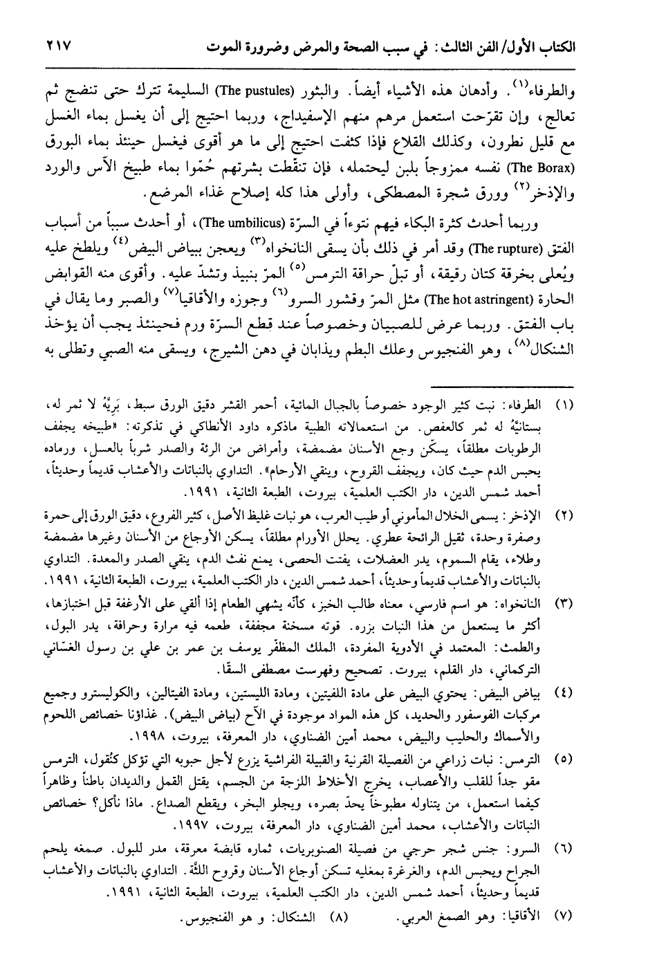 والطرفاء. وأدهان هَذِه الْأَشْيَاء أَيْضا. والبثور السليمة تتْرك حَتَّى تنضج ثمَّ تعالج وَإِن تقرّحت اسْتعْمل مرهم مِنْهُم الإسفيداج وَرُبمَا احْتِيجَ إِلَى أَن يغسل بِمَاء الْغسْل مَعَ قَلِيل نطرون وَكَذَلِكَ القلاع فاذا كثفت احْتِيجَ إِلَى مَا هُوَ أقل فَيغسل حِينَئِذٍ بِمَاء البورق نَفسه ممزوجاً بِلَبن ليحتمله فَإِن تنقطت بشرتهم حُمّوا بِمَاء طبيخ الآس والورد والإذخر وورق شَجَرَة المصطكي وَأولى هَذَا كُله إصْلَاح غذَاء الْمُرْضع. وَرُبمَا أحدث كَثْرَة الْبكاء فيهم نتوءاً فِي السُّرَّة أَو أحدث سَببا من أَسبَاب الفتق وَقد أَمر فِي ذَلِك بِأَن يسقى النانخواه ويعجن ببياض الْبيض ويلطخ عَلَيْهِ ويُعلى بِخرقَة كتَّان رقيقَة أَو تبل حراقة الترمس المز بنبيذ وتشد عَلَيْهِ. وَأقوى مِنْهُ القوابض الحارة مثل المر وقشور السرو وَجوزهُ والأقاقيا وَالصَّبْر وَمَا يُقَال فِي بَاب الفتق. وَرُبمَا عرض للصبيان وخصوصاً عِنْد قطع السرّة ورم فَحِينَئِذٍ يجب أَن يُؤْخَذ الشنكال وَهُوَ الفنجيوس وعلك البطم ويذابان فِي ذهن الشيرج ويسقى. مِنْهُ الصَّبِي وتطلى بِهِ