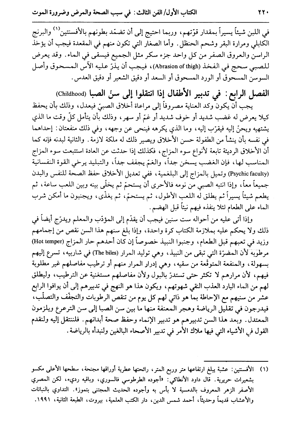 فِي اللَّبن شَيْئا يَسِيرا بِمِقْدَار قوتهم وَرُبمَا احْتِيجَ إِلَى أَن تضمّد بطونهم بالأفسنتين والبرنج الكابلي ومرارة الْبَقر وشحم الحنظل. وَأما الصغار الَّتِي تكون مِنْهُم فِي المقعدة فَيجب أَن يُؤْخَذ الراسن وَالْعُرُوق الصفر من كل وَاحِد جُزْء سكر مثل الْجَمِيع فيسقى فِي المَاء. وَقد يعرض للصَّبِيّ سحج فِي الْفَخْذ فَيجب أَن يذر عَلَيْهِ الآس المسحوق وأصل السوسن المسحوق أَو الْورْد المسحوق أَو السعد أَو دَقِيق الشّعير أَو دَقِيق العدس. الْفَصْل الرَّابِع تَدْبِير الْأَطْفَال إِذا انتقلوا إِلَى سنّ الصِّبَا يجب أَن يكون وكد الْعِنَايَة مصروفاً إِلَى مُرَاعَاة أَخْلَاق الصَّبِي فيعدل وَذَلِكَ بِأَن يحفظ كَيْلا يعرض لَهُ غضب شَدِيد أَو خوف شَدِيد أَو غم أَو سهر وَذَلِكَ بِأَن يتَأَمَّل كلّ وَقت مَا الَّذِي يشتهيه ويحنّ إِلَيْهِ فَيقرب إِلَيْهِ وَمَا الَّذِي يكرههُ فينحى عَن وَجهه وَفِي ذَلِك منفعتان: إِحْدَاهمَا فِي نَفسه بِأَن ينشأ من الطفولة حسن الْأَخْلَاق وَيصير ذَلِك لَهُ ملكة لَازِمَة. وَالثَّانيَِة لبدنه فَإِنَّهُ كَمَا أَن الْأَخْلَاق الرَّديئَة تَابِعَة لأنواع سوء المزاج فَكَذَلِك إِذا حدثت عَن الْعَادة استتبعت سوء المزاج الْمُنَاسب لَهَا فَإِن الْغَضَب يسخن جدا وَالْغَم يجفف جدا والتبليد يُرْخِي الْقُوَّة النفسانية وتميل بالمزاج إِلَى البلغمية فَفِي تَعْدِيل الْأَخْلَاق حفظ الصِّحَّة للنَّفس وَالْبدن جَمِيعًا مَعًا وَإِذا انتبه الصَّبِي من نَومه فالأحرى أَن يستحم ثمَّ يخلّى بَينه وَبَين اللّعب سَاعَة ثمَّ يطعم شَيْئا يَسِيرا ثمَّ يُطلق لَهُ اللّعب الأطول ثمَّ يستحمّ ثمَّ يغذّى ويجنبون مَا أمكن شرب المَاء على الطَّعَام لِئَلَّا ينفذهُ فيهم نيئاً قبل الهضم. وَإِذا أَتَى عَلَيْهِ من أَحْوَاله سِتّ سِنِين فَيجب أَن يقدم إِلَى الْمُؤَدب والمعلم ويدرج أَيْضا فِي ذَلِك وَلَا يحكم عَلَيْهِ بملازمة الْكتاب كرة وَاحِدَة فَإِذا بلغ سنهم هَذَا السن نقص من إجمامهم وَزيد فِي تعبهم قبل الطَّعَام وجنبوا النَّبِيذ خُصُوصا إِن كَانَ أحدهم حَار المزاج مرطوبه لِأَن الْمضرَّة الَّتِي تبقى من النَّبِيذ وَهِي توليد المرار فِي ضاربيه تسرع إِلَيْهِم بسهولة وَالْمَنْفَعَة المتوقعة من سقيه وَهِي إدرار المرار مِنْهُم أَو ترطيب مفاصلهم غير مَطْلُوبَة فيهم لِأَن مرارهم لَا تكْثر حَتَّى تستدر بالبول وَلِأَن مفاصلهم مستغنية عَن الترطيب وليطلق لَهُم من المَاء الْبَارِد العذب النقي شهوتهم وَيكون هَذَا هُوَ النهج فِي تدبيرهم إِلَى أَن يوافوا الرَّابِع عشر من سنيهم مَعَ الْإِحَاطَة بِمَا هُوَ ذاتي لَهُم كل يَوْم من تنقص الرطوبات والتجفف والتصلّب فيدرجون فِي تقليل الرياضة وهجر المعنفة مِنْهَا مَا بَين سنّ الصِّبَا إِلَى سنّ الترعرع ويلزمون المعتدل. وَبعد هَذَا السن تدبيرهم هُوَ تَدْبِير الإنماء وَحفظ صِحَة أبدانهم. فلننتقل إِلَيْهِ ولنقدم القَوْل فِي الْأَشْيَاء الَّتِي فِيهَا ملاك الْأَمر فِي تَدْبِير الأصحاء الْبَالِغين ولنبدأه بالرياضة.