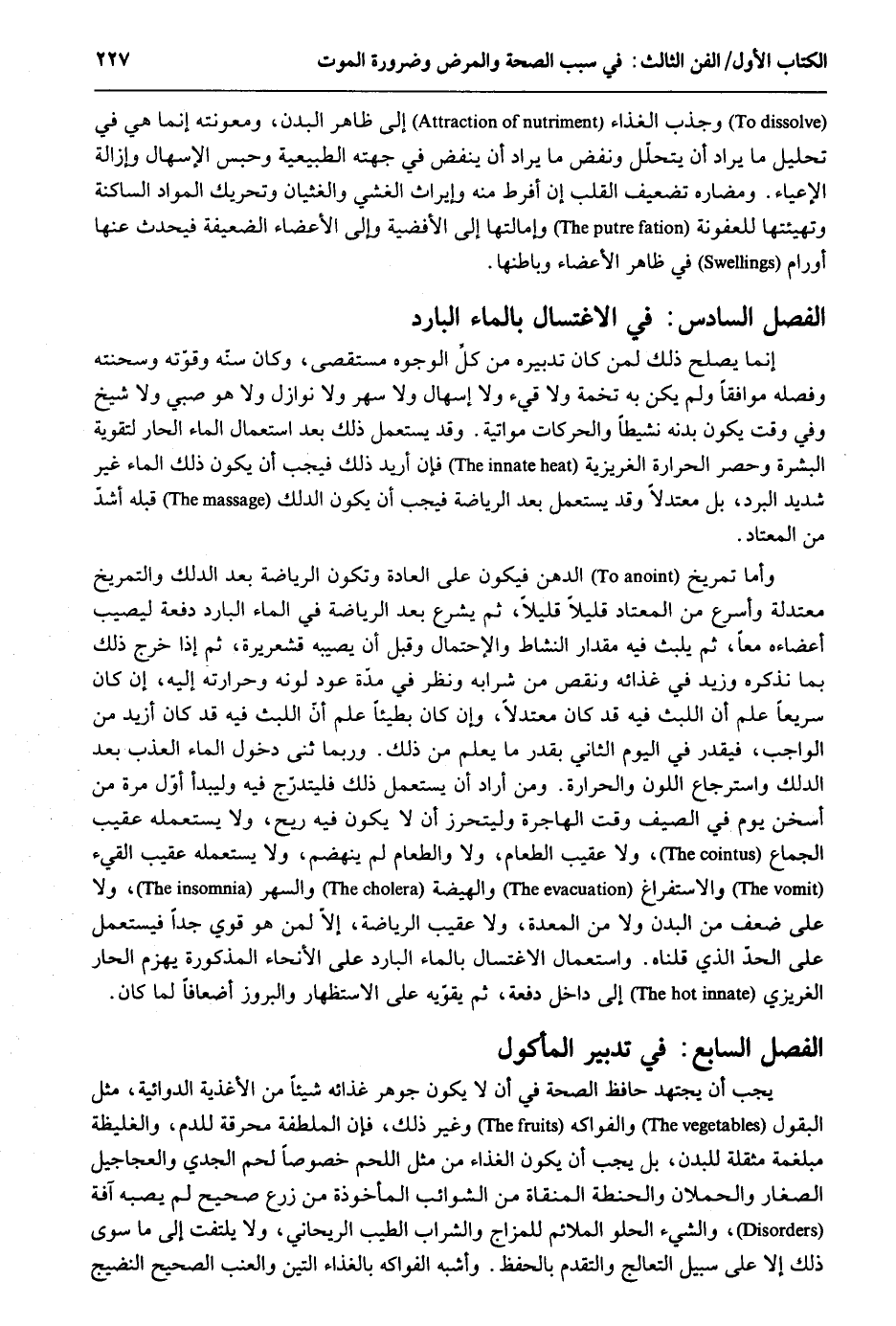 وجذب الْغذَاء إِلَى ظَاهر الْبدن ومعونته إِنَّمَا هِيَ فِي تَحْلِيل مَا يُرَاد أَن يتَحَلَّل ونفض مَا يُرَاد أَن ينفض فِي جِهَته الطبيعية وَحبس الإسهال وإزالته الإعياء. ومضارة تَضْعِيف الْقلب إِن أفرط مِنْهُ وإيراث الغشي والغثيان وتحريك الْموَاد الساكنة وتهيئتها للعفونة وإمالتها إِلَى الأفضية وَإِلَى الْأَعْضَاء الضعيفة فَيحدث عَنْهَا أورام فِي ظَاهر الْأَعْضَاء وباطنها. الْفَصْل السَّادِس الِاغْتِسَال بِالْمَاءِ الْبَارِد إِنَّمَا يصلح ذَلِك لمن كَانَ تَدْبيره من كل الْوُجُوه مستقصى وَكَانَ سنّه وقوته وسحنته وفصله مُوَافقا وَلم يكن بِهِ تخمة وَلَا قيء وَلَا إسهال وَلَا سهر وَلَا نَوَازِل وَلَا هُوَ صبي وَلَا شيخ وَفِي وَقت يكون بدنه نشيطاً والحركات مواتية. وَقد يسْتَعْمل ذَلِك بعد اسْتِعْمَال المَاء الْحَار لتقوية الْبشرَة وَحصر الْحَرَارَة الغريزية فَإِن أُرِيد ذَلِك فَيجب أَن يكون ذَلِك المَاء غير شَدِيد الْبرد بل معتدلاً وَقد يسْتَعْمل بعد الرياضة فَيجب أَن يكون الدَّلْك قبله أشدّ من الْمُعْتَاد. وَأما تمريخ الدّهن فَيكون على الْعَادة وَتَكون الرياضة بعد الدَّلْك والتمريخ معتدلة وأسرع من الْمُعْتَاد قَلِيلا قَلِيلا ثمَّ يشرع بعد الرياضة فِي المَاء الْبَارِد دفْعَة ليصيب أعضاءه مَعًا ثمَّ يلبث فِيهِ مِقْدَار النشاط والإحتمال وَقبل أَن يُصِيبهُ قشعريرة ئم إِذا خرج ذَلِك بِمَا نذكرهُ وَزيد فِي كذائه وَنقص من شرابه وَنظر فِي مُدَّة عود لَونه وحرارته إِلَيْهِ إِن كَانَ سَرِيعا اعدم أَن اللّّبْث فِيهِ قد كَانَ معتدلاً وَأَن كَانَ بطيئاً علم أَن اللّّبْث فِيهِ قد كَانَ أَزِيد من الْوَاجِب فَيقدر فِي الْيَوْم الثَّانِي بِقدر مَا يعلم من ذَلِك. وَرُبمَا ثنى دُخُول المَاء العذب بعد الدَّلْك واسترجاع اللَّوْن والحرارة. وَمن أَرَادَ أَن يسْتَعْمل ذَلِك فليتدرّج فِيهِ وليبدأ أول مرّة من أسخن يَوْم فِي الصَّيف وَقت الهاجرة وليتحرز أَن لَا يكون فِيهِ ريح وَلَا يَسْتَعْمِلهُ عقيب الْجِمَاع وَلَا عقيب الطَّعَام وَلَا وَالطَّعَام لم ينهضم وَلَا يَسْتَعْمِلهُ عقيب الْقَيْء والإستفراغ والهيضة والسهر وَلَا على ضعف من الْبدن وَلَا من الْمعدة وَلَا عقيب الرياضة إلاّ لمن هُوَ قوي جدا فيستعمل على الحدّ الَّذِي قُلْنَاهُ. وَاسْتِعْمَال الِاغْتِسَال بِالْمَاءِ الْبَارِد على الأنحاء الْمَذْكُورَة يهْزم الْحَار الغريزي إِلَى دَاخل دفْعَة ثمَّ يقوّيه على الإستظهار والبروز أضعافاً لما كَانَ.