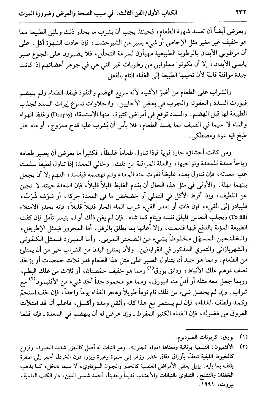ويعرض أَيْضا أَن تفْسد شَهْوَة الطَّعَام فَحِينَئِذٍ يجب أَن يشرب مَا يحذر ذَلِك ويلين الطبيعة مِمَّا هُوَ خَفِيف غير مغير مثل الإجاص أَو شَيْء يسير من الشيرخشت فَإِذا عَادَتْ الشَّهْوَة أكل. على أَن مرطوبي الْأَبدَان بالرطوبة الطبيعية مهيئون لسرعة التَّحَلُّل فَلَا يصبرون على الْجُوع صَبر يابسي الْأَبدَان إِلَّا أَن يَكُونُوا مملوئين من رطوبات غير الَّتِي هِيَ فِي جَوْهَر أعضائهم إِذا كَانَت جَيِّدَة مُوَافقَة قَابِلَة لِأَن تحيلها الطبيعة إِلَى الْغذَاء التَّام بِالْفِعْلِ. وَالشرَاب على الطَّعَام من أضرّ الْأَشْيَاء لِأَنَّهُ سريع الهضم والنفوذ فَينفذ الطَّعَام وَلم ينهضم فيورث السدد والعفونة والجرب فِي بعض الْأَحَايِين. والحلاوات تسرع إيراث السدد لجذب الطبيعة لَهَا قبل الهضم. والسدد توقع فِي أمراض كَثِيرَة مِنْهَا الإستسقاء وَغلظ الْهَوَاء وَالْمَاء لَا سِيمَا فِي الصَّيف مِمَّا يفْسد الطَّعَام فَلَا بَأْس أَن يُشرب عَلَيْهِ قدح ممزوج أَو مَاء حَار طبخ فِيهِ عود ومصطكى. وَمن كَانَت أحَشاؤه حارة قَوِيَّة فَإِذا تنَاول طَعَاما غليظاً فكثيراً مَا يعرض أَن يصير طَعَامه رياحاً ممدة للمعدة ونواحيها وَالْعلَّة المراقبة من ذَلِك. وخالي الْمعدة إِذا تنَاول لطيفاً سلمت عَلَيْهِ معدته فَإِن تنَاول بعده غليظاً نفرت عَنهُ الْمعدة وَلم تهضمه فَيفْسد اللَّهُمَّ إِلَّا أَن يَجْعَل بَينهمَا مهلة. وَالْأولَى فِي مثل هَذِه الْمحَال أَن يقدم الغليظ قَلِيلا قَلِيلا فَإِن الْمعدة حِينَئِذٍ لَا تجبن عَن اللطيفط وَإِذا أفرط الْأكل فِي التملي أَو خضخض مَا فِي الْمعدة حَرَكَة أَو شوشه شرب فليبادر إِلَى الْقَيْء فَإِن فَاتَ أَو تعذر الْقَيْء شرب المَاء الْحَار قَلِيلا قَلِيلا فَإِنَّهُ يحدر الامتلاء ويجلب النعاس فليلق نَفسه وينام كَمَا شَاءَ. فَإِن لم يغن ذَلِك أَو لم يَتَيَسَّر تَأمل فَإِن كفت الطبيعة الْمُؤْنَة بِالدفع فِيهَا فنعمت وَإِلَّا أعانها مِمَّا يُطلق بالرفق. أما المحرور فبمثل الإطريفل والخلنجين المسفل مخلوطاً بِشَيْء من الصعتر المربى. وَأما المبرود فبمثل الكموني والشهربازاني والتمري الْمَذْكُور فِي القراباذين. وَلِأَن يمتلىء الْبدن من الشَّرَاب خير من أَن يمتلىء من الطَّعَام. وَمِمَّا هُوَ جيد أَن يتَنَاوَل الصَّبْر على مثل هَذَا الطَّعَام قدر ثَلَاث حمصات أَو يُؤْخَذ نصف دِرْهَم علك الأنباط ودانق بورق وَمِمَّا هُوَ خَفِيف حمصتان أَو ثَلَاث من علك البطم وَرُبمَا جعل مَعَه مثله أَو أقل مِنْهُ البورق وَمِمَّا هُوَ مَحْمُود جدا أَخذ شَيْء من الأفثيمون مَعَ شراب. وَإِن لم يحصل شَيْء من ذَلِك نَام نوماً طَويلا وهجر الْغذَاء يومأ وَاحِدًا فَإِن خف استحم وكمد ولطف الْغذَاء فَإِن لم يسْتَمر مَعَ هَذَا كُله وأثقل ومدد وكسل فَاعْلَم أَنه قد امْتَلَأت الْعُرُوق من فضوله فَإِن الْغذَاء الكثيرٍ المفرط وَإِن عرض لَهُ أَن ينهضم فِي الْمعدة فَإِنَّهُ قَلما