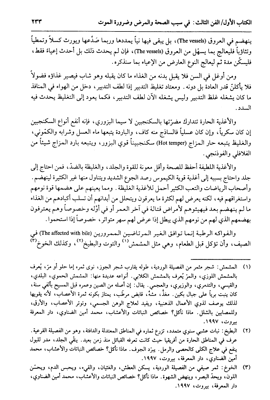 ينهضم فِي الْعُرُوق بل يبْقى فِيهَا نياً يممدها وَرُبمَا صدَعها وَيُورث كسلاً وتمطياً وتثاؤباً فليعالج بِمَا يسهل من الْعُرُوق فَإِن لم يحدث ذَلِك بل أحدث إعياءً فَقَط فليسكن مُدَّة ثمَّ ليعالج النَّوْع الْعَارِض من الإعياء بِمَا سَنذكرُهُ. وَمن أوغل فِي السن فَلَا يقبل بده من الْغذَاء مَا كَانَ يقبله وَهُوَ شَاب فَيصير غذاءه فضولاً فَلَا يأكلن قدر الْعَادة بل دونه. ومعتاد تَغْلِيظ التَّدْبِير إِذا لطف التَّدْبِير دخل من الْهَوَاء فِي المنافذ مَا كَانَ يشْغلهُ غلظ التَّدْبِير وَلَيْسَ يشْغلهُ الْآن لطف التَّدْبِير فَكَمَا يعود إِلَى التَّغْلِيظ يحدث فِيهِ السدد. والأغذية الحارة تتدارك مضرتها بالسكنجبين لَا سِيمَا الْبزورِي فَإِنَّهُ أَنْفَع أَنْوَاع السكنجبين إِن كَانَ سكرياً وَإِن كَانَ عسلياً فالساذج مِنْهُ كَاف والباردة يتبعهَا مَاء الْعَسَل وَشَرَابه والكموني والغليظ يتبعهُ حَار المزاج سكنجبيناً قوي البزور ويتبعه بَارِد المزاج شَيْئا من الفلافلي والفوذنجي. والأغذية اللطيفة أحفظ للصِّحَّة وأفل مَعُونَة للقوة وَالْجَلد والغليظة بالضد فَمن احْتَاجَ إِلَى جلد وَاحْتَاجَ بِسَبَبِهِ إِلَى أغذية قَوِيَّة الكيموس رصد الْجُوع الشَّديد ويتناول مِنْهَا غير الْكَثِيرَة لينهضم. وَأَصْحَاب الرياضات والتعب الْكثير أحمل للاغذية الغليظة. وَمِمَّا يعينهم على هضمها قُوَّة نومهم واستغراقهم فِيهِ لكنه يعرض لَهُم لِكَثْرَة مَا يعْرفُونَ ويتحلل من أبدانهم أَن تسلب أكبادهم من الْغذَاء مَا لم ينهضم بعد فيهيئوهم لأمراض قتالة فِي آخر الْعُمر أَو فِي أَوله وخصوصاً وهم يعترفون بهضمهم الَّذِي لَهُم من نومهم الَّذِي يبطل إِذا عرض لَهُم سهر متواتر خُصُوصا إِذا استحموا. والفواكه الرّطبَة إِنَّمَا توَافق الْغَيْر المرتاضين الممرورين فِي الصَّيف وَأَن تُؤْكَل قبل الطَّعَام وَهِي مثل المشمش والتوت والبطيخ وَكَذَلِكَ الخوخ