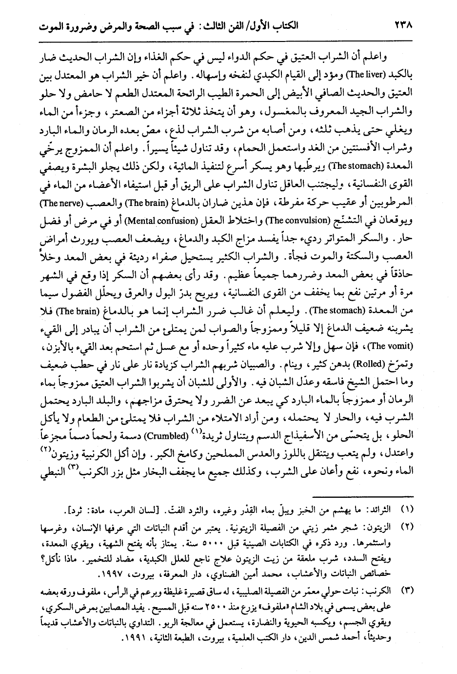 وَاعْلَم أَن الشَّرَاب الْعَتِيق فِي حكم الدَّوَاء لَيْسَ فِي حكم الْغذَاء وَإِن الشَّرَاب الحَدِيث ضار بالكبد ومؤد إِلَى الْقيام الكبدي لنفخه وإسهاله. وَاعْلَم أَن خير الشَّرَاب هُوَ المعتدل بَين الْعَتِيق والْحَدِيث الصافي الْأَبْيَض إِلَى الْحمرَة الطّيب الرَّائِحَة المعتدل الطّعْم لَا حامض وَلَا حُلْو وَالشرَاب الْجيد الْمَعْرُوف بالمغسول وَهُوَ أَن يتَّخذ ثَلَاثَة أَجزَاء من السعتر وجزءاً من المَاء ويغلي حَتَّى يذهب ثلثه وَمن أَصَابَهُ من شرب الشَّرَاب لذع مصّ بعده الرُّمَّان وَالْمَاء الْبَارِد وشراب الإفسنتين من الْغَد وَاسْتعْمل الْحمام وَقد تنَاول شَيْئا يَسِيرا. وَاعْلَم أَن الممزوج يرخّي الْمعدة ويرطّبها وَهُوَ يسكر أسْرع لتنفيذ المائية وَلَكِن ذَلِك يجلو الْبشرَة ويصفي القوى النفسانية وليجتنب الْعَاقِل تنَاول الشَّرَاب على الرِّيق أَو قبل اسْتِيفَاء الْأَعْضَاء من المَاء فِي المرطوبين أَو عقيب حَرَكَة مفرطة فَإِن هذَيْن ضاران بالدماغ والعصب ويوقعان فِي التشنّج واختلاط الْعقل أَو فِي مرض أَو فضل حَار. وَالسكر الْمُتَوَاتر رَدِيء جدا يفْسد مزاج الكبد والدماغ ويضعف العصب وَيُورث أمراض العصب والسكتة وَالْمَوْت فَجْأَة. وَالشرَاب الْكثير يَسْتَحِيل صفراء رَدِيئَة فِي بعض الْمعد وخلا حاذقاً فِي بعض الْمعد وضررهما جَمِيعًا عَظِيم. وَقد رأى بَعضهم أَن السكر إِذا وَقع فِي الشَّهْر مرّة أَو مرَّتَيْنِ نفع بِمَا يُخَفف من القوى النفسانية ويريح بدر الْبَوْل والعرق ويحلل الفضول سِيمَا من الْمعدة. وليعلم أَن غَالب ضَرَر الشَّرَاب إِنَّمَا هُوَ بالدماغ فَلَا يشربنه ضَعِيف الدِّمَاغ إِلَّا قَلِيلا وممزوجاً وَالصَّوَاب لمن يمتلىء من الشَّرَاب أَن يُبَادر إِلَى الْقَيْء فَإِن سهل وَإِلَّا شرب عَلَيْهِ مَاء كثيرا وَحده أَو مَعَ عسل ثمَّ استحم بعد الْقَيْء بالأبزن وتمرخ بدهن كثير وينام. وَالصبيان شربهم الشَّرَاب كزيادة نَار على نَار فِي حطب ضَعِيف وَمَا احْتمل الشَّيْخ فاسقه وَعدل الشبَّان فِيهِ. وَالْأولَى للشبان أَن يشْربُوا الشَّرَاب الْعَتِيق ممزوجاً بِمَاء الرُّمَّان أَو ممزوجاً بِالْمَاءِ الْبَارِد كي يبعد عَن الضَّرَر وَلَا يَحْتَرِق مزاجهم والبلد الْبَارِد يحْتَمل الشّرْب فِيهِ والحار لَا يحْتَملهُ وَمن أَرَادَ الامتلاء من الشَّرَاب فَلَا يمتلىء من الطَّعَام وَلَا يَأْكُل الحلو بل يتحسى من الأسفيذاح الدسم ويتناول ثريدة دسمة وَلَحْمًا دسماً مجزعاً واعتدل وَلم يتعب ويتنقل باللوز والعدس المفلحين وكامخ الْكبر وَإِن أكل الكرنبية وزيتون المَاء وَنَحْوه نفع وأعان على الشّرْب وَكَذَلِكَ جَمِيع مَا يجفف البخار مثل بزر الكرنب النبطي