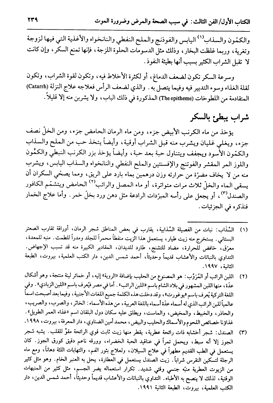 والكمّون والسذاب الْيَابِس والفوذنج وَالْملح النفطي والنانخواه والأغذية الَّتِي فِيهَا لزوجة وتغرية وَرُبمَا غلظت البخار وَذَلِكَ مثل الدسومات الحلوة اللزجة فَإِنَّهَا تمنع السكر وَإِن كَانَت لَا تقبل الشَّرَاب الْكثير بِسَبَب أَنَّهَا بطيئة النّفُوذ. وَسُرْعَة السكر تكون لضعف الدِّمَاغ أَو لِكَثْرَة الأخلاط فِيهِ وَتَكون لقُوَّة الشَّرَاب وَتَكون لقلَّة الْغذَاء وَسُوء التَّدْبِير فِيهِ وَفِيمَا يتَّصل بِهِ. وَالَّذِي لضعف الرَّأْس فعلاجه علاج النزلة المتقادمة من اللطوخات الْمَذْكُورَة فِي ذَلِك الْبَاب وَلَا يشربن مِنْهُ إِلَّا قَلِيلا. شراب يبطىء بالسكر. يُؤْخَذ من مَاء الكرنب الْأَبْيَض جُزْء وَمن مَاء الرُّمَّان الحامض جُزْء وَمن الْخلّ نصف جُزْء ويغلي غليات وَيشْرب مِنْهُ قبل الشَّرَاب أُوقِيَّة وَأَيْضًا يتَّخذ حب من الْملح والسذاب والكمون الْأسود ويجفف ويتناول حَبَّة بعد حَبَّة وَأَيْضًا يُؤْخَذ بزر الكرنب النبطي والكمُون واللوز المر المقشر والفوتنج والإفسنتين وَالْملح النفطي والنانخواه والسذاب الْيَابِس وَيشْرب مِنْهُ من لَا يخَاف مضرَّة من حرارته وزن دِرْهَمَيْنِ بِمَاء بَارِد على الرِّيق وَمِمَّا يصحي السَّكْرَان أَن يسقى المَاء والخل ثَلَاث مَرَّات متواترة أَو مَاء المصل والرائب الحامض ويتشمم الكافور والصندل أَو يَجْعَل على رَأسه المبردات الرادعة مثل دهن ورد بخل خمر. وَأما علاج الْخمار فنذكره فِي الجزئيات.