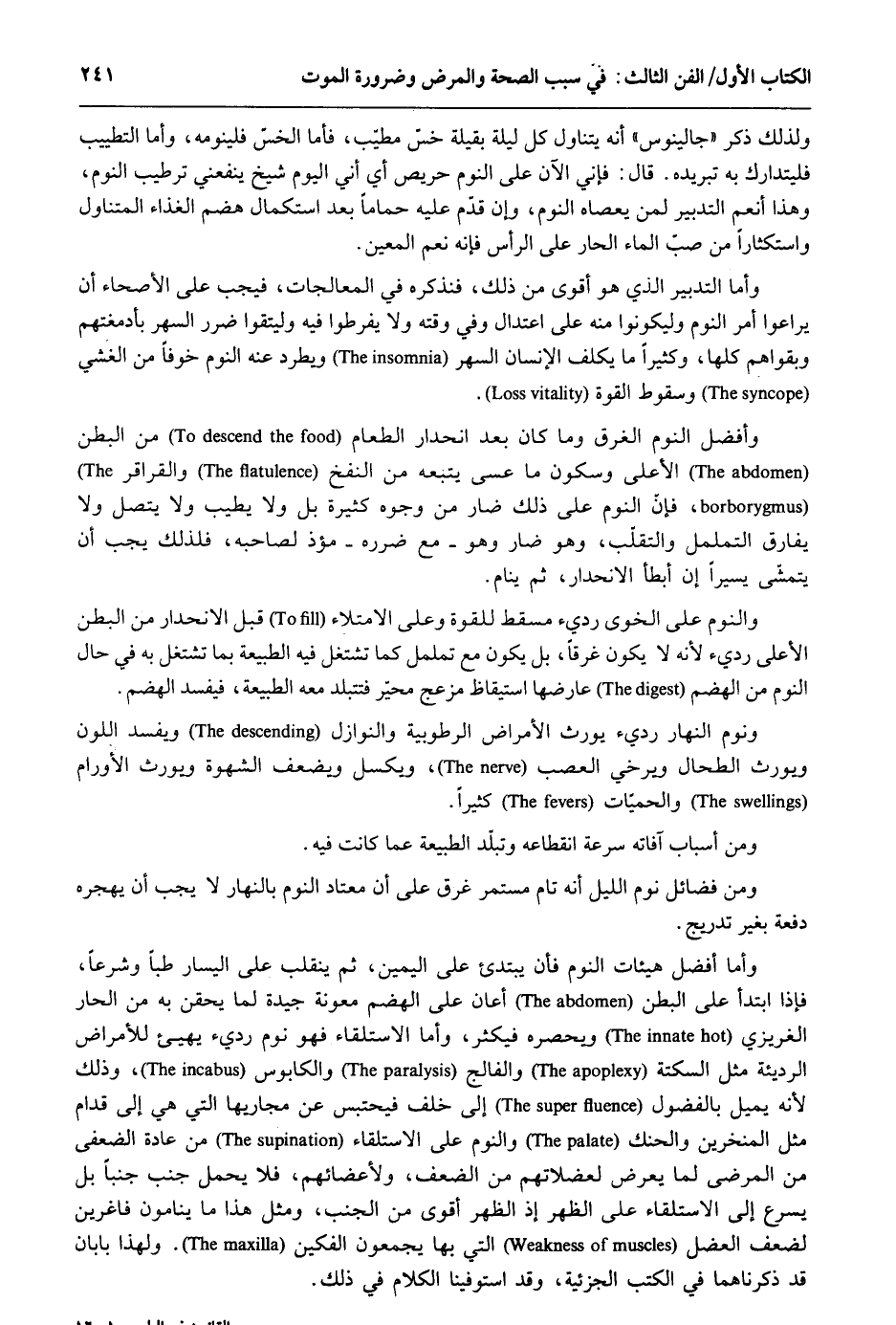 وَلذَلِك ذكر جالينوس أَنه يتَنَاوَل كل لَيْلَة بقيلة خس مُطيب فَأَما الخس فلينومه وَأما التطييب فليتدارك بِهِ تبريده. قَالَ: فَإِنِّي الْآن على النّوم حَرِيص أَي أَنِّي الْيَوْم شيخ يَنْفَعنِي ترطيب النّوم وَهَذَا أنعم التَّدْبِير لمن يعصاه النّوم وَإِن قدم عَلَيْهِ حَماما بعد استكمال هضم الْغذَاء المتناول واستكثاراً من صب المَاء الْحَار على الرَّأْس فَإِنَّهُ نعم الْمعِين. وَأما التَّدْبِير الَّذِي هُوَ أقوى من ذَلِك فنذكره فِي المعالجات فَيجب على الأصحاء أَن يراعوا أَمر النّوم وليكونوا مِنْهُ على اعْتِدَال وَفِي وقته وَلَا يفرطوا فِيهِ وليتقوا ضَرَر السهر بأدمغتهم وبقواهم كلهَا وَكَثِيرًا مَا يُكَلف الْإِنْسَان السهر ويطرد عَنهُ النّوم خوفًا من الغشي وَسُقُوط الْقُوَّة. وَأفضل النّوم الْغَرق وَمَا كَانَ بعد إنحدار الطَّعَام من الْبَطن الْأَعْلَى وَسُكُون مَا عَسى يتبعهُ من النفخ والقراقر فَإِن النّوم على ذَلِك ضار من وُجُوه كَثِيرَة بل وَلَا يطيب وَلَا يتَّصل وَلَا يُفَارق التململ والتقلب وَهُوَ ضار وَهُوَ مَعَ ضَرَره مؤذ لصَاحبه فَلذَلِك يجب أَن يتمشى يَسِيرا إِلَى وَالنَّوْم على الخوى رَدِيء مسْقط للقوة وعَلى الامتلاء قبل الانحدار من الْبَطن الْأَعْلَى رَدِيء لِأَنَّهُ لَا يكون غرقاً بل يكون مَعَ تململ كَمَا تشتغل فِيهِ الطبيعة بِمَا تشتغل بِهِ فِي حَال النّوم من الهضم عارضها استيقاظ مزعج محيّر فتتبلد مَعَه الطبيعة فَيفْسد الهضم. ونوم النَّهَار رَدِيء يُورث الْأَمْرَاض الرطوبية والنوازل وَيفْسد اللَّوْن وَيُورث الطحال ويرخي العصب ويكسل ويضعف الشَّهْوَة وَيُورث الأورام والحميات كثيرا. وَمن أَسبَاب آفاته سرعَة انْقِطَاعه وتبلد الطبيعة عَمَّا كَانَت فِيهِ. وَمن فَضَائِل نوم اللَّيْل أَنه تَامّ مُسْتَمر غرق على أَن مُعْتَاد النّوم بِالنَّهَارِ لَا يجب أَن يهجره دفْعَة بِغَيْر تدريج. وَأما أفضل هيئات النّوم فَأن يبتدىء على الْيَمين ثمَّ يَنْقَلِب على الْيَسَار طِبًّا وَشرعا فَإِذا ابْتَدَأَ على الْبَطن أعَان على الهضم مَعُونَة جَيِّدَة لما يحقن بِهِ من الْحَار الغريزي ويحصره فيكثر وَأما الاستلقاء فَهُوَ نوم رَدِيء يهيىء للأمراض الرَّديئَة مثل السكتة والفالج والكابوس وَذَلِكَ لِأَنَّهُ يمِيل بالفضول إِلَى خلف فيحتبس عَن مجاريها الَّتِي هِيَ إِلَى قُدَّام مثل المنخرين والحنك وَالنَّوْم على الإستلقاء من عَادَة الضعفى من المرضى لما يعرض لعضلاتهم من الضعْف ولأعضائهم فَلَا يحمل جنب جنبا بل يسْرع إِلَى الاستلقاء على الظّهْر إِذْ الظّهْر أقوى من الْجنب وَمثل هَذَا مَا ينامون فاغرين لضعف العضل الَّتِي بهَا يجمعُونَ الفكين. وَلِهَذَا بَابَانِ قد ذكرناهما فِي الْكتب الْجُزْئِيَّة وَقد اسْتَوْفَيْنَا الْكَلَام فِي ذَلِك.