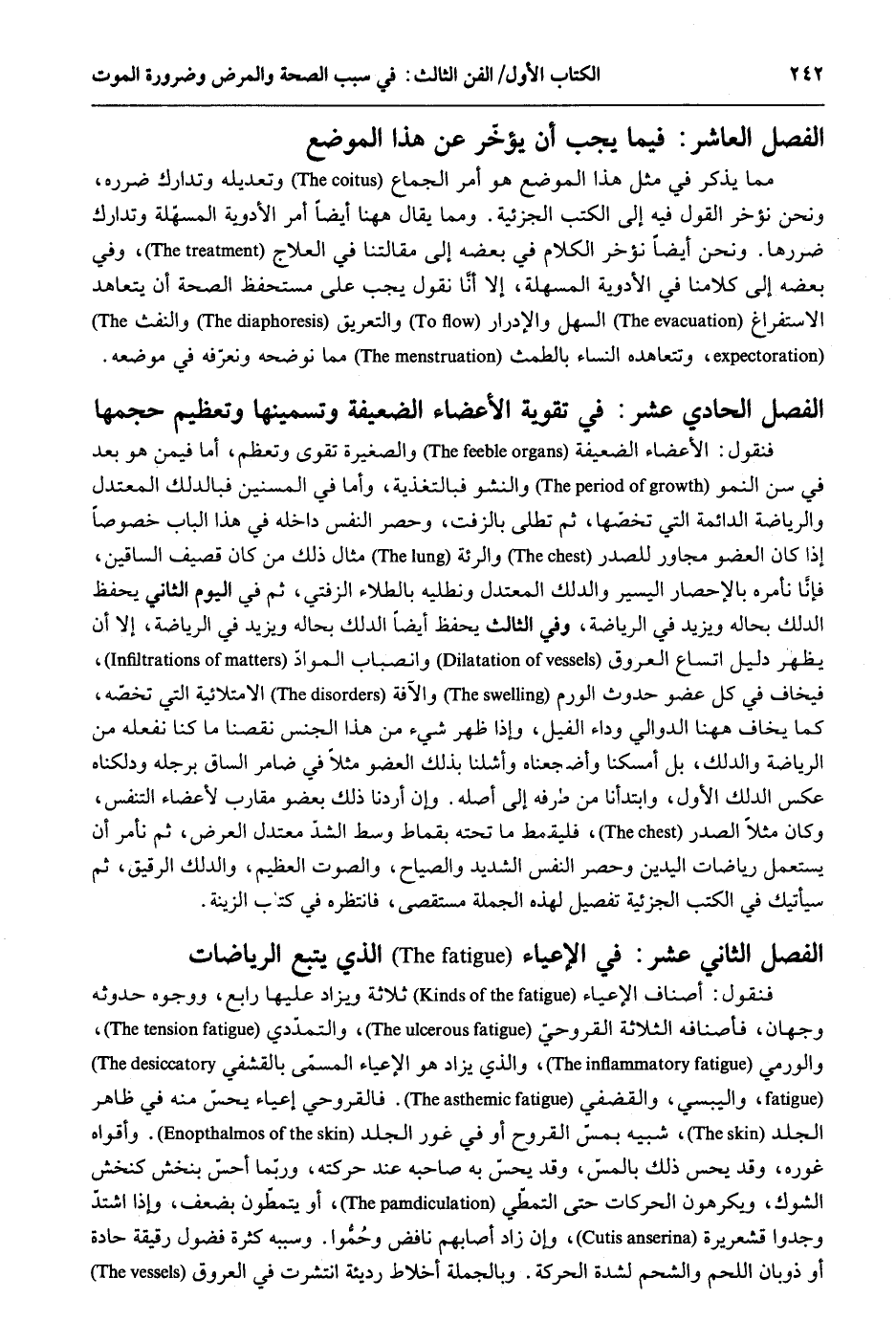 الْفَصْل الْعَاشِر فِيمَا يجب أَن يُؤَخر عَن هَذَا الْموضع مِمَّا يذكر فِي مثل هَذَا الْموضع هُوَ أَمر الْجِمَاع وتعديله وتدارك ضَرَره وَنحن نؤخر القَوْل فِيهِ إِلَى الْكتب الْجُزْئِيَّة. وَمِمَّا يُقَال هَهُنَا أَيْضا أَمر الْأَدْوِيَة المسهلة وتدارك ضررها. وَنحن أَيْضا نؤخر الْكَلَام فِي بعضه إِلَى مقالتنا فِي العلاج وَفِي بعضه إِلَى كلامنا فِي الْأَدْوِيَة المسهلة إِلَّا أنَّا نقُول يجب على مستحفظ الصِّحَّة أَن يتَعَاهَد الاستفراغ السهل والإدرار والتعريق والنفث وتتعاهده النِّسَاء بالطمث مِمَّا نوضحه ونعرفه فِي مَوْضِعه. الْفَصْل الْحَادِي عشر تَقْوِيَة الْأَعْضَاء الضعيفة وتسمينها وتعظيم حجمها فَنَقُول: الْأَعْضَاء الضعيفة وَالصَّغِيرَة تقوى وتعظم أما فِيمَن هُوَ بعد فِي سنّ النمو والنشو فبالتغذية وَأما فِي المسنين فبالدلك المعتدل والرياضة الدائمة الَّتِي تخصّها ثمَّ تطلى بالزفت وَحصر النَّفس دَاخله فِي هَذَا الْبَاب خُصُوصا إِذا كَانَ الْعُضْو مجاور للصدر والرئة مِثَال ذَلِك من كَانَ قصيف السَّاقَيْن فَإنَّا نأمره بالإحصار الْيَسِير والدلك المعتدل ونطليه بالطلاء الزفتي ثمَّ فِي الْيَوْم الثَّانِي يحفظ الدَّلْك بِحَالهِ وَيزِيد فِي الرياضة وَفِي الثَّالِث يحفظ أَيْضا الدَّلْك بِحَالهِ وَيزِيد فِي الرياضة إِلَّا أَن يظْهر دَلِيل اتساع الْعُرُوق وانصباب الموادّ فيخاف فِي كل عُضْو حُدُوث الورم والآفة الامتلائية الَّتِي تخصه كَمَا يخَاف هَهُنَا الدوالي وداء الْفِيل وَإِذا ظهر شَيْء من هَذَا الْجِنْس نقصنا مَا كُنَّا نفعله من الرياضة والدلك بل أمسكنا واضجعناه وأشلنا بذلك الْعُضْو مثلا فِي ضامر السَّاق بِرجلِهِ ودلكناه عكس الدَّلْك الأول وابتدأنا من طرفه إِلَى أَصله. وَإِن أردنَا ذَلِك بعضو مقارب لأعضاء التنفس وَكَانَ مثلا الصَّدْر فليقمط مَا تَحْتَهُ بقماط وسط الشد معتدل الْعرض ثمَّ نأمر أَن يسْتَعْمل رياضات الْيَدَيْنِ وَحصر النَّفس الشَّديد والصياح وَالصَّوْت الْعَظِيم والدلك الرَّقِيق ثمَّ سيأتيك فِي الْكتب الْجُزْئِيَّة تَفْصِيل لهَذِهِ الْجُمْلَة مستقصى فانتظره فِي كتاب الزِّينَة. الْفَصْل الثَّانِي عشر الإعياء الَّذِي يتبع الرياضات فَنَقُول: أَصْنَاف الإعياء ثَلَاثَة وَيُزَاد عَلَيْهَا رَابِع ووجوه حُدُوثه وَجْهَان فأصنافه الثَّلَاثَة القروحي والتمددي والورمي وَالَّذِي يُزَاد هُوَ الإعياء الْمُسَمّى بالقشفي واليبسي والقضفي. فالقروحي إعياء يحسن مِنْهُ فِي ظَاهر الْجلد شَبيه بمسّ القروح أَو فِي غور الْجلد. وأقواه غوره وَقد يحس ذَلِك بالمس وَقد يحسّ بِهِ صَاحبه عِنْد حركته وربّما أحسّ بنخش كنخش الشوك ويكرهون الحركات حَتَّى التمطي أَو يتمطون بِضعْف وَإِذا اشتدّ وجدوا قشعريرة وَإِن زَاد أَصَابَهُم نافض وحمُوا. وَسَببه كَثْرَة فضول رقيقَة حادة أَو ذوبان اللَّحْم والشحم لشدَّة الْحَرَكَة. وَبِالْجُمْلَةِ أخلاط رَدِيئَة انتشرت فِي الْعُرُوق