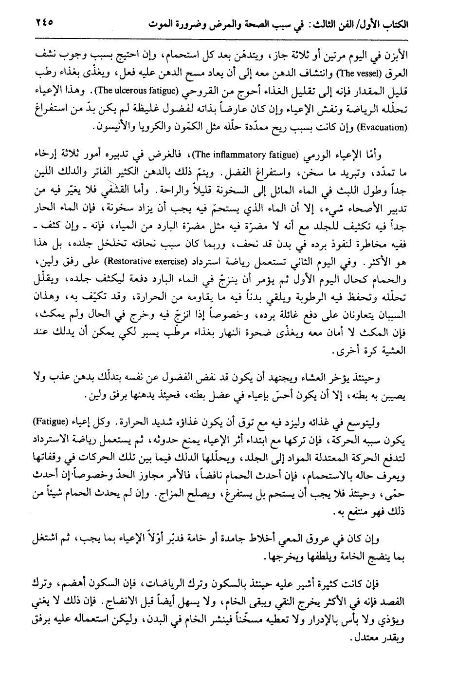 الأبزن فِي الْيَوْم مرَّتَيْنِ أَو ثَلَاثَة جَازَ ويتدهن بعد كل استحمام وان احْتِيجَ بِسَبَب وجوب نشف الْعرق وانتشاف الدّهن مَعَه إِلَى أَن يُعَاد مسح الدّهن عَلَيْهِ فعل ويغذّى بغذاء رطب قَلِيل الْمِقْدَار فَإِنَّهُ إِلَى تقليل الْغذَاء أحْوج من القروحي. وَهَذَا الإعياء تحلله الرياضة وتفش الإعياء وَإِن كَانَ عارضاً بِذَاتِهِ لفضول غَلِيظَة لم يكن بُد من استفراغ وَإِن كَانَت ريح ممدّدة حلله مثل الكمون والكرويا والأنيسون. وأتا الإعياء الورمي فالغرض فِي تَدْبيره أُمُور ثَلَاثَة إرخاء مَا تمدد وتبريد مَا سخن واستفراغ الْفضل. وَيتم ذَلِك بالدهن الْكثير الفاتر والدلك اللين جدا وَطول اللّّبْث فِي المَاء المائل إِلَى السخونة قَلِيلا والراحة. وَأما القشفي فَلَا يُغير فِيهِ من تَدْبِير الأصحاء شَيْء إِلَّا أَن المَاء الَّذِي يستحمّ فِيهِ يجب أَن يُزَاد سخونة فَإِن المَاء الْحَار جدا فِيهِ تكثيف للجلد مَعَ أَنه لَا مضرَّة فِيهِ مثل مضرَّة الْبَارِد من الْمِيَاه فَإِنَّهُ وَإِن كثف فَفِيهِ مخاطرة لنفوذ برده فِي بدن قد نحف وَرُبمَا كَانَ سَبَب نحافته تخلخل جلده بل هَذَا هُوَ الْأَكْثَر وَفِي الْيَوْم الثَّانِي تسْتَعْمل رياضة اسْتِرْدَاد على رفق ولين وَالْحمام كَحال الْيَوْم الأول ثمَّ يُؤمر أَن ينزج فِي المَاء الْبَارِد دفْعَة ليكثف جلده ويقلل تحلله وَتحفظ فِيهِ الرُّطُوبَة ويلقي بدناً فِيهِ مَا يقاومه من الْحَرَارَة وَقد تكيف بِهِ وَهَذَانِ السببان يتعاونان على دفع غائلة برده وخصوصاً إِذا انزج فِيهِ وَخرج فِي الْحَال وَلم يمْكث فَإِن الْمكْث لَا أَمَان مَعَه ويغذى ضحوة النَّهَار بغذاء مرطب يسير لكَي يُمكن أَن يدلك عِنْد العشية كرة أُخْرَى. وَحِينَئِذٍ يُؤَخر الْعشَاء ويجتهد أَن يكون قد نفض الفضول عَن نَفسه بتدلك بدهن عذب وَلَا يصيبن بِهِ بَطْنه إِلَّا أَن يكون أحس بأعياء فِي عضل بَطْنه فَحِينَئِذٍ يدهنها بِرِفْق ولين. وليتوسع فِي غذائه وليزد فِيهِ مَعَ توق أَن يكون غذاؤه شَدِيد الْحَرَارَة. وكل إعياء يكون سَببه الْحَرَكَة فَإِن تَركهَا مَعَ ابْتِدَاء أثر الإعياء يمْنَع حُدُوثه ثمَّ يسْتَعْمل رياضة الِاسْتِرْدَاد لتدفع الْحَرَكَة المعتدلة الْموَاد إِلَى الْجلد ويحلَلها الدَّلْك فِيمَا بَين تِلْكَ الحركات فِي وقفاتها وَيعرف حَاله بالاستحمام فَإِن أحدث الْحمام نافضاً فَالْأَمْر مجاوز الْحَد وخصوصاً إِن أحدث حمى وَحِينَئِذٍ فَلَا يجب أَن يستحم بل يستفرغ وَيصْلح المزاج. وَإِن لم يحدث الْحمام أَيْضا شَيْئا من ذَلِك فهومنتفع بِهِ. وَإِن كَانَ فِي عروق المعي أخلاط جامدة أَو خامة فدبر أَولا الإعياء بِمَا يجب ثمَّ اشْتغل بِمَا ينضج الخامة ويلطفها ويخرجها. فَإِن كَانَت كَثِيرَة أُشير عَلَيْهِ حِينَئِذٍ بِالسُّكُونِ وَترك الرياضات فَإِن السّكُون أهضم وَترك الفصد فَإِنَّهُ فِي الْأَكْثَر يخرج النقي ويبقي الخام وَلَا يسهل أَيْضا قبل الانضاج فَإِن ذَلِك لَا يُغني ويؤذي وَلَا بَأْس بالإدرار وَلَا تعطيه مسخناً فينشر الخام فِي الْبدن وَليكن اسْتِعْمَاله عَلَيْهِ بِرِفْق وبقدر معتدل.