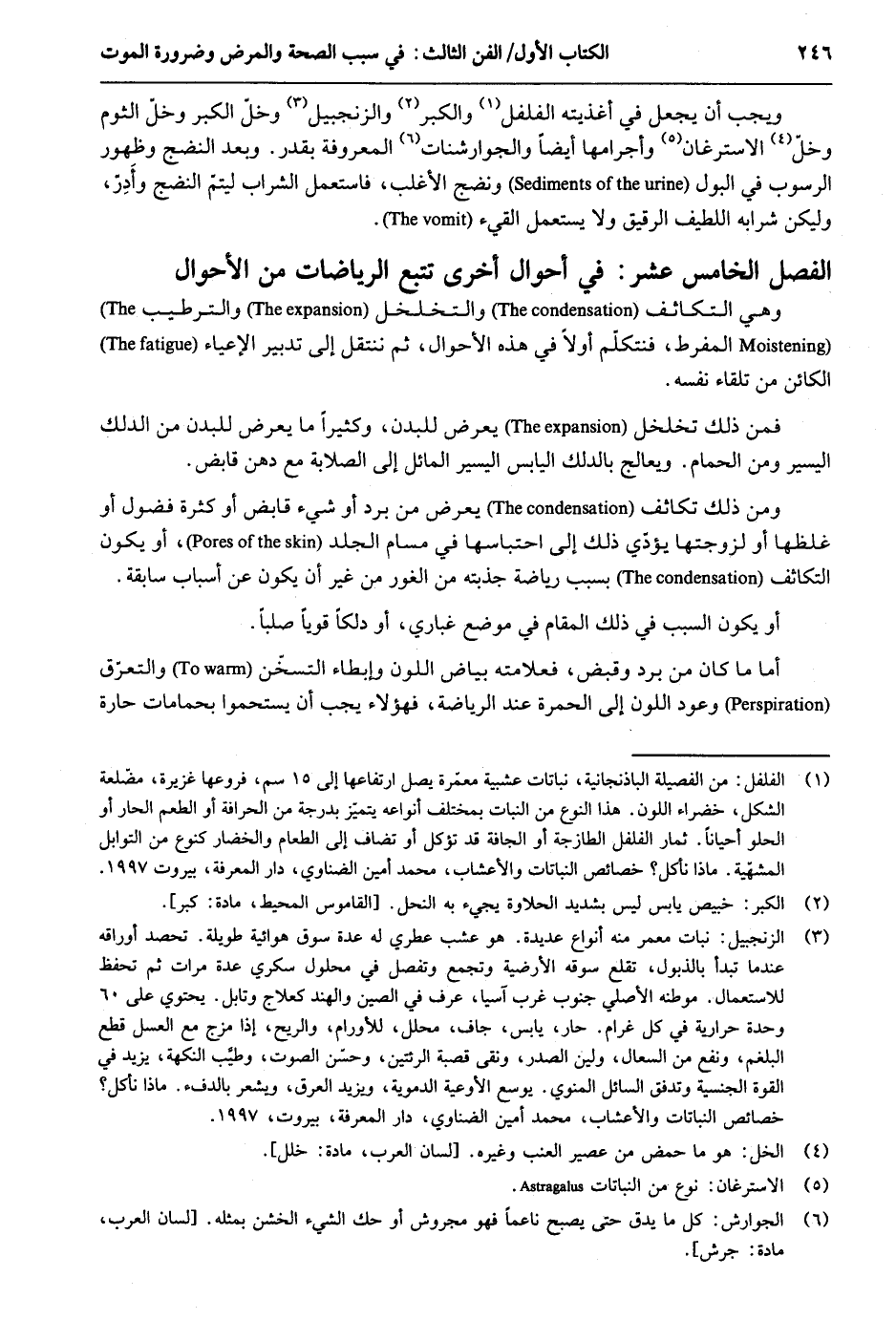 وَيجب أَن يَجْعَل فِي أغذيته الفلفل وَالْكبر والزنجبيل وخل الْكبر وخل الثوم وخل الاسترغان وأجرامها أَيْضا والجوارشنات الْمَعْرُوفَة بِقدر. وَبعد النضج وَظُهُور الرسوب فِي الْبَوْل ونضج الْأَغْلَب فَاسْتعْمل الشَّرَاب ليتم النضج وأدر وَليكن شرابه اللَّطِيف الرَّقِيق وَلَا يسْتَعْمل الْقَيْء. الْفَصْل الْخَامِس عشر أَحْوَال أُخْرَى تتبع الرياضات من الْأَحْوَال وَهِي التكاثف والتخلخل والترطيب المفرط فنتكلم أَولا فِي هَذِه الْأَحْوَال ثمَّ ننتقل إِلَى تَدْبِير الإعياء الْكَائِن من تِلْقَاء نَفسه. فَمن ذَلِك تخلخل يعرض للبدن وَكَثِيرًا مَا يعرض للبدن من الدَّلْك الْيَسِير وَمن الْحمام. ويعالج بالدلك الْيَابِس الْيَسِير المائل إِلَى الصلابة مَعَ دهن قَابض وَمن ذَلِك تكاثف يعرض عَن برد أَو شَيْء قَابض أَو كَثْرَة فضول أَو غلظها أَو لزوجتها يُؤَدِّي ذَلِك إِلَى احتباسها فِي مسام الْجلد أَو يكون التكاثف بِسَبَب رياضة جذبته من الْغَوْر من غير أَن يكون عَن أَسبَاب سَابِقَة. أَو يكون السَّبَب فِي ذَلِك الْمقَام فِي مَوضِع غباري أَو دلكا قَوِيا صلباً. أما كَانَ من برد وَقبض فعلامته بَيَاض اللَّوْن وإبطاء التسخن والتعرق وعود اللَّوْن إِلَى الْحمرَة عِنْد الرياضة فَهَؤُلَاءِ يجب أَن يستحموا بحمامات حارة