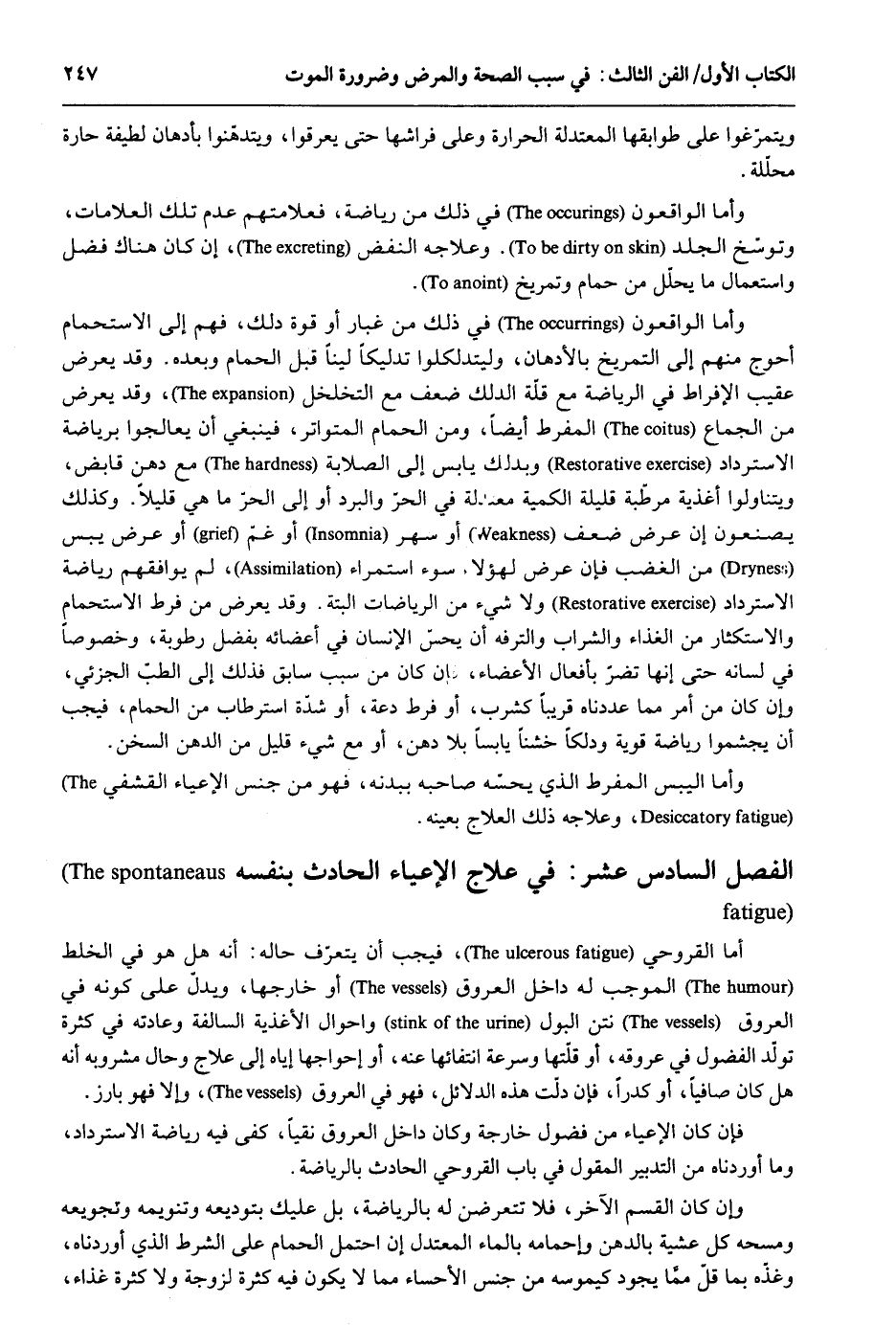 ويتمرغوا على طوابقها المعتدلة الْحَرَارَة وعَلى فراشها حَتَّى يعرقوا ويتدهنوا بأدهان لَطِيفَة حارة محللة. وَأما الواقعون فِي ذَلِك من رياضة فعلامتهم عدم تِلْكَ العلامات وتوسّخ الْجلد. وعلاجه النفض إِن كَانَ هُنَاكَ فضل وَاسْتِعْمَال مَا يحلل من حمام وتمريخ. وَأما الواقعون فِي ذَلِك من كبار أَو قُوَّة ذَلِك فهم إِلَى الإستحمام أحْوج مِنْهُم إِلَى التمريخ بالأدهان وليتدكلوا تدليكاً لينًا قبل الْحمام وَبعده. وَقد يعرض عقيب الإفراط فِي الرياضة مَعَ قلَّة الدَّلْك ضعف مَعَ التخلخل وَقد يعرض من الْجِمَاع المفرط أَيْضا وَمن الْحمام الْمُتَوَاتر فَيَنْبَغِي أَن يعالجوا برياضة الِاسْتِرْدَاد وبدلك يَابِس إِلَى الصلابة مَعَ دهن قَابض ويتناولوا أغذية مرطبة قَليلَة الكمية معتدلة فِي الْحر وَالْبرد أَو إِلَى الْحر مَا هِيَ قَلِيلا. وَكَذَلِكَ يصنعون إِن عرض ضعف أَو سهر أَو غم أَو عرض يبس من الْغَضَب فَإِن عرض لهَؤُلَاء سوء استمراء لم يوافقهم رياضة الِاسْتِرْدَاد وَلَا شَيْء من الرياضات الْبَتَّةَ. وَقد يعرض من فرط الاستحمام والاستكثار من الْغذَاء وَالشرَاب والترفه أَن يحس الْإِنْسَان فِي أَعْضَائِهِ بِفضل رُطُوبَة وخصوصاً فِي لِسَانه حَتَّى إِنَّهَا تضر بِأَفْعَال الْأَعْضَاء فَإِن كَانَ من سَبَب سَابق فَذَلِك إِلَى الطِّبّ الجزئي وَإِن كَانَ من أَمر مِمَّا عددناه قَرِيبا كشرب أَو فرط دعة أَو شدَّة استرطاب من الْحمام فَيجب أَن يجشموا رياضة قَوِيَّة ودلكاً خشناً يَابسا بِلَا دهن أومع شَيْء قَلِيل من الدّهن السخن. وَأما اليبس المفرط الَّذِي يحسه صَاحبه بِبدنِهِ فَهُوَ من جنس الإعياء القشفي وعلاجه ذَلِك العلاج بِعَيْنِه. الْفَصْل السَّادِس عشر علاج الإعياء الْحَادِث بِنَفسِهِ أما القروحي فَيجب أَن يتعرف حَاله: أَنه هَل هُوَ فِي الْخَلْط الْمُوجب لَهُ دَاخل الْعُرُوق أَو خَارِجهَا ويدلّ على كَونه فِي الْعُرُوق نَتن الْبَوْل وأحوال الأغذية السالفة وعادته فِي كَثْرَة تولد الفضول فِي عروقه أَو قلّتها وَسُرْعَة انتفائها عَنهُ أَو إحواجها إِيَّاه إِلَى علاج وَحَال مشروبه أَنه هَل كَانَ صافياً أَو كدراً فَإِن دلّت هَذِه الدَّلَائِل فَهُوَ فِي الْعُرُوق وَإِلَّا فَهُوَ بارز. فَإِن كَانَ الإعياء من فضول خَارِجَة وَكَانَ دَاخل الْعُرُوق نقياً كفى فِيهِ رياضة الِاسْتِرْدَاد وَمَا أوردناه من التَّدْبِير الْمَقُول فِي بَاب القروحي الْحَادِث بالرياضة. وَإِن كَانَ الْقسم الآخر فَلَا تتعرضن لَهُ بالرياضة بل عَلَيْك بتوديعه وتنويمه وتجويعه ومسحه كل عَشِيَّة بالدهن وإحمامه بِالْمَاءِ المعتدل إِن احْتمل الْحمام على الشَّرْط الَّذِي أوردناه وغذّه بِمَا قلّ ممَا يجود كيموسه من جنس الأحساء مِمَّا لَا يكون فِيهِ كَثْرَة لزوجة وَلَا كَثْرَة غذَاء
