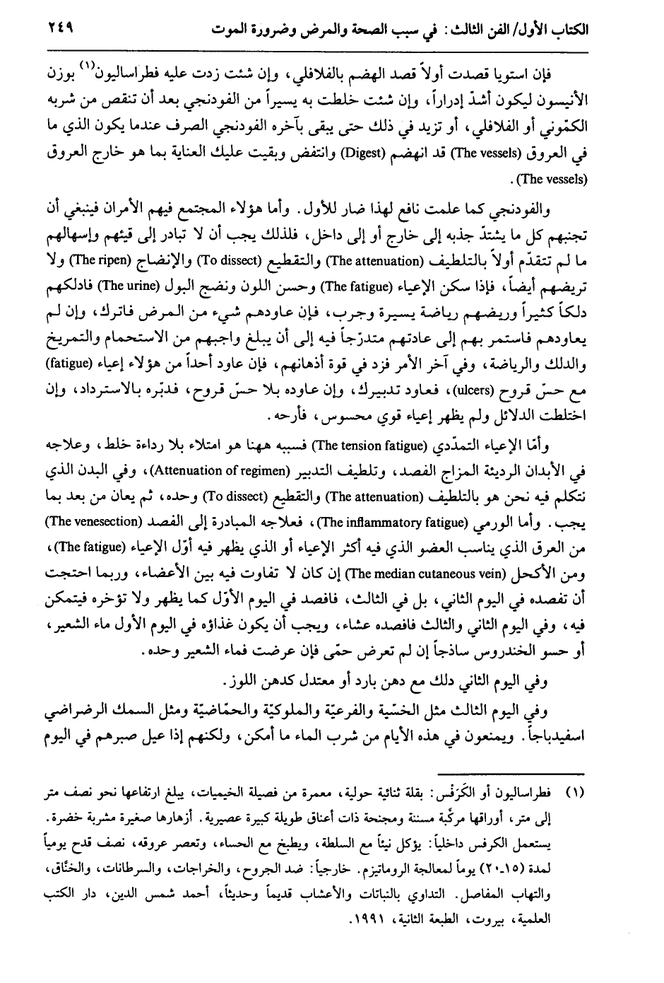 فَإِن اسْتَويَا قصدت أَولا قصد الهضم بالفلافلي وَإِن شِئْت زِدْت عَلَيْهِ فطراساليون بِوَزْن الأنيسون ليَكُون أَشد إدراراً وَإِن شِئْت خلطت بِهِ يَسِيرا من الفودنجي بعد أَن تنقص من شربه الكقوني أَو الفلافلي أَو تزيد فِي ذَلِك حَتَّى يبْقى بِآخِرهِ الفودنجي الصّرْف عِنْدَمَا يكون الَّذِي مَا فِي الْعُرُوق قد انهضم وانتفض وَبقيت عَلَيْك الْعِنَايَة بِمَا هُوَ خَارج الْعُرُوق. والفودنجي كَمَا علمت نَافِع لهَذَا ضار للْأولِ. وَأما هَؤُلَاءِ الْمُجْتَمع فيهم الْأَمْرَانِ فَيَنْبَغِي أَن تجنبهم كل مَا يشْتَد جذبه إِلَى خَارج أَو إِلَى دَاخل فَلذَلِك يجب أَن لَا تبادر إِلَى قيئهم وإسهالهم مَا لم تتقدم أَولا بالتلطيف والتقطيع والإنضاج وَلَا تريضهم أَيْضا فَإِذا سكن الإعياء وَحسن اللَّوْن ونضج الْبَوْل فادلكهم دلكا كثيرا وريضهم رياضة يسيرَة وجرب فَإِن عاودهم شَيْء من الْمَرَض فاترك وَإِن لم يعاودهم فاستمر بهم إِلَى عَادَتهم متدرجاً فِيهِ إِلَى أَن يبلغ واجبهم من الاستحمام والتمريخ والدلك والرياضة وَفِي آخر الْأَمر فزد فِي قُوَّة أذهانهم فَإِن عاود أحدا من هَؤُلَاءِ إعياء مَعَ حس قُرُوح فعاود تدبيرك وَإِن عاوده بِلَا حس قُرُوح فدبره بالاسترداد وَأَن اخْتلطت الدَّلَائِل وَلم يظْهر إعياء قوي محسوس فأرحه. وَأما الإعياء التمددي فسببه هَهُنَا هُوَ امتلاء بِلَا رداعة خلط وعلاجه فِي الْأَبدَان الردية المزاج الفصد وتلطيف التَّدْبِير وَفِي الْبدن الَّذِي نتكلم فِيهِ نَحن هُوَ بالتلطيف والتقطيع وَحده ثمَّ يعان من بعد بِمَا يجب. وَأما الورمي فعلاجه الْمُبَادرَة إِلَى الفصد من الْعرق الَّذِي يُنَاسب الْعُضْو الَّذِي فِيهِ أَكثر الإعياء أَو الَّذِي يظْهر فِيهِ أول الإعياء وَمن الأكحل إِن كَانَ لَا تفَاوت فِيهِ بَين الْأَعْضَاء وَرُبمَا احتجت أَن تفصده فِي الْيَوْم الثَّانِي بل فِي الثَّالِث فافصد فِي الْيَوْم الأول كَمَا يظْهر وَلَا تؤخره فيتمكن فِيهِ وَفِي الْيَوْم الثَّانِي وَالثَّالِث فافصمه عشَاء وَيجب أَن يكون غذاؤه فِي الْيَوْم الأول مَاء الشّعير أَو حسو الخندروس ساذجاً إِن لم تعرض حمى فَإِن عرضت فماء الشّعير وَحده. وَفِي الْيَوْم الثَّانِي ذَلِك مَعَ دهن بَارِد أَو معتدل كدهن اللوز. وَفِي الْيَوْم الثَّالِث مثل الخسّية والفرعية والملوكية والحماضية وَمثل السّمك الرضراضي أسفيدباجا. وَيمْنَعُونَ فِي هَذِه الْأَيَّام من شرب المَاء مَا أمكن وَلَكنهُمْ إِذا عيل صبرهم فِي الْيَوْم