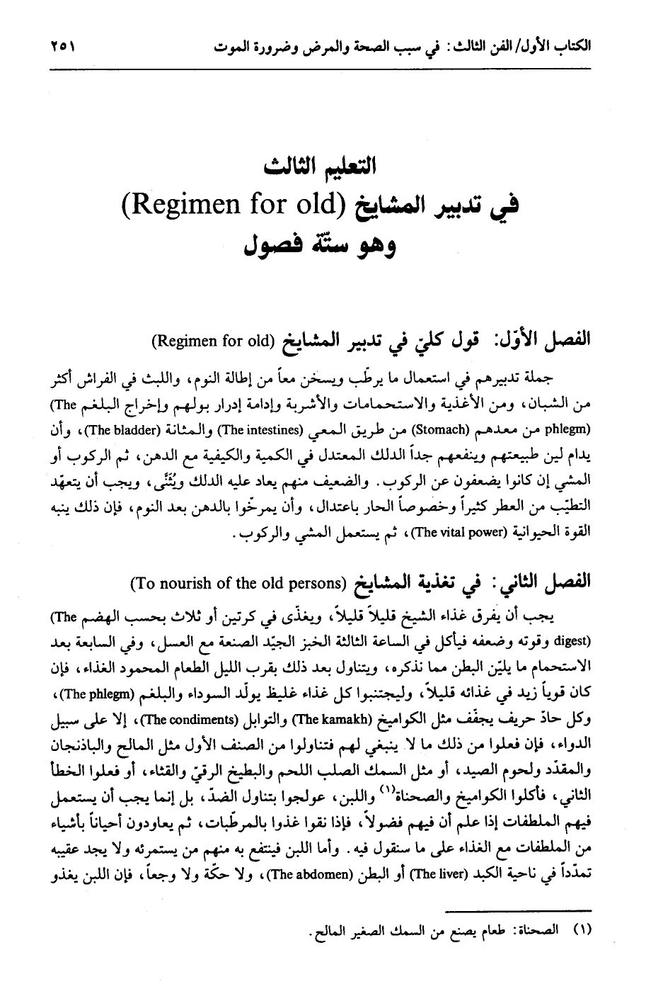 التَّعْلِيم الثَّالِث تَدْبِير الْمَشَايِخ وَهُوَ ستّة فُصُول الْفَصْل الأول قَول كلي فِي تَدْبِير الْمَشَايِخ جملَة تدبيرهم فِي اسْتِعْمَال مَا يرطّب ويسخن مَعًا من إطالة النّوم واللبث فِي الْفراش أَكثر من الشبَّان وَمن الأغذية والاستحمامات والأشربة وإدامة إدرار بَوْلهمْ وَإِخْرَاج البلغم من معدهم من طَرِيق المعي والمثانة وَأَن يدام لين طبيعتهم وينفعهم جدا الدَّلْك المعتدل فِي الكمية والكيفية مَعَ الدّهن ثمَّ الرّكُوب أَو الْمَشْي إِن كَانُوا يضعفون عَن الرّكُوب. والضعيف مِنْهُم يُعَاد عَلَيْهِ الدَّلْك ويُثنى وَيجب أَن يتعهد التَّطَيُّب من الْعطر كثيرا وخصوصاً الْحَار باعتدال وَأَن يمرخوا بالدهن بعد النّوم فَإِن ذَلِك يُنَبه الْقُوَّة الحيوانية ثمَّ يسْتَعْمل الْمَشْي وَالرُّكُوب. الْفَصْل الثَّانِي تغذية الْمَشَايِخ يجب أَن يفرق غذَاء الشَّيْخ قَلِيلا قَلِيلا ويغذى فِي كرتين أَو ثَلَاث بِحَسب الهضم وقوته وَضَعفه فيأكل فِي السَّاعَة الثَّالِثَة الْخبز الجيّد الصَّنْعَة مَعَ الْعَسَل وَفِي السَّابِعَة بعد الاستحمام مَا يلين الْبَطن مِمَّا نذكرهُ ويتناول بعد ذَلِك بِقرب اللَّيْل الطَّعَام الْمَحْمُود الْغذَاء فَإِن كَانَ قَوِيا زيد فِي غذائه قَلِيلا وليجتنبوا كل غذَاء غليظ يُولد السَّوْدَاء والبلغم وكل حاد حريف يجفف مثل الكواميخ والتوابل إِلَّا على سَبِيل الدَّوَاء فَإِن فعلوا من ذَلِك مَا ملا يَنْبَغِي لَهُم فتناولوا من الصِّنْف الأول مثل المالح والباذنجاق والمقدد وَلُحُوم الصَّيْد أَو مثل السّمك الصلب اللَّحْم والبطيخ الرقيّ والقثاء أَو فعلوا الْخَطَأ الثَّانِي فَأَكَلُوا الكواميخ والصحناة وَاللَّبن عولجوا بتناول الضِّدّ بل إِنَّمَا يجب أَن يسْتَعْمل فيهم الملطفات إِذا علم أَن فيهم فضولاً فَإِذا نقوا غذوا بالمرطبات ثمَّ يعاودون أَحْيَانًا بأَشْيَاء من الملطفات مغ الْغذَاء على مَا سنقول فِيهِ. وَأما اللَّبن فينتفع بِهِ مِنْهُم من يستمرئه وَلَا يجد عَقِيبه تمدداً فِي نَاحيَة الكبد أَو الْبَطن وَلَا حكّة وَلَا وجعاً فَإِن اللَّبن يغفو