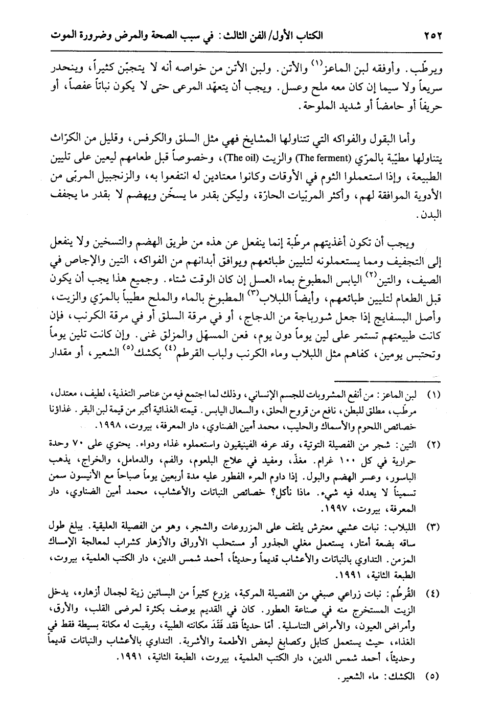 ويرطب. وأوفقه لبن الماعز والأتن. وَلبن الأتن من خواصه أَنه لَا يتجبن كثيرا وينحدر سَرِيعا وَلَا سِيمَا إِن كَانَ مَعَه ملح وَعسل. وَيجب أَن يتعهد المرعى حَتَّى لَا يكون نباتاً عفصاً أَو حريفاً أَو حامضاً أَو شَدِيد الملوحة. وَأما الْبُقُول والفواكه الَّتِي تتناولها الْمَشَايِخ فى مثل السلق والكرفس وَقَلِيل من الكرات يَتَنَاوَلهَا مطيبة بالمري وَالزَّيْت وخصوصاً قبل طعامهم ليعين على تليين الطبيعة وَإِذا استعملوا الثوم فِي الْأَوْقَات وَكَانُوا معتادين لَهُ انتفعوا بِهِ والزنجبيل المربّى من الْأَدْوِيَة الْمُوَافقَة لَهُم وَأكْثر المربيات الحارة وَليكن بِقدر مَا يسخن ويهضم لَا بِقدر مَا يجفف الْبدن. وَيجب أَن تكون أغذيتهم مرطّبة إِنَّمَا ينفعل عَن هَذِه من طَرِيق الهضم والتسخين وَلَا ينفعل إِلَى التجفيف وَمِمَّا يستعملونه لتليين طبائعهم ويوافق أبدانهم من الْفَوَاكِه التِّين والإجاص فِي الصَّيف والتين الْيَابِس الْمَطْبُوخ بِمَاء الْعَسَل إِن كَانَ الْوَقْت شتاء. وَجَمِيع هَذَا يجب أَن يكون قبل الطَّعَام لتليين طبائعهم وَأَيْضًا اللبلاب الْمَطْبُوخ بِالْمَاءِ وَالْملح مطيباً بِالْمَاءِ وَالزَّيْت وأصل البسفايج إِذا جعل شورباجة من الدَّجَاج أَو فِي مرقة السلق أَو فِي مرقة الكرنب فَإِن كَانَت طبيعتهم تستمر على لين يَوْمًا دون يَوْم فَعَن المسهل والمزلق غنى. وَإِن كَانَت تلين يَوْمًا وتحتبس يَوْمَيْنِ كفاهم مثل اللبلاب وَمَاء الكرنب ولباب القرطم بكشك الشّعير أَو مِقْدَار