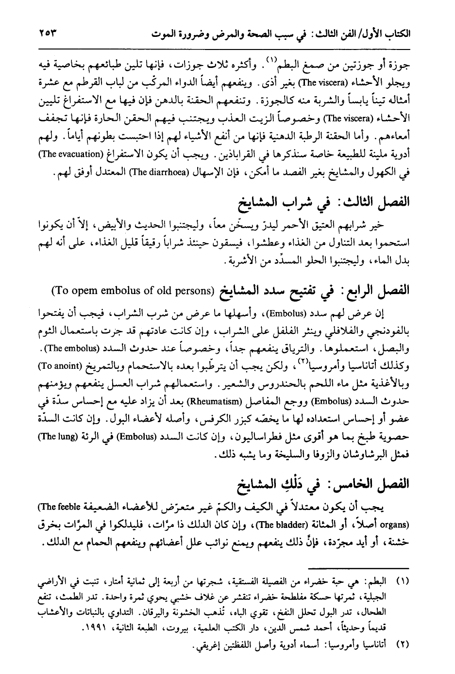 جوزة أَو جوزتين من صمغ البطم. وَأَكْثَره ثَلَاث جوزات فَإِنَّهَا تلين طبائعهم بخاصية فِيهِ ويجلو الأحشاء بِغَيْر أَذَى. وينفعهم اْيضاً الدَّوَاء المركّب من لباب القرطم مَعَ عشرَة أَمْثَاله تيناً يَابسا والشربة مِنْهُ كالجوزة. وتنفعهم الحقنة بالدهن فَإِن فِيهَا مَعَ الاستفراخ تليين الأحشاء وخصوصاً الزَّيْت العذب ويجتنب فيهم الحقن الحارة فَإِنَّهَا تجافف أمعاءهم. وَأما الحقنة الرّطبَة الدهنية فَإِنَّهَا من أَنْفَع الْأَشْيَاء لَهُم إِذا احْتبست بطونهم أَيَّامًا. وَلَهُم أدوية ملينة للطبيعة خَاصَّة سنذكرها فِي القراباذين وَيجب أَن يكون الاستفراغ فِي الكهول والمشايخ بِغَيْر الفصد مَا أمكن فَإِن الإسهال المعتدل أوفق لَهُم. الْفَصْل الثَّالِث شراب الْمَشَايِخ خير شرابهم الْعَتِيق الْأَحْمَر ليدر ويسخن مَعًا وليجتنبوا الحَدِيث والأبيض إِلَّا أَن يَكُونُوا استحموا بعد التَّنَاوُل من الْغذَاء وعطشوا فيسقون حِينَئِذٍ شرابًا رَقِيقا قَلِيل الْغذَاء على أَنه لَهُم بدل المَاء وليجتنبوا الحلو المسدد من الْأَشْرِبَة. الْفَصْل الرَّابِع تفتيح سدد الْمَشَايِخ إِن عرض لَهُم سدد وأسهلها مَا عرض من شرب الشَّرَاب فَيجب أَن يفتحوا بالفودنجي والفلافلي وينثر الفلفل على الشَّرَاب وَإِن كَانَت عَادَتهم قد جرت بِاسْتِعْمَال الثوم والبصل استعملوها. والترياق يَنْفَعهُمْ جدا وخصوصاً عِنْد حُدُوث السدد. وَكَذَلِكَ أتاناسيا وأمروسيا وَلَكِن يجب أَن يترطبوا بعده بالاستحمام وبا لتمريخ وبا لأغذية مثل مَاء اللَّحْم بالخندروس وَالشعِير. واستعمالهم شراب الْعَسَل يَنْفَعهُمْ ويؤمنهم حُدُوث السدد ووجع المفاصل بعد أَن يُزَاد عَلَيْهِ مَعَ إحساس سدة فِي عُضْو أَو إحساس استعداده لَهَا مَا يَخُصُّهُ كبزر الكرفس وَأَصله لأعضاء الْبَوْل وَإِن كَانَت السدة حصوية طبخ بِمَا هُوَ أقوى مثل فطراساليون وَأَن كَانَت السدد فِي الرئة فَمثل البرشاوشان والزوفا والسليخة وَمَا يشبه ذَلِك. الْفَصْل الْخَامِس دَلْكِ الْمَشَايِخ يجب أَن يكون معتدلاً فِي الكيف والكم غير متعرض للأعضاء الضعيفة أصلا أَو المثانة وَإِن كَانَ الدَّلْك ذَا مرَات فليدلكوا فِي المرَات بخرق خشنة أَو أيد مُجَرّدَة فَإِن ذَلِك يَنْفَعهُمْ وَيمْنَع نَوَائِب علل أعضائهم وينفعهم الْحمام مَعَ الدَّلْك.