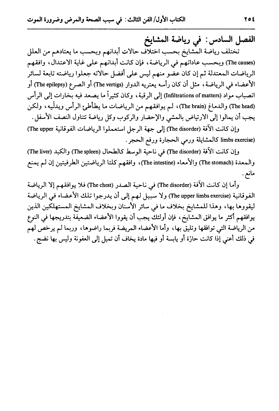 الْفَصْل السَّادِس رياضة الْمَشَايِخ تخْتَلف رياضة الْمَشَايِخ بِحَسب اخْتِلَاف حالات أبدانهم وبحسب مَا يعتادهم من الْعِلَل وبحسب عاداتهم فِي الرياضة فَإِن كَانَت أبدانهم على غَايَة الِاعْتِدَال وافقهم الرياضات المعتدلة ثمَّ إِن كَانَ عُضْو مِنْهُم لَيْسَ على أفضل حالاته جعلُوا رياضته تَابِعَة لسَائِر الْأَعْضَاء فِي الرياضة مثل أَن كَانَ رَأسه يَعْتَرِيه الدوار أَو الصراع أَو انصباب مواد إِلَى الرَّقَبَة وَكَانَ كثيرا مَا يصعد فِيهِ بخارات إِلَى الرَّأْس والدماغ لم يوافقهم من الرياضات مَا يطأطىء الرَّأْس ويدلّيه وَلَكِن يجب أَن يمالوا إِلَى الارتياض بِالْمَشْيِ والإحضار وَالرُّكُوب وكل رياضة تتَنَاوَل النّصْف الْأَسْفَل. وَإِن كَانَت الآفة إِلَى جِهَة الرجل استعملوا الرياضات الفوقانية كالمشايلة وَرمي الْحِجَارَة وَرفع الْحجر. وَإِن كَانَت الآفة فِي نَاحيَة الْوسط كالطحال والكبد والمعدة والأمعاء وافقهم كلتا الرياضتين الطرفيتين إِن لم يمْنَع مَانع. وَأما إِن كَانَت الآفة فِي نَاحيَة الصَّدْر فَلَا يوافقهم إِلَّا الرياضة الفوقانية وَلَا سَبِيل لَهُم إِلَى أَن يدرجوا تِلْكَ الْأَعْضَاء فِي الرياضة ليقووها بهَا وَهَذَا للمشايخ بِخِلَاف مَا فِي سَائِر الْأَسْنَان وَبِخِلَاف الْمَشَايِخ المستهلكين الَّذِي يوافقهم أَكثر مَا يُوَافق الْمَشَايِخ فَإِن أُولَئِكَ يجب أَن يقووا الْأَعْضَاء الضعيفة بتدريجها فِي النَّوْع من الرياضة الَّتِي توافقها وتليق بهَا وَأما الْأَعْضَاء الْمَرِيضَة فَرُبمَا راضوها وَرُبمَا لم يرخص لَهُم فِي ذَلِك أَعنِي إِذا كَانَت حارة أَو يابسة أَو فِيهَا مَادَّة يخَاف أَن تميل إِلَى العفونة وَلَيْسَ بهَا نضج.
