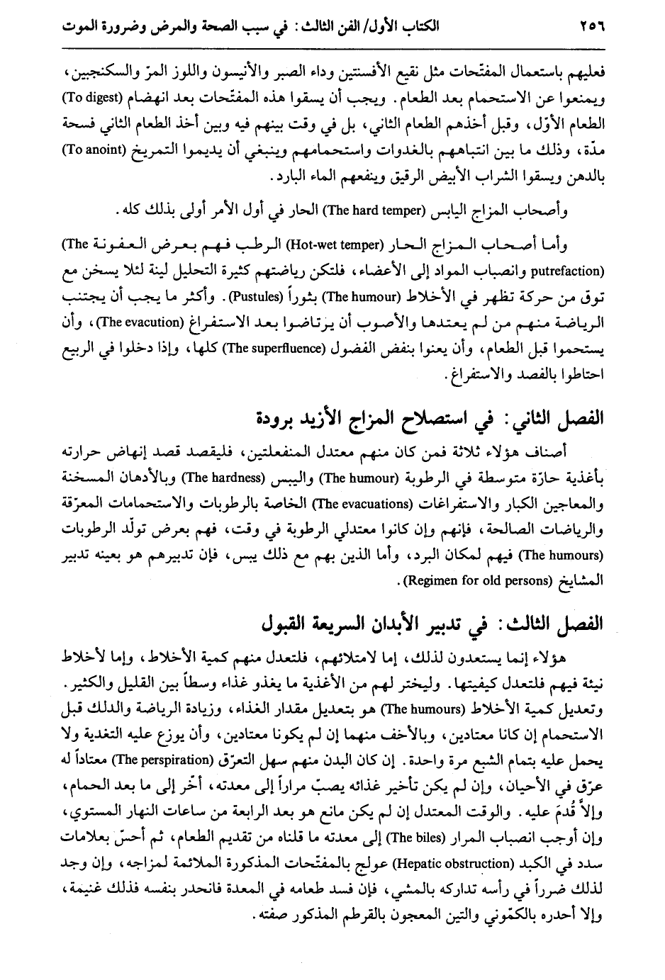 فَعَلَيْهِم بِاسْتِعْمَال المفتحات مثل نَقِيع الأفسنتين وداء الصَّبْر والأنيسون واللوز المر والسكنجبين ويمنعوا عَن الإستحمام بعد الطَّعَام. وَيجب أَن يسقوا هَذِه المفتحات بعد انهضام الطَّعَام الأوّل وَقبل أَخذهم الطَّعَام الثَّانِي بل فِي وَقت بَينهم فِيهِ وَبَين أَخذ الطَّعَام الثَّانِي فسحة مدّة وَذَلِكَ مَا بَين انتباههم بالغدوات واستحمامهم وَيَنْبَغِي أَن يديموا التمريخ بالدهن ويسقوا الشَّرَاب الْأَبْيَض الرَّقِيق وينفعهم المَاء الْبَارِد. وَأَصْحَاب المزاج الْيَابِس الْحَار فِي أول الْأَمر أولى بذلك كُله. وَأما أَصْحَاب المزاج الْحَار الرطب فهم بِعرْض العفونة وانصباب الْموَاد إِلَى الْأَعْضَاء فلتكن رياضتهم كَثِيرَة التَّحْلِيل لينَة لِئَلَّا يسخن مَعَ توق من حَرَكَة تظهر فِي الأخلاط بثوراً. وَأكْثر مَا يجب أَن يجْتَنب الرياضة مِنْهُم من لم يعتدها والأصوب أَن يرتاضوا بعد الاستفراغ وَأَن يستحموا قبل الطَّعَام وَأَن يعنوا بنفض الفضول كلهَا وَإِذا دخلُوا فِي الرّبيع احتاطوا بالفصد والاستفراغ. الْفَصْل الثَّانِي استصلاح المزاج الأزيد برودة أَصْنَاف هؤلاه ثَلَاثَة فَمن كَانَ مِنْهُم معتدل المنفعلتين فليقصد قصد إنهاض حرارة بأغذية حارة متوسطة فِي الرُّطُوبَة واليبس وبالأدهان المسخنة والمعاجين الْكِبَار والاستفراغات الْخَاصَّة بالرطوبات والاستحمامات الْمعرفَة والرياضات الصَّالِحَة فَإِنَّهُم وَإِن كَانُوا معتدلي الرُّطُوبَة فِي وَقت فهم بِعرْض تولد الرطوبات فيهم لمَكَان الْبرد وَأما الَّذين بهم مَعَ ذَلِك يبس فَإِن تدبيرهم هُوَ بِعَيْنِه تَدْبِير الْمَشَايِخ. الْفَصْل الثَّالِث تَدْبِير الْأَبدَان السريعة الْقبُول هَؤُلَاءِ إِنَّمَا يستعدون لذَلِك إِمَّا لامتلائهم فلتعدل مِنْهُم كمية الأخلاط وَإِمَّا لأخلاط نيئة فيهم فلتعدل كيفيتها. وليختر لَهُم من الأغذية مَا يغذو غذَاء وسطا بَين الْقَلِيل وَالْكثير. وتعديل كمية الأخلاط هُوَ بتعديل مِقْدَار الْغذَاء وَزِيَادَة الرياضة والدلك فَبل الاستحمام إِن كَانَا معتادين وبالأخف مِنْهُمَا إِن لم يَكُونَا معتادين وَأَن يوزع عَلَيْهِ التغدية وَلَا يحمل عَلَيْهِ بِتمَام الشِّبَع مرّة وَاحِدَة. إِن كَانَ الْبدن مِنْهُم سهل التعرق مُعْتَادا لَهُ عرّق فِي الأحيان وَإِن لم يكن تَأْخِير غذائه يصب مرارأ إِلَى معدته أخر إِلَى مَا بعد الْحمام وَإِلَّا قُدمَ عَلَيْهِ. وَالْوَقْت المعتدل إِن لم يكن مَانع هُوَ بعد الرَّابِعَة من سَاعَات النَّهَار المستوي وَإِن أوجب انصباب المرار إِلَى معدته مَا قُلْنَاهُ من تَقْدِيم الطَّعَام ثمَّ أحس بعلامات سدد فِي الكبد عولج بالمفتّحات الْمَذْكُورَة الملائمة لمزاجه وَإِن وجد لذَلِك ضَرَرا فِي رَأسه تَدَارُكه بِالْمَشْيِ فَإِن فسد طَعَامه فِي الْمعدة فإنحدر بِنَفسِهِ فَذَلِك غنيمَة وَإِلَّا أحدره بالكموني والتين المعجون بالقرطم الْمَذْكُور صفته. تسمين القضيف أقوى علل الهزال كَمَا سنصفه يبس المزاج والماساريقا ويبس الْهَوَاء فَإِذا يبس الماساريقا لم يقبل الْغذَاء فليداو اليبس والهزال بدلك قبل الْحمام دلكا بَين الخشونة واللين إِلَى أَن يحمر الْجلد ثمَّ يصلب الدَّلْك ثمَّ يَطلى بطلاء الزفت ثمَّ يراض بالاعتدال ثمَّ يستحم بِلَا إبطاء وينشف بعد ذَلِك بمناديل يابسة ثمَّ يمرخ بدهن يسير ثمَّ يتَنَاوَل الْغذَاء الْمُوَافق فَإِن احْتمل سنه وفصله وعادته المَاء الْبَارِد صبه على نَفسه. ومنتهى الدّلك الْمُقدم على اسْتِعْمَال طلاء الزفت هُوَ أَن لَا يبتدىء الانتفاخ فِي الذبول وَهَذَا قريب مِمَّا قُلْنَاهُ فِي تَعْظِيم الْعُضْو الصَّغِير وَتَمام القَوْل فِيهِ يُوجد فِي كتاب الزِّينَة من الْكتاب الرَّابِع.