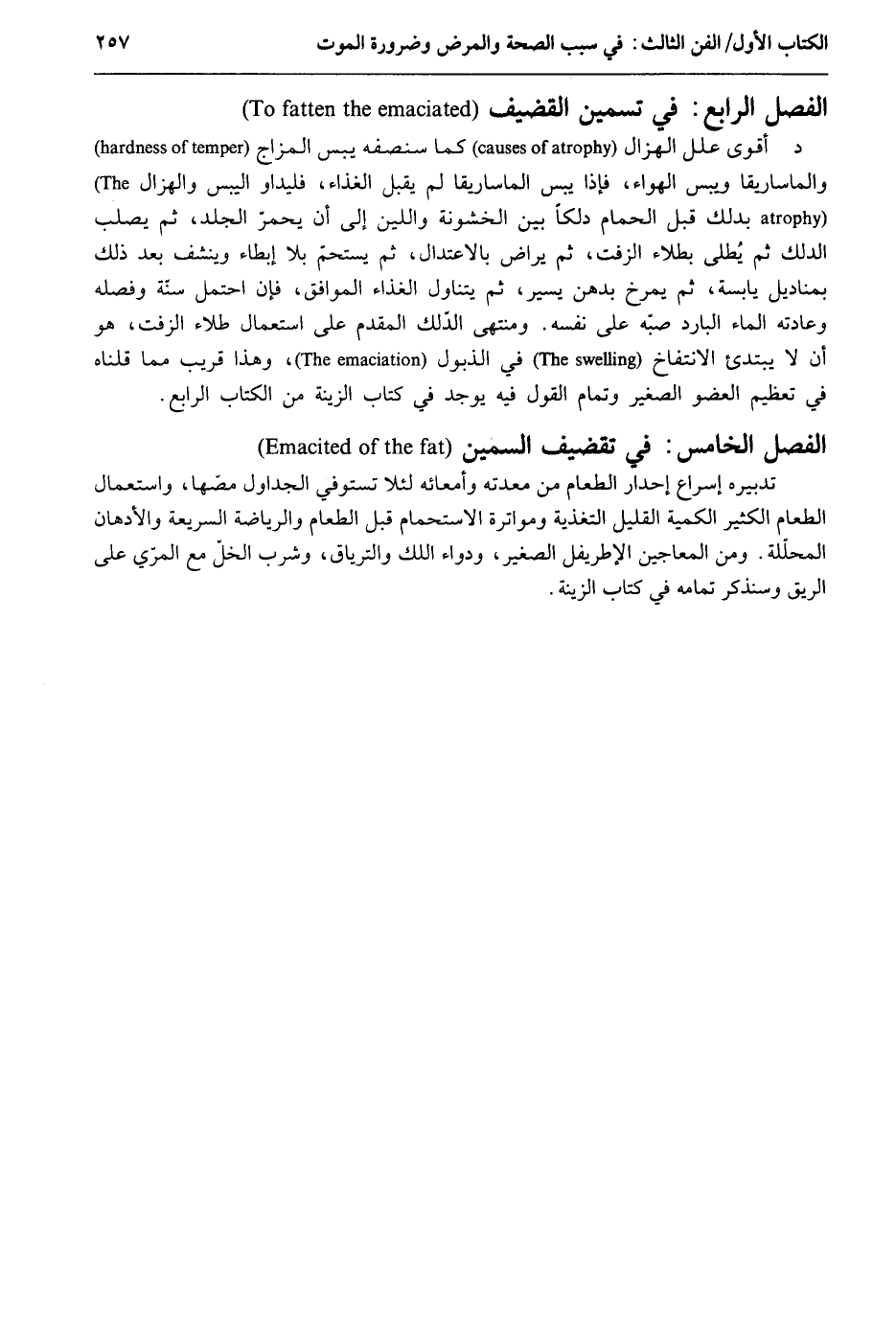 الْفَصْل الْخَامِس تقضيف السمين تَدْبيره إسراع إحدار الطَّعَام من معدته وأمعائه لِئَلَّا تستوفي الجداول مصها وَاسْتِعْمَال الطَّعَام الْكثير الكمية الْقَلِيل التغذية ومواترة الاستحمام قبل الطَّعَام والرياضة السريعة والأدهان المحللة. وَمن المعاجين الإطريفل الصَّغِير ودواء الدَّلْك والترياق وَشرب الْخلّ مَعَ المري على الرِّيق وَسَنذكر تَمَامه فِي كتاب الزِّينَة.