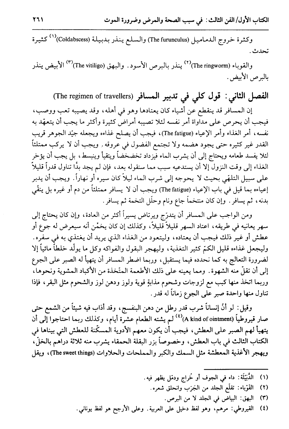 وَكَثْرَة خُرُوج الدماميل والسلع ينفر بدبيلة كَثِيرَة تحدث. والقوباء ينذر بالبرص الْأسود. والبهق الْأَبْيَض ينذر بالبرص الْأَبْيَض. قَول كلي فِي تَدْبِير الْمُسَافِر إِن الْمُسَافِر قد يَنْقَطِع عَن أَشْيَاء كَانَ يعتادها وَهُوَ فِي أَهله وَقد يُصِيبهُ تَعب ووصب فَيجب أَن يحرص على مداواة أَمر نَفسه لِئَلَّا تصيبه أمراض كَثِيرَة وَأكْثر مَا يجب أَن يتعهد بِهِ نَفسه أَمر الْغذَاء وَأمر الأعياء فَيجب أَن يصلح غذاءه ويجعله جيد الْجَوْهَر قريب الْقدر غير كَثِيره حَتَّى يجود هضمه وَلَا تَجْتَمِع الفضول فِي عروقه. وَيجب أَن لَا يركب ممتلئاً لِئَلَّا يفْسد طَعَامه وَيحْتَاج إِلَى أَن يشرب المَاء فَيَزْدَاد تخضخضاً ويتقيأ وينبسط بل يجب أَن يُؤَخر الْغذَاء إِلَى وَقت النُّزُول إِلَّا أَن يستدعيه سَبَب مِمَّا سنقوله بعد فَإِن لم يجد بدا تنَاول قدرا قَلِيلا على سَبِيل التلهي بِحَيْثُ لَا يحوجه إِلَى شرب المَاء لَيْلًا كَانَ سيره أَو نَهَارا. وَيجب أَن يدبر إعياءه بِمَا قيل فِي بَاب الإعياء وَيجب أَن لَا يُسَافر ممتلئاً من دم أَو غَيره بل ينقي بدنه ثمَّ يُسَافر. وَإِن كَانَ منتخماً جَاع ونام وَحل التُّخمَة ثمَّ يُسَافر. وَمن الْوَاجِب على الْمُسَافِر أَن يتدرج ويرتاض يَسِيرا أَكثر من الْعَادة وَإِن كَانَ يحْتَاج إِلَى سهر يعانيه فِي طَرِيقه اعْتَادَ السهر قَلِيلا قَلِيلا وَكَذَلِكَ إِن كَانَ يخمن أَنه سيعرض لَهُ جوع أَو عَطش أَو غير ذَلِك فَيجب أَن يعتاده وليتعود من الْغذَاء الَّذِي يُرِيد أَن يغتذي بِهِ فِي سَفَره. وليجعل غذاءه قَلِيل الْكمّ كثير التغذية وليهجر الْبُقُول والفواكه وكل مَا يولّد خلطاً مائياً إِلَّا لضَرُورَة التعالج بِهِ كَمَا نحدده فِيمَا يسْتَقْبل وَرُبمَا اضْطر الْمُسَافِر أَن يتهيأ لَهُ الصَّبْر على الْجُوع إِلَى أَن تقل مِنْهُ الشَّهْوَة. وَمِمَّا يُعينهُ على ذَلِك الْأَطْعِمَة المتخذة من الأكباد المشوية وَنَحْوهَا وَرُبمَا اتخذ مِنْهَا كبب مَعَ لزوجات وشحوم مذابةٍ قَوِيَّة ولوز ودهن لوز والشحوم مثل الْبَقر فَإِذا تنَاول مِنْهَا وَاحِدَة صبرعلى الْجُوع زَمَانا لَهُ قدر. وَقيل: لَو أَن إنْسَانا شرب قدر رَطْل من دهن البنفسج وَقد أذاب فية شياً من الشمع حَتَّى صَار قيروطياً لم يشته الطَّعَام عشرَة أَيَّام وَكَذَلِكَ رُبمَا احتاجوا إِلَى أَن يتهيأ لَهُم الصَّبْر على الْعَطش فَيجب أَن يكون مَعَهم الْأَدْوِيَة المسكنة للعطش الَّتِي بيناها فِي الْكتاب الثَّالِث فِي بَاب الْعَطش وخصوصاً بزر البقلة الحمقاء يشرب مِنْهُ ثَلَاثَة دَرَاهِم بالخل ويهجر الأغذية المعطشة مثل السّمك وَالْكبر والمملحات والحلاوات ويقل