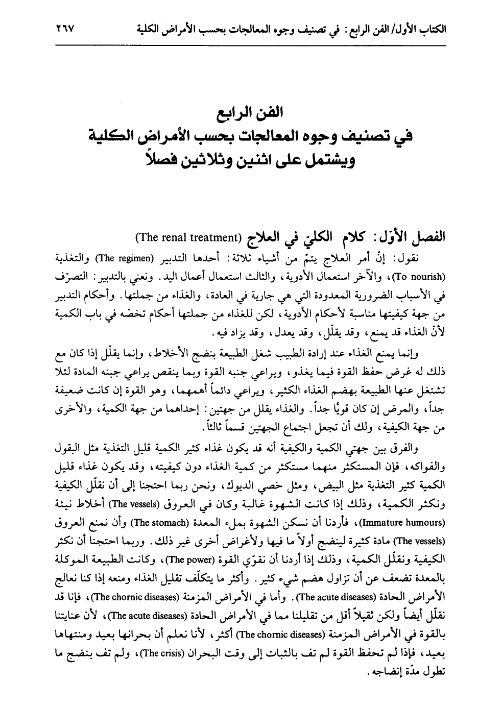 الْفَنّ الرَّابِع وُجُوه المعالجات بِحَسب الْأَمْرَاض الْكُلية ويشتمل على ثَلَاثِينَ فصلا. الْفَصْل الأول كَلَام كلي فِي العلاج نقُول: إِن أَمر العلاج يتم من أَشْيَاء ثَلَاثَة: أَحدهَا التَّدْبِير والتغذية وَالْآخر اسْتِعْمَال الْأَدْوِيَة وَالثَّالِث اسْتِعْمَال أَعمال الْيَد. ونعني بِالتَّدْبِيرِ: التَّصَرُّف فِي الْأَسْبَاب الضرورية المعدودة الَّتِي هِيَ جَارِيَة فِي الْعَادة والغذاء من جُمْلَتهَا. وَأَحْكَام التَّدْبِير من جِهَة كيفيتها مُنَاسبَة لأحكام الْأَدْوِيَة لَكِن للغذاء من جُمْلَتهَا أَحْكَام تخصه فِي بَاب الكمية لِأَن الْغذَاء قد يمْنَع وَقد يقلل وَقد يعدل وَقد يُزَاد فِيهِ. وَإِنَّمَا يمْنَع الْغذَاء عِنْد إِرَادَة الطَّبِيب شغل الطبيعة بنضج الأخلاط وأنما يقلل إِذا كَانَ مَعَ ذَلِك لَهُ غَرَض حفظ الْقُوَّة فِيمَا يغذو ويراعي جنبة الْقُوَّة وَبِمَا ينقص يُرَاعِي جنبة الْمَادَّة لِئَلَّا تشتغل عَنْهَا الطبيعة بهضم الْغذَاء الْكثير ويراعي دَائِما أهمهما وَهُوَ الْقُوَّة إِن كَانَت ضَعِيفَة جدا وَالْمَرَض إِن كَانَ قَوِيا جدا والغاء يقلل من جِهَتَيْنِ: إِحْدَاهمَا من جِهَة الكمية والآخرى من جِهَة الْكَيْفِيَّة وَلَك أَن تجْعَل اجْتِمَاع الْجِهَتَيْنِ قسما ثَالِثا. وَالْفرق بَين جهتي الكمية والكيفة أَنه قد يكون غذَاء كثير الكمية قَلِيل التغذية مثل الْبُقُول والفواكه فَإِن المستكثر مِنْهُمَا مستكثر من كمية الْغذَاء دون كيفيته وَقد يكون غذَاء قَلِيل الكمية كثير التغذية مثل الْبيض وَمثل خصي الديوك وَنحن رُبمَا احتجنا إِلَى أَن نقلل الْكَيْفِيَّة ونكثر الكمية وَذَلِكَ إِذا كَانَت الشَّهْوَة غالبة وَكَانَ فِي الْعُرُوق أخلاط نيئة فأردنا أَن نسكن الشَّهْوَة بملء الْمعدة وَأَن نمْنَع الْعُرُوق مَادَّة كَثِيرَة لينضج أَولا مَا فِيهَا ولأغراض أُخْرَى غير ذَلِك. وَرُبمَا احتجنا أَن نكثر الْكَيْفِيَّة ونقلل الكمية وَذَلِكَ إِذا أردنَا أَن نقوي الْقُوَّة وَكَانَت الطبيعة الموكلة بالمعدة تضعف عَن أَن تزاول هضم شَيْء كثير. وَأكْثر مَا يتكلّف تقليل الْغذَاء وَمنعه إِذا كُنَّا نعالج الْأَمْرَاض الحادة. وَأما فِي الْأَمْرَاض المزمنة فَإنَّا قد نقلل أَيْضا وَلَكِن ثقيلاً أقل من تقليلنا مِمَّا فِي الْأَمْرَاض الحادة لِأَن عنايتنا بِالْقُوَّةِ فِي الْأَمْرَاض المزمنة أَكثر لأَنا نعلم أَن بحرانها بعيد ومنتهاها بعيد فَإِذا لم تحفظ الْقُوَّة لم تف بالثبات إِلَى وَقت البحران وَلم تف بنضج مَا تطول مُدَّة إنضاجه.