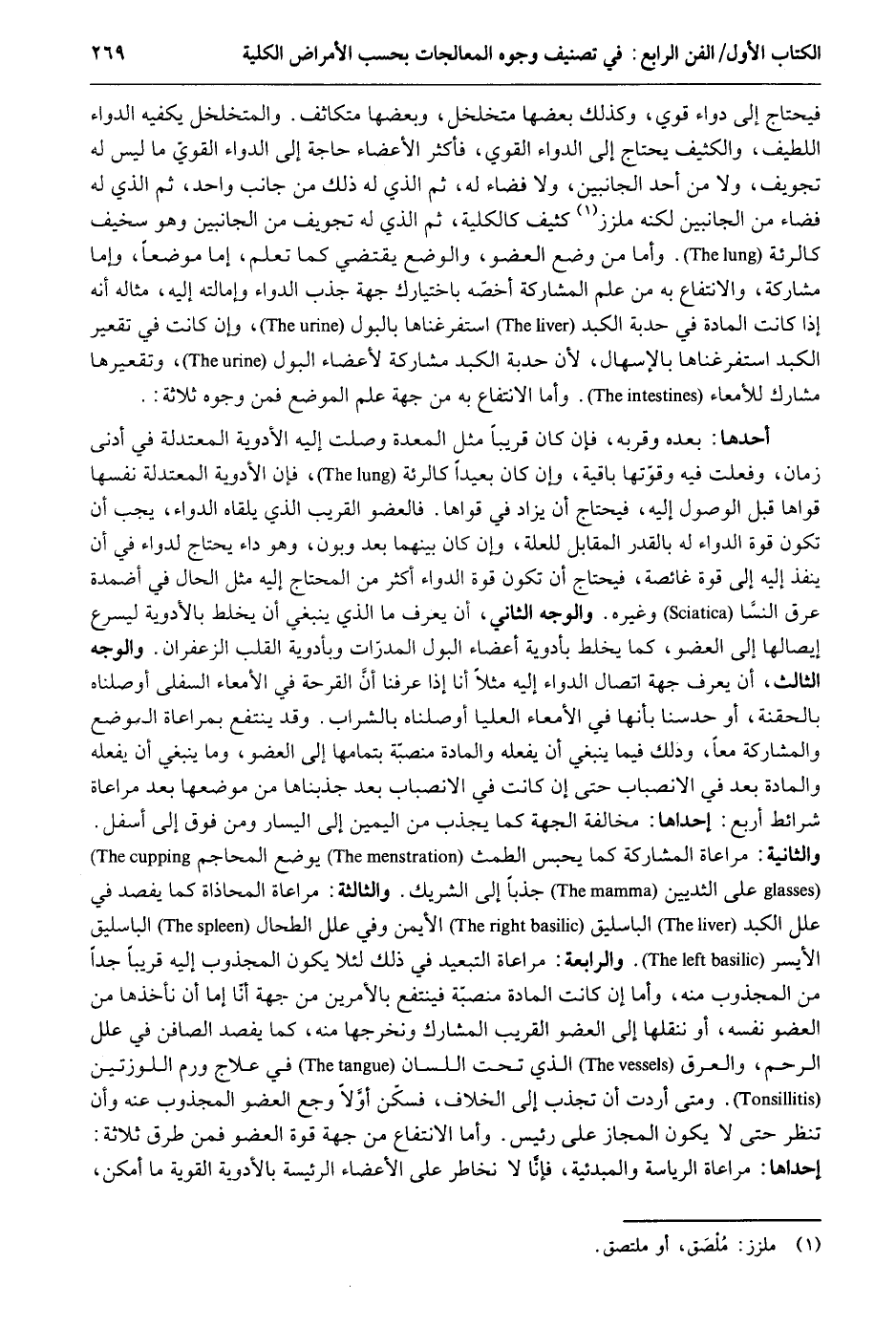 فَيحْتَاج إِلَى دَوَاء قوي وَكَذَلِكَ بَعْضهَا متخلخل وَبَعضهَا متكاثف. والمتخلخل يَكْفِيهِ الدَّوَاء اللَّطِيف والكثيف يحْتَاج إِلَى الدَّوَاء الْقوي فَأكْثر الْأَعْضَاء حَاجَة إِلَى الدَّوَاء الْقوي مَا لَيْسَ لَهُ تجويف وَلَا من أحد الْجَانِبَيْنِ وَلَا فضاء لَهُ ثمَّ الَّذِي لَهُ ذَلِك من جَانب وَاحِد ثمَّ الَّذِي لَهُ فضاء من الْجَانِبَيْنِ لكنه ملزز كثيف كالكلية ثمَّ الَّذِي لَهُ تجويف من الْجَانِبَيْنِ وَهُوَ سخيف كالرئة. وَأما من وضع الْعُضْو والوضع يَقْتَضِي كَمَا تعلم إِمَّا موضعا وَإِمَّا مُشَاركَة وَالِانْتِفَاع بِهِ من علم الْمُشَاركَة أخصه باختيارك جِهَة جذب الدَّوَاء وإمالته إِلَيْهِ مِثَاله إِنَّه إِذا كَانَت الْمَادَّة فِي حدبة الكبد استفرغناها بالبول وَإِن كَانَت فِي تقعير الكبد استفرغناها بالإسهال لِأَن حدبة الكبد مُشَاركَة لأعضاء الْبَوْل أَحدهَا: بعده وقربه فَإِن كَانَ قَرِيبا مثل الْمعدة وصلت إِلَيْهِ الْأَدْوِيَة المعتدلة فِي أدنى زمَان وَفعلت فِيهِ وقوتها بَاقِيَة وان كَانَ بَعيدا كالرئة فَإِن الْأَدْوِيَة المعتدلة نَفسهَا قواها قبل الْوُصُول إِلَيْهِ فَيحْتَاج أَن يُزَاد فِي قواها. فالعضو الْقَرِيب الَّذِي يلقاه الدَّوَاء يجب أَن يكون قُوَّة الدَّوَاء لَهُ بِالْقدرِ الْمُقَابل لِلْعِلَّةِ وَإِن كَانَ بَينهمَا بعد وبون وَهُوَ دَاء يحْتَاج لدواء فِي أَن ينفذ إِلَيْهِ إِلَى قُوَّة غائصة فَيحْتَاج أَن تكون قُوَّة الدَّوَاء أَكثر من الْمُحْتَاج إِلَيْهِ مثل الْحَال فِي أضمدة عرق النسى وَغَيره. وَالْوَجْه الثَّانِي أَن يعرف مَا الَّذِي يَنْبَغِي أَن يخلط بالأدوية ليسرع إيصالها إِلَى الْعُضْو كَمَا يخلط بأدوية أَعْضَاء الْبَوْل المدرات وبأدوية الْقلب الزَّعْفَرَان. وَالْوَجْه الثَّالِث أَن يعرف جِهَة إتصال الدَّوَاء إِلَيْهِ مثلا أَنا إِذا عرفنَا أنَ القرحة فِي الأمعاء السُّفْلى أوصلناه بالحقنة أَو حدسنا بِأَنَّهَا فِي الأمعاء الْعليا أوصلناه بِالشرابِ. وَقد ينْتَفع بمراعاة الْموضع والمشاركة مَعًا وَذَلِكَ فِيمَا يَنْبَغِي أَن يَفْعَله والمادة منصبة بِتَمَامِهَا إِلَى الْعُضْو وَمَا يَنْبَغِي أَن يَفْعَله والمادة بعد فِي الانصباب حَتَّى إِن كَانَت فِي الانصباب بعد جذبناها من موضعهَا بعد مُرَاعَاة شَرَائِط أَربع: إِحْدَاهَا: مُخَالفَة الْجِهَة كَمَا يجذب من الْيَمين إِلَى الْيَسَار وَمن فَوق إِلَى أَسْفَل. وَالثَّانيَِة: مُرَاعَاة الْمُشَاركَة كَمَا يحبس الطمث يوضع المحاجم على الثديين جذباً إِلَى الشَّرِيك. وَالثَّالِثَة: مُرَاعَاة الْمُحَاذَاة كَمَا يفصد فِي علل الكبد الباسليق الْأَيْمن وَفِي علل الطحال الباسليق الْأَيْسَر. وَالرَّابِعَة: مُرَاعَاة التبعيد فِي ذَلِك لِئَلَّا يكون المجذوب إِلَيْهِ قَرِيبا جدا من المجذوب مِنْهُ وَأما إِن كَانَت الْمَادَّة منصبّة فينتفع بالأمرين من جِهَة أَنا إِمَّا أَن نأخذها من الْعُضْو نَفسه أَو ننقلها إِلَى الْعُضْو الْقَرِيب المشارك ونخرجها مِنْهُ كَمَا يفصد الصَّافِن فِي علل الرَّحِم والعرق الَّذِي تَحت اللِّسَان فِي علاج ورم اللوزتين. وَمَتى أردْت أَن تجذب إِلَى الْخلاف فسكن أَولا وجع الْعُضْو المجذوب عَنهُ وَأَن تنظر حَتَّى لَا يكون الْمجَاز على رَئِيس. وَأما الِانْتِفَاع من جِهَة قُوَّة الْعُضْو فَمن طرق ثَلَاثَة: إِحْدَاهَا: مُرَاعَاة الرياسة والمبدئية فَإنَّا لَا نخاطر على الْأَعْضَاء الرئيسة بالأدوية القوية مَا أمكن