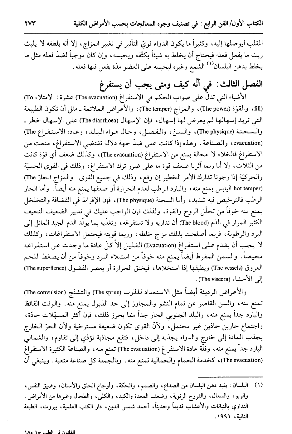 للقلب ليوصلها إِلَيْهِ وَكَثِيرًا مَا يكون الدَّوَاء قوي التَّأْثِير فِي تَغْيِير المزاج إِلَّا أَنه يلطفه لَا يلبث ريث مَا يفعل فعله فَيحْتَاج أَن يخلط بِهِ شياً يكثفه ويحبسه وَإِن كَانَ مُوجبا لضد فعله مثل مَا يخلط بدهن البلسان الشمع وَغَيره ليحبسه على الْعُضْو مُدَّة يفعل فِيهَا فعله. الْفَصْل الثَّالِث أَنه كَيفَ وَمَتى يجب أَن يستفرغ الْأَشْيَاء الَّتِي تدل على صَوَاب الحكم فِي الاستفراغ عشرَة: الإمتلاء وَالْقُوَّة والمزاج والأعراض الملائمة مثل أَن تكون الطبيعة الَّتِي تُرِيدُ إسهالها لم يعرض لَهَا إسهال فَإِن الإسهال على الإسهال خطر والسحنة والسنّ والفصل وَحَال هَوَاء الْبَلَد وَعَادَة الاستفراغ والصناعة. وَهَذِه إِذا كَانَت على ضد جِهَة دلَالَة تَقْتَضِي الاستفراغ منعت من الاستفراغ فالخلاء لَا محَالة يمْنَع من الاستفراغ وَكَذَلِكَ ضعف أَي قُوَّة كَانَت من الثَّلَاث إِلَّا أَنا رُبمَا آثرنا ضعف قُوَّة مَا على ضَرَر ترك الاستفراغ وَذَلِكَ فِي القوى الحسية والحركية إِذا رجونا تدارك الْأَمر الخطير إِن وَقع وَذَلِكَ فِي جَمِيع القوى. والمزاج الْحَار الْيَابِس يمْنَع مِنْهُ والبارد الرطب لعدم الْحَرَارَة أَو ضعفها يمْنَع مِنْهُ أَيْضا. وَأما الْحَار الرطب فالترخيص فِيهِ شَدِيد وَأما السحنة فَإِن الإفراط فِي القضافة والتخلخل يمْنَع مِنْهُ خوفًا من تحلل الرّوح وَالْقُوَّة وَلذَلِك فَإِن الْوَاجِب عَلَيْك فِي تَدْبِير الضَّعِيف النحيف الْكثير المرار فِي الدَّم أَن تداريه وَلَا تستفرغه وتغذيه بِمَا يولّد الدَّم الْجيد المائل إِلَى الْبرد والرطوبة فَرُبمَا أصلحت بذلك مزاج خلطه وَرُبمَا قويته فَيحْتَمل الاستفراغات وَكَذَلِكَ لَا يجب أَن يقدم على استفراغ الْقَلِيل إِلَّا كل عَادَة مَا وجدت عَن استفراغه محيصاً. وَالسمن المفرط أَيْضا يمْنَع مِنْهُ خوفًا من اسْتِيلَاء الْبرد وخوفاً من أَن يضغط اللَّحْم الْعُرُوق ويطبقها إِذا استخلاها فيخنق الْحَرَارَة أَو يعصر الفضول إِلَى الأحشاء. والأعراض الرَّديئَة أَيْضا مثل الاستعداد للذرب والتشنّج تمنع مِنْهُ وَالسّن الْقَاصِر عَن تَمام النشو والمجاوز إِلَى حد الذيول يمْنَع مِنْهُ. وَالْوَقْت القائظ والبارد جدا يمْنَع مِنْهُ والبلد الجنوبي الْحَار جدا مِمَّا يحرز ذَلِك فَإِن أَكثر المسهلات حادة واجتماع حادّين غير مُحْتَمل وَلِأَن القوى تكون ضَعِيفَة مسترخية وَلِأَن الْحر الْخَارِج يجذب الْمَادَّة إِلَى خَارج والدواء يجذبه إِلَى دَاخل فَتَقَع مجاذبة تُؤدِّي إِلَى تقاوم والشمالي الْبَارِد جدا يمْنَع مِنْهُ وَقلة الاستفراغ تمنع مِنْهُ والصناعة الْكَثِيرَة الاستفراغ كخدمة الْحمام والحمالية تمنع مِنْهُ. وَبِالْجُمْلَةِ كل صناعَة متعبة. وَيَنْبَغِي أَن