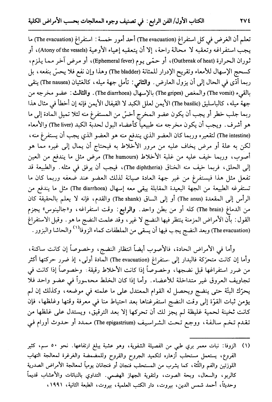 تعلم أَن الْغَرَض فِي كل استفراغ أحد أُمُور خَمْسَة: استفراغ مَا يجب استفراغه وَتعقبه لَا محَالة رَاحَة إِلَّا أَن يتعقبه إعياء الأوعية أَو ثوران الْحَرَارَة أَو حمى يَوْم أَو مرض آخر مِمَّا يلْزم كسحج الإسهال للأمعاء وتقريح الإدرار للمثانة وَهَذَا وَإِن نفع فَلَا يحس بنفعه بل رُبمَا أدّى فِي الْحَال إِلَى أَن يَزُول الْعَارِض. وَالثَّانِي: تَأمل جِهَة ميله كالغثيان ينقى بالقيء والمغص بالإسهال. وَالثَّالِث: عُضْو مخرجه من جِهَة ميله. كالباسليق الْأَيْمن لعلل الكبد لاالقيفال الْأَيْمن فَإِنَّهُ إِن أَخطَأ فِي مِثَال هَذَا رُبمَا جلب خطر أَو يجب أَن يكون عُضْو الْمخْرج أخس من المستفرغ مِنْهُ لِئَلَّا تميل الْمَادَّة إِلَى مَا هُوَ أشرف. وَيجب أَن يكون مخرجه مِنْهُ طبيعياً كأعضاء الْبَوْل لحدبة الكبد والأمعاء لتقعيرة وَرُبمَا كَانَ الْعُضْو الَّذِي ينْدَفع مِنْهُ هُوَ الْعُضْو الَّذِي يجب اْن يستفرغ مِنْهُ لَكِن بِهِ عِلّة أَو مرض يخَاف عَلَيْهِ من مُرُور الأخلاط بِهِ فَيحْتَاج أَن يمال إِلَى غَيره مِمَّا هُوَ أصوب وَرُبمَا خيف عَلَيْهِ من غَلَبَة الأخلاط مرض مثل مَا ينْدَفع من الْعين إِلَى الْحلق فَرُبمَا خيف مِنْهُ الخناق فَيجب أَن يرفق فِي مثله. والطبيعة قد تفعل مثل هَذَا فيستفرغ من غير جِهَة الْعَادة صِيَانة لذَلِك الْعُضْو عِنْد ضعفه وَرُبمَا كَانَ مَا تستفرغه الطبيعة من الْجِهَة الْبَعِيدَة الْمُقَابلَة يبْقى مَعَه إسهال مثل مَا ينْدَفع من الرَّأْس إِلَى المقعدة أَو إِلَى السَّاق والقدم فَإِنَّهُ لَا يعلم بِالْحَقِيقَةِ كَانَ من الدِّمَاغ كُله أَو من بطن وَاحِد. وَالرَّابِع: وَقت استفراغه وجالينوس يجْزم القَوْل: بِأَن الْأَمْرَاض المزمنة ينْتَظر فِيهَا النضج لَا غير وَقد علمت النضج مَا هُوَ. وَقيل الاستفراغ وَبعد النضج يجب فِيهَا أَن يسقى من الملطفات كَمَاء الزوفا والحاشا والبزور. وَأما فِي الْأَمْرَاض الحادة فالأصوب أَيْضا انْتِظَار النضج وخصوصاً إِن كَانَت سَاكِنة وَأما إِن كَانَت متحركة فالبدار إِلَى استفراغ الْمَادَّة أولى إِذْ ضَرَر حركتها أَكثر من ضَرَر استفراغها قبل نضجها وخصوصاً إِذا كَانَت الأخلاط رقيقَة وخصوصاً إِذا كَانَت فِي تجاويف الْعُرُوق غير متداخلة للأعضاء. وَأما إِذا كَانَ الْخَلْط محصوراً فِي عُضْو وَاحِد فَلَا يُحَرك الْبَتَّةَ حَتَّى ينضج وَيحصل لَهُ القوام المعتدل على مَا عَلمته فِي مَوْضِعه وَكَذَلِكَ إِن لم يُؤمن ثبات الْقُوَّة إِلَى وَقت النضج استفرغناها بعد احْتِيَاط منا فِي معرفَة وَقتهَا وغلظها فَإِن كَانَت ثخينة لحمية غَلِيظَة لم يجز لَك أَن تحركها إِلَّا بعد الترقيق ويستدل على غلظها من تقدم تخم سالفة ووجع تَحت الشراسيف ممدد أَو حُدُوث أورام فِي