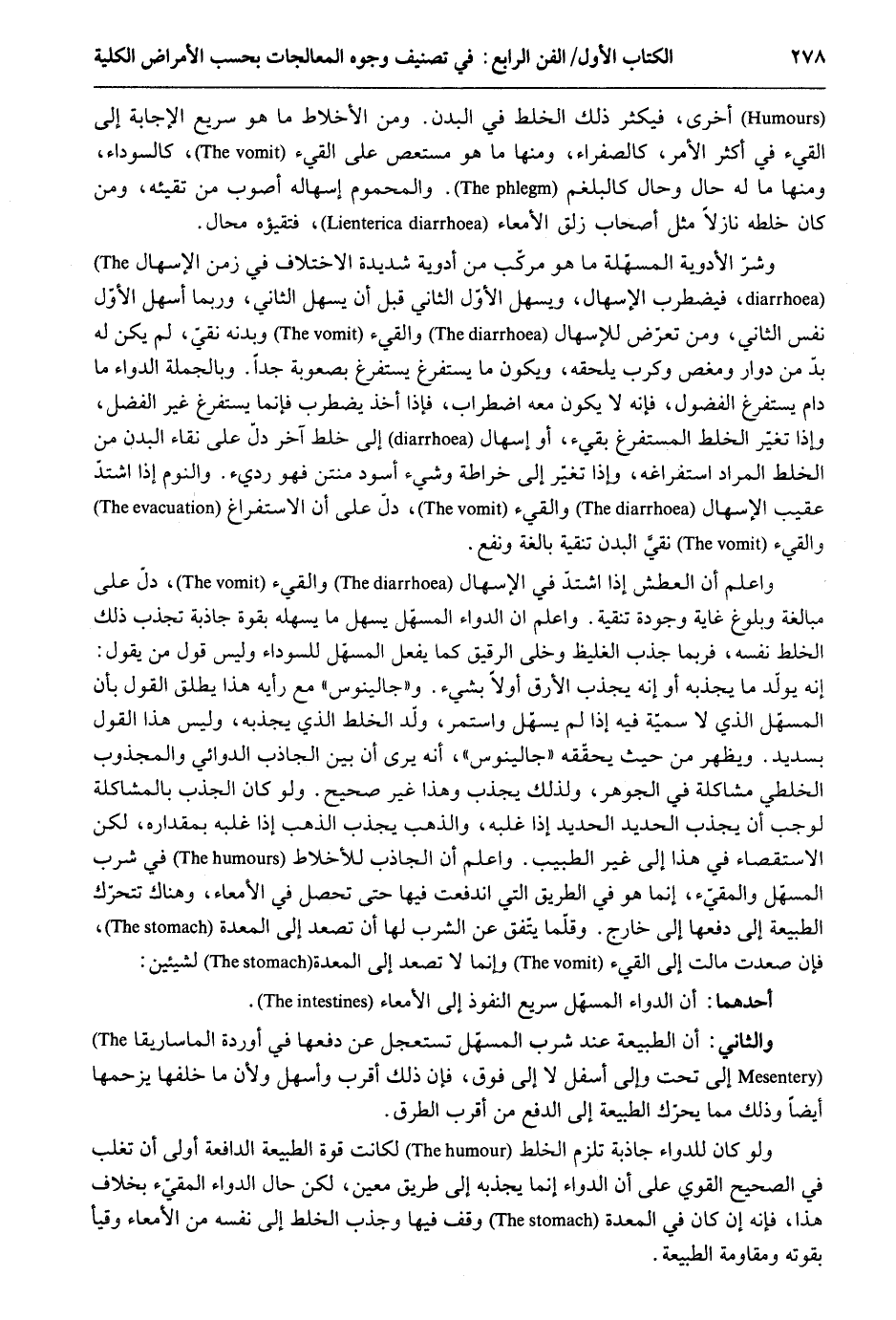 أُخْرَى فيكثر ذَلِك الْخَلْط فِي الْبدن. وَمن الأخلاط مَا هُوَ سريع الْإِجَابَة إِلَى الْقَيْء فِي أَكثر الْأَمر كالصفراء وَمِنْهَا مَا هُوَ مستعص على الْقَيْء كالسوداء وَمِنْهَا مَا لَهُ حَال وَحَال كالبلغم. والمحموم إسهاله أصوب من تقيئه وَمن كَانَ خلطه نازلاً مثل أَصْحَاب زلق الأمعاء فتقيؤه محَال. وَشر الْأَدْوِيَة المسهلة مَا هُوَ مركب من أدوية شَدِيدَة الِاخْتِلَاف فِي زمن الإسهال فيضطرب الإسهال ويسهل الأول الثَّانِي قبل أَن يسهل الثَّانِي وَرُبمَا أسهل الأول نفس الثَّانِي وَمن تعرّض للإسهال والقيء وبدنه نقي لم يكن لَهُ بُد من دوار ومغص وكرب يلْحقهُ وَيكون مَا يستفرغ يستفرغ بصعوبة جدا. وَبِالْجُمْلَةِ الدَّوَاء مَا دَامَ يستفرغ الفضول فَإِنَّهُ لَا يكون مَعَه اضْطِرَاب فَإِذا أَخذ يضطرب فَإِنَّمَا يستفرغ غير الْفضل وَإِذا تغير الْخَلْط المستفرغ بقيء أَو إسهال إِلَى خلط اخر دلّ على نقاء الْبدن من الْخَلْط المُرَاد استفراغه وَإِذا تغير إِلَى خراطة وَشَيْء أسود منتن فَهُوَ رَدِيء. وَالنَّوْم إِذا اشتدّ عقيب الإسهال والقيء دلّ على أَن الاستفراغ والقيء نقي الْبدن تنقية بَالِغَة ونفع. وَاعْلَم أَن الْعَطش إِذا اشْتَدَّ فِي الاسهال والقيء دلّ على مُبَالغَة وبلوغ غَايَة وجودة تنقية. وَاعْلَم ان الدَّوَاء المسهل يسهل مَا يسهله بِقُوَّة جاذبة تجنب ذَلِك الْخَلْط نَفسه فَرُبمَا جذب الغليظ وخلى الرَّقِيق كَمَا يفعل المسهل للسوداء وَلَيْسَ قَول من يَقُول: إِنَّه يُولد مَا يجذبه أَو أَنه يجذب الأرق أَولا بِشَيْء. وجالينوس مَعَ رَأْيه هَذَا يُطلق القَوْل بِأَن المسهّل الَّذِي لَا سميَّة فِيهِ إِذا لم يسهّل وَاسْتمرّ ولد الْخَلْط الَّذِي يجذبه وَلَيْسَ هَذَا القَوْل بسديد. وَيظْهر من حَيْثُ يحققه جالينوس أَنه يرى أَن بَين الجاذب الدوائي والمجذوب الخلطي مشاكلة فِي الْجَوْهَر وَلذَلِك يجذب وَهَذَا غير صَحِيح. وَلَو كَانَ الْجنب بالمشاكلة لوَجَبَ أَن يجذب الْحَدِيد الْحَدِيد إِذا غَلبه وَالذَّهَب يجذب الذَّهَب إِذا كَلْبه بمقداره لَكِن الِاسْتِقْصَاء فِي هَذَا إِلَى غير الطَّبِيب. وَاعْلَم أَن الجاذب للأخلاط فِي شرب المسهّل والمقيّء إِنَّمَا هُوَ فِي الطَّرِيق الَّتِي اندفعت فِيهَا حَتَّى تحصل فِي الأمعاء وَهُنَاكَ تتحرّك الطبيعة إِلَى دَفعهَا إِلَى خَارج. وقلما يتّفق عَن الشّرْب لَهَا أَن تصعد إِلَى الْمعدة فَإِن صعدت مَالَتْ إِلَى الْقَيْء وَإِنَّمَا لَا تصعد إِلَى الْمعدة لشيئين: أَحدهمَا: أَن الدَّوَاء المسهل سريع النفود إِلَى الأمعاء. وَالثَّانِي: أَن الطبيعة عِنْد شرب المسهّل تستعجل عَن دَفعهَا فِي أوردة الماساريقا إِلَى تَحت وَإِلَى أَسْفَل لَا إِلَى فَوق فَإِن ذَلِك أقرب وأسهل ولان مَا خلفهَا يزحمها أَيْضا وَذَلِكَ مِمَّا يحرّك الطبيعة إِلَى الدّفع من أقرب الطّرق. وَلَو كَانَ للدواء جاذبة تلْزم الْخَلْط لكَانَتْ قُوَّة الطبيعة الدافعة أولى أَن تغلب فِي الصَّحِيح الْقوي على أَن الدَّوَاء إِنَّمَا يجذبه إِلَى طَرِيق معِين لَكِن حَال الدَّوَاء المقيء بِخِلَاف هَذَا فَإِنَّهُ إِن كَانَ فِي الْمعدة وقف فِيهَا وجذب الْخَلْط إِلَى نَفسه من الأمعاء وقيأ بقوته ومقاومة الطبيعة.