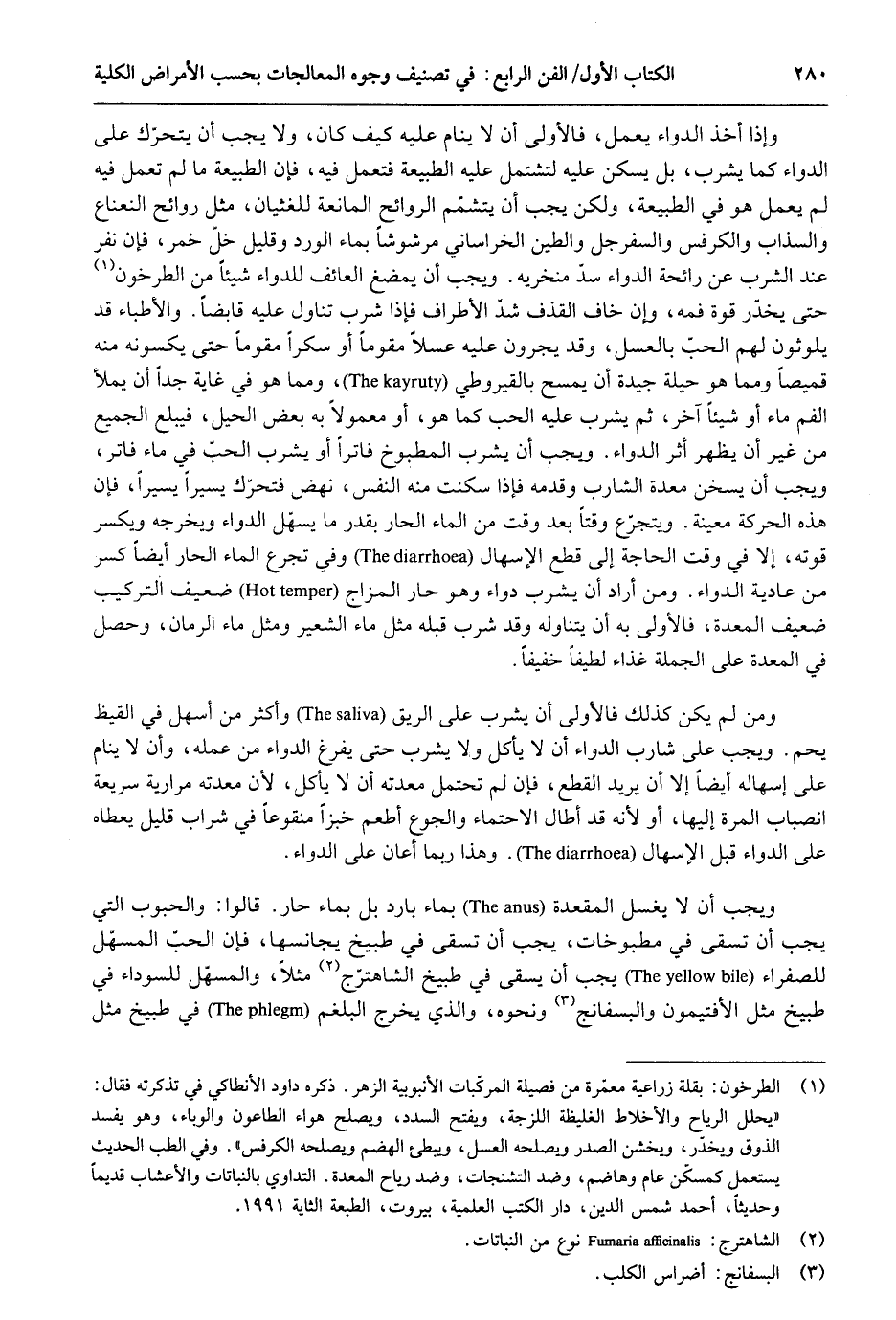 وَإِذا أَخذ الدَّوَاء يعْمل فَالْأولى أَن لَا ينَام عَلَيْهِ كَيفَ كَانَ وَلَا يجب أَن يَتَحَرَّك على الدَّوَاء كَمَا يشرب بل يسكن عَلَيْهِ لتشتمل عَلَيْهِ الطبيعة فتعمل فِيهِ فَإِن الطبيعة مَا لم تعْمل فِيهِ لم يعْمل هُوَ فِي الطبيعة وَلَكِن يجب أَن يتشمم الروائح الْمَانِعَة للغثيان مثل رَوَائِح النعناع والسذاب والكرفس والسفرجل والطين الْخُرَاسَانِي مرشوشاً بِمَاء الْورْد وَقَلِيل خل خمر فَإِن نفر عِنْد الشّرْب عَن رَائِحَة الدَّوَاء سد مَنْخرَيْهِ. وَيجب أَن يمضغ العائف للدواء شَيْئا من الطرخون حَتَّى يخدر قُوَّة فَمه وَإِن خَافَ الْقَذْف شدّ الْأَطْرَاف فَإِذا شرب تنَاول عَلَيْهِ قَابِضا. والأطباء قد يلوثون لَهُم الْحبّ بالعسل وَقد يجرونَ عَلَيْهِ عسلاً مُقَومًا أَو سكرا مُقَومًا حَتَّى يكسونه مِنْهُ قَمِيصًا وَمِمَّا هُوَ حِيلَة جَيِّدَة أَن يمسح بالقيروطي وَمِمَّا هُوَ فِي غَايَة جدا أَن يمْلَأ الْفَم مَاء أَو شَيْئا آخر ثمَّ يشرب عَلَيْهِ الْحبّ كَمَا هُوَ أَو مَعْمُولا بِهِ بعض الْحِيَل فَيبلغ الْجَمِيع من غير أَن يظْهر أثر الدَّوَاء. وَيجب أَن يشرب الْمَطْبُوخ فاتراً أَو يشرب الْحبّ فِي مَاء فاتر وَيجب أَن يسخن معدة الشَّارِب وَقدمه فَإِذا سكنت مِنْهُ النَّفس نَهَضَ فَتحَرك يَسِيرا يَسِيرا فَإِن هَذِه الْحَرَكَة مُعينَة. ويتجرع وقتا بعد وَقت من المَاء الْحَار بِقدر مَا يسهّل الدَّوَاء ويخرجه وَيكسر قوته إِلَّا فِي وَقت الْحَاجة إِلَى قطع الإسهال وَفِي تجرع المَاء الْحَار أَيْضا كسر من عَادِية الدَّوَاء. وَمن أَرَادَ أَن يشرب دَوَاء وَهُوَ حَار المزاج ضَعِيف التَّرْكِيب ضَعِيف الْمعدة فَالْأولى بِهِ أَن يتَنَاوَلهُ وَقد شرب قبله مثل مَاء الشّعير وَمثل مَاء الرُّمَّان وَحصل فِي الْمعدة على الْجُمْلَة غذَاء لطيفاً خَفِيفا. وَمن لم يكن كَذَلِك فَالْأولى أَن يشرب على الرِّيق وَأكْثر من أسهل فِي القيظ يحم. وَيجب على شَارِب الدَّوَاء أَن لَا يَأْكُل وَلَا يشرب حَتَّى يفرغ الدَّوَاء من عمله وَأَن لَا ينَام على إسهاله أَيْضا إِلَّا أَن يُرِيد الْقطع فَإِن لم تحْتَمل معدته أَن لَا يَأْكُل لِأَن معدته مرارية سريعة انصباب الْمرة إِلَيْهَا أَو لِأَنَّهُ قد أَطَالَ الاحتماء والجوع أطْعم خبْزًا منقوعاً فِي شراب قَلِيل يعطاه على الدَّوَاء قبل الاسهال. وَهَذَا رُبمَا أعَان على الدَّوَاء. وَيجب أَن لَا يغسل المقعدة بِمَاء بَارِد بل بِمَاء حَار. قَالُوا: والحبوب الَّتِي يجب أَن تسقى فِي مطبوخات يجب أَن تسقى فِي طبيخ يجانسها فَإِن الْحبّ المسهّل للصفراء يجب أَن يسقى فِي طبيخ الشاهترج مثلا والمسهل للسوداء فِي طبيخ مثل الأفتيمون والبسفانج وَنَحْوه وَالَّذِي يخرج البلغم فِي طبيخ مثل