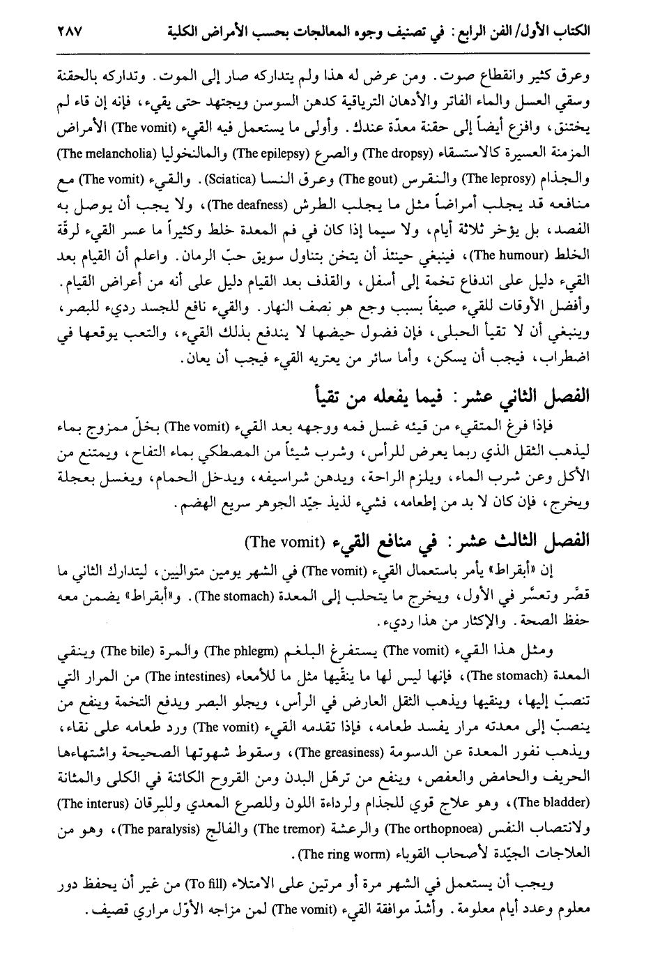 وعرق كثير وَانْقِطَاع صَوت. وَمن عرض لَهُ هَذَا وَلم يتداركه صَار إِلَى الْمَوْت. وتداركه بالحقنة وَسقي الْعَسَل وَالْمَاء الفاتر والأدهان الترياقية كدهن السوسن ويجتهد حَتَّى يقيء فَإِنَّهُ إِن قاء لم يختنق وافزع أَيْضا إِلَى حقنة معدة عنْدك. وَأولى مَا يسْتَعْمل فِيهِ الْقَيْء الْأَمْرَاض المزمنة العسيرة كالاستسقاء والصرع والمالنخوليا والجذام والنقرس وعرق النسا. والقيء مَعَ مَنَافِعه قد يجلب أمراضاً مثل مَا يجلب الطرش وَلَا يجب أَن يُوصل بِهِ الفصد بل يُؤَخر ثَلَاثَة أَيَّام وَلَا سِيمَا إِذا كَانَ فِي فَم الْمعدة خلط وَكَثِيرًا مَا عسر الْقَيْء لرقة الْخَلْط فَيَنْبَغِي حِينَئِذٍ أَن يثخن بتناول سويق حب الرُّمَّان. وَاعْلَم أَن الْقيام بعد الْقَيْء دَلِيل على اندفاع تخمة إِلَى أَسْفَل وَالْقَذْف بعد الْقيام دَلِيل على أَنه من أَعْرَاض الْقيام. وَأفضل الْأَوْقَات للقيء صيفاً بِسَبَب وجع هُوَ نصف النَّهَار. والقيء نَافِع للجسد رَدِيء لِلْبَصَرِ وَيَنْبَغِي أَن لَا تقيأ الحبلى فَإِن فضول حَيْضهَا لَا ينْدَفع بذلك الْقَيْء والتعب يوقعها فِي اضْطِرَاب فَيجب أَن يسكن وَأما سَاتِر من يَعْتَرِيه الْقَيْء فَيجب أَن يعان. الْفَصْل الْحَادِي عشر فِيمَا يَفْعَله من تقيأ فَإِذا فرغ المتقيء من قيه غسل فَمه وَوَجهه بعد الْقَيْء بخل ممزوج بِمَاء ليذْهب الثّقل الَّذِي رُبمَا يعرض للرأس وَشرب شَيْئا من المصطكى بِمَاء التفاح وَيمْتَنع من الْآكِل وَعَن شرب المَاء وَيلْزم الرَّاحَة ويدهن شراسيفه وَيدخل الْحمام وَيغسل بعجلة وَيخرج فَإِن كَانَ لَا بُد من إطعامه فشيء لذيذ جيّد الجوهرسريع الهضم. الْفَصْل الثَّانِي عشر مَنَافِع الْقَيْء إِن أبقراط يَأْمر بِاسْتِعْمَال الْقَيْء فِي الشَّهْر يَوْمَيْنِ متواليين ليتدارك الثَّانِي مَا قصر وتعسر فِي الأول وَيخرج مَا يتحلب إِلَى الْمعدة. وأبقراط يضمن مَعَه حفظ الصِّحَّة. والإكثار من هَذَا رَدِيء. وَمثل هَذَا الْقَيْء يستفرغ البلغم والمرة وينقي الْمعدة فَإِنَّهَا لَيْسَ لَهَا مَا ينقيها مثل مَا للأمعاء من المرار الَّتِي تنصبّ إِلَيْهَا وينقيها وَيذْهب الثّقل الْعَارِض فِي الرَّأْس ويجلو الْبَصَر وَيدْفَع التُّخمَة وينفع من ينصبّ إِلَى معدته مرار يفْسد طَعَامه فَإِذا تقدمه الْقَيْء ورد طَعَامه على نقاء وَيذْهب نفور الْمعدة عَن الدسومة وَسُقُوط شهوتها الصَّحِيحَة واشتهاءها الحريف والحامض والعفص وينفع من ترهل الْبدن وَمن القروح الكائنة فِي الْكُلِّي والمثانة وَهُوَ علاج قوي للجذام ولرداءة اللَّوْن وللصرع المعدي ولليرقان ولانتصاب النَّفس والرعشة والفالج وَهُوَ من العلاجات الجيّدة لأَصْحَاب القوباء. وَيجب أَن يسْتَعْمل فِي الشَّهْر مرّة أَو مرَّتَيْنِ على الامتلاء من غير أَن يحفظ دور مَعْلُوم وَعدد أَيَّام مَعْلُومَة. وَأَشد مُوَافقَة الْقَيْء لمن مزاجه الأوّل مراري قصيف.